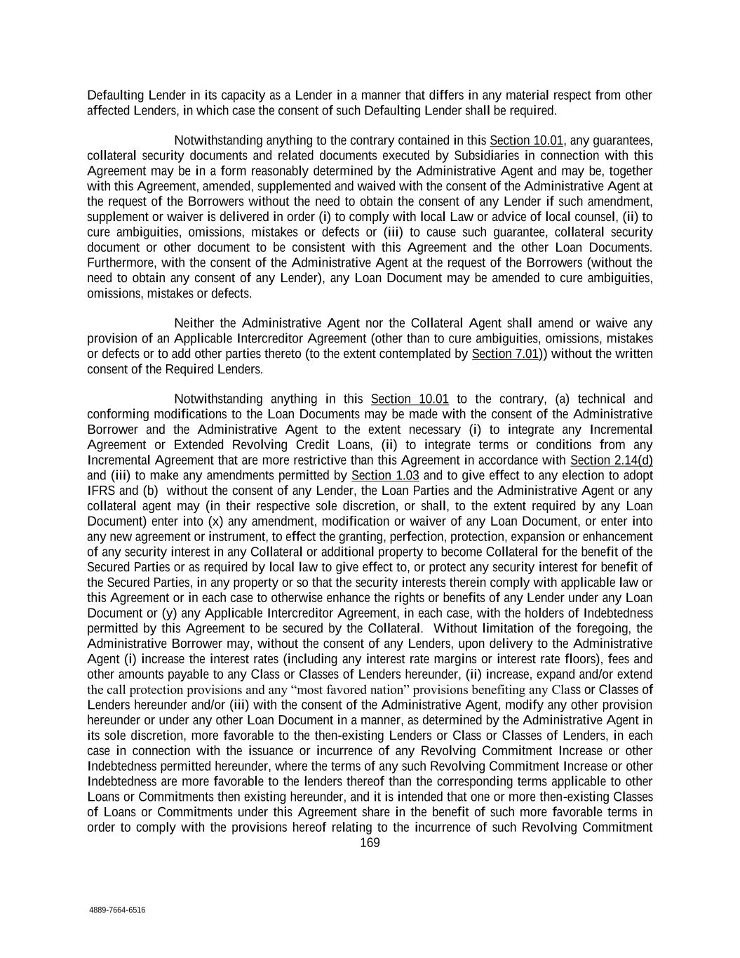 169 4889-7664-6516 Defaulting Lender in its capacity as a Lender in a manner that differs in any material respect from other affected Lenders, in which case the consent of such Defaulting Lender shall be required. Notwithstanding anything to the contrary contained in this Section 10.01, any guarantees, collateral security documents and related documents executed by Subsidiaries in connection with this Agreement may be in a form reasonably determined by the Administrative Agent and may be, together with this Agreement, amended, supplemented and waived with the consent of the Administrative Agent at the request of the Borrowers without the need to obtain the consent of any Lender if such amendment, supplement or waiver is delivered in order (i) to comply with local Law or advice of local counsel, (ii) to cure ambiguities, omissions, mistakes or defects or (iii) to cause such guarantee, collateral security document or other document to be consistent with this Agreement and the other Loan Documents. Furthermore, with the consent of the Administrative Agent at the request of the Borrowers (without the need to obtain any consent of any Lender), any Loan Document may be amended to cure ambiguities, omissions, mistakes or defects. Neither the Administrative Agent nor the Collateral Agent shall amend or waive any provision of an Applicable Intercreditor Agreement (other than to cure ambiguities, omissions, mistakes or defects or to add other parties thereto (to the extent contemplated by Section 7.01)) without the written consent of the Required Lenders. Notwithstanding anything in this Section 10.01 to the contrary, (a) technical and conforming modifications to the Loan Documents may be made with the consent of the Administrative Borrower and the Administrative Agent to the extent necessary (i) to integrate any Incremental Agreement or Extended Revolving Credit Loans, (ii) to integrate terms or conditions from any Incremental Agreement that are more restrictive than this Agreement in accordance with Section 2.14(d) and (iii) to make any amendments permitted by Section 1.03 and to give effect to any election to adopt IFRS and (b) without the consent of any Lender, the Loan Parties and the Administrative Agent or any collateral agent may (in their respective sole discretion, or shall, to the extent required by any Loan Document) enter into (x) any amendment, modification or waiver of any Loan Document, or enter into any new agreement or instrument, to effect the granting, perfection, protection, expansion or enhancement of any security interest in any Collateral or additional property to become Collateral for the benefit of the Secured Parties or as required by local law to give effect to, or protect any security interest for benefit of the Secured Parties, in any property or so that the security interests therein comply with applicable law or this Agreement or in each case to otherwise enhance the rights or benefits of any Lender under any Loan Document or (y) any Applicable Intercreditor Agreement, in each case, with the holders of Indebtedness permitted by this Agreement to be secured by the Collateral. Without limitation of the foregoing, the Administrative Borrower may, without the consent of any Lenders, upon delivery to the Administrative Agent (i) increase the interest rates (including any interest rate margins or interest rate floors), fees and other amounts payable to any Class or Classes of Lenders hereunder, (ii) increase, expand and/or extend the call protection provisions and any “most favored nation” provisions benefiting any Class or Classes of Lenders hereunder and/or (iii) with the consent of the Administrative Agent, modify any other provision hereunder or under any other Loan Document in a manner, as determined by the Administrative Agent in its sole discretion, more favorable to the then-existing Lenders or Class or Classes of Lenders, in each case in connection with the issuance or incurrence of any Revolving Commitment Increase or other Indebtedness permitted hereunder, where the terms of any such Revolving Commitment Increase or other Indebtedness are more favorable to the lenders thereof than the corresponding terms applicable to other Loans or Commitments then existing hereunder, and it is intended that one or more then-existing Classes of Loans or Commitments under this Agreement share in the benefit of such more favorable terms in order to comply with the provisions hereof relating to the incurrence of such Revolving Commitment