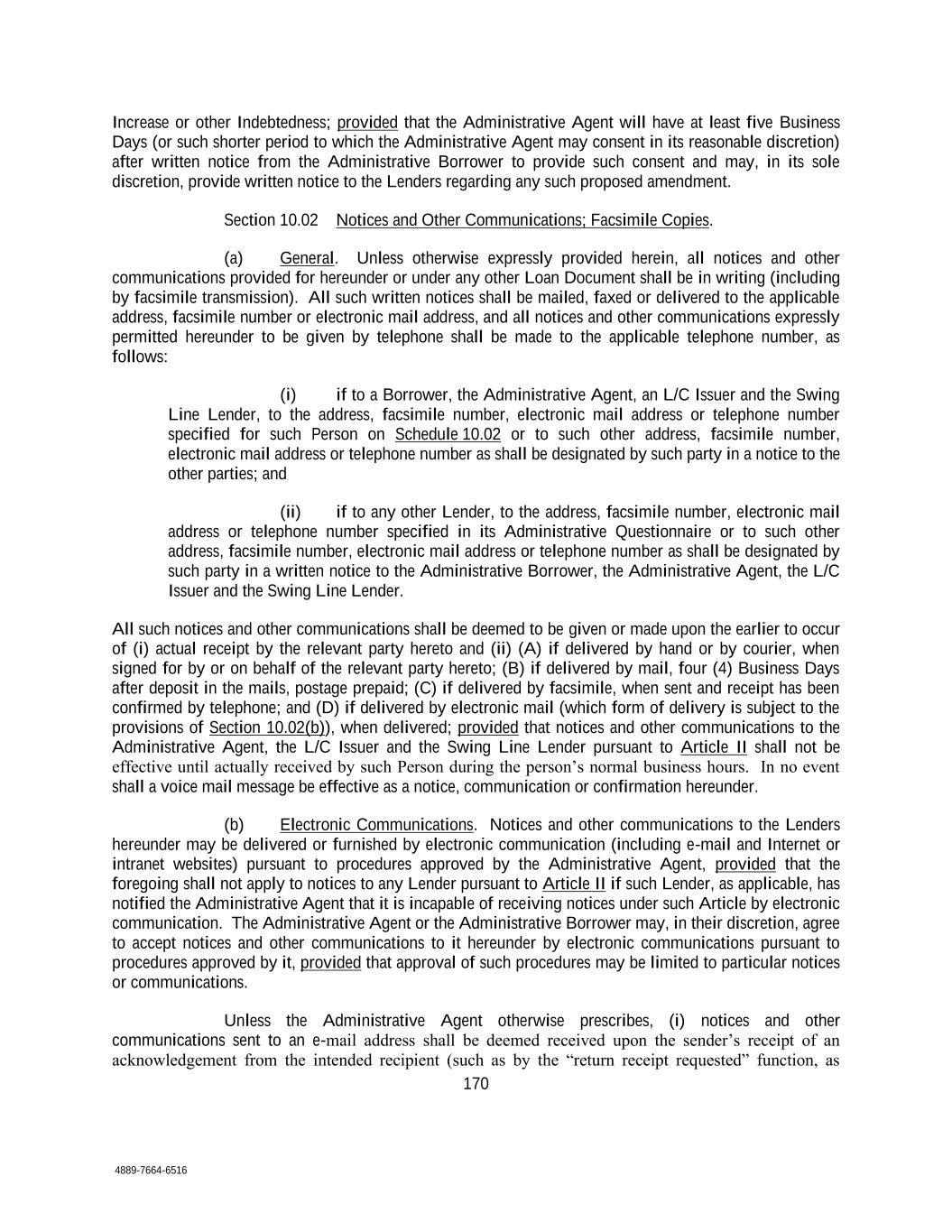 170 4889-7664-6516 Increase or other Indebtedness; provided that the Administrative Agent will have at least five Business Days (or such shorter period to which the Administrative Agent may consent in its reasonable discretion) after written notice from the Administrative Borrower to provide such consent and may, in its sole discretion, provide written notice to the Lenders regarding any such proposed amendment. Section 10.02 Notices and Other Communications; Facsimile Copies. (a) General. Unless otherwise expressly provided herein, all notices and other communications provided for hereunder or under any other Loan Document shall be in writing (including by facsimile transmission). All such written notices shall be mailed, faxed or delivered to the applicable address, facsimile number or electronic mail address, and all notices and other communications expressly permitted hereunder to be given by telephone shall be made to the applicable telephone number, as follows: (i) if to a Borrower, the Administrative Agent, an L/C Issuer and the Swing Line Lender, to the address, facsimile number, electronic mail address or telephone number specified for such Person on Schedule 10.02 or to such other address, facsimile number, electronic mail address or telephone number as shall be designated by such party in a notice to the other parties; and (ii) if to any other Lender, to the address, facsimile number, electronic mail address or telephone number specified in its Administrative Questionnaire or to such other address, facsimile number, electronic mail address or telephone number as shall be designated by such party in a written notice to the Administrative Borrower, the Administrative Agent, the L/C Issuer and the Swing Line Lender. All such notices and other communications shall be deemed to be given or made upon the earlier to occur of (i) actual receipt by the relevant party hereto and (ii) (A) if delivered by hand or by courier, when signed for by or on behalf of the relevant party hereto; (B) if delivered by mail, four (4) Business Days after deposit in the mails, postage prepaid; (C) if delivered by facsimile, when sent and receipt has been confirmed by telephone; and (D) if delivered by electronic mail (which form of delivery is subject to the provisions of Section 10.02(b)), when delivered; provided that notices and other communications to the Administrative Agent, the L/C Issuer and the Swing Line Lender pursuant to Article II shall not be effective until actually received by such Person during the person’s normal business hours. In no event shall a voice mail message be effective as a notice, communication or confirmation hereunder. (b) Electronic Communications. Notices and other communications to the Lenders hereunder may be delivered or furnished by electronic communication (including e-mail and Internet or intranet websites) pursuant to procedures approved by the Administrative Agent, provided that the foregoing shall not apply to notices to any Lender pursuant to Article II if such Lender, as applicable, has notified the Administrative Agent that it is incapable of receiving notices under such Article by electronic communication. The Administrative Agent or the Administrative Borrower may, in their discretion, agree to accept notices and other communications to it hereunder by electronic communications pursuant to procedures approved by it, provided that approval of such procedures may be limited to particular notices or communications. Unless the Administrative Agent otherwise prescribes, (i) notices and other communications sent to an e-mail address shall be deemed received upon the sender’s receipt of an acknowledgement from the intended recipient (such as by the “return receipt requested” function, as