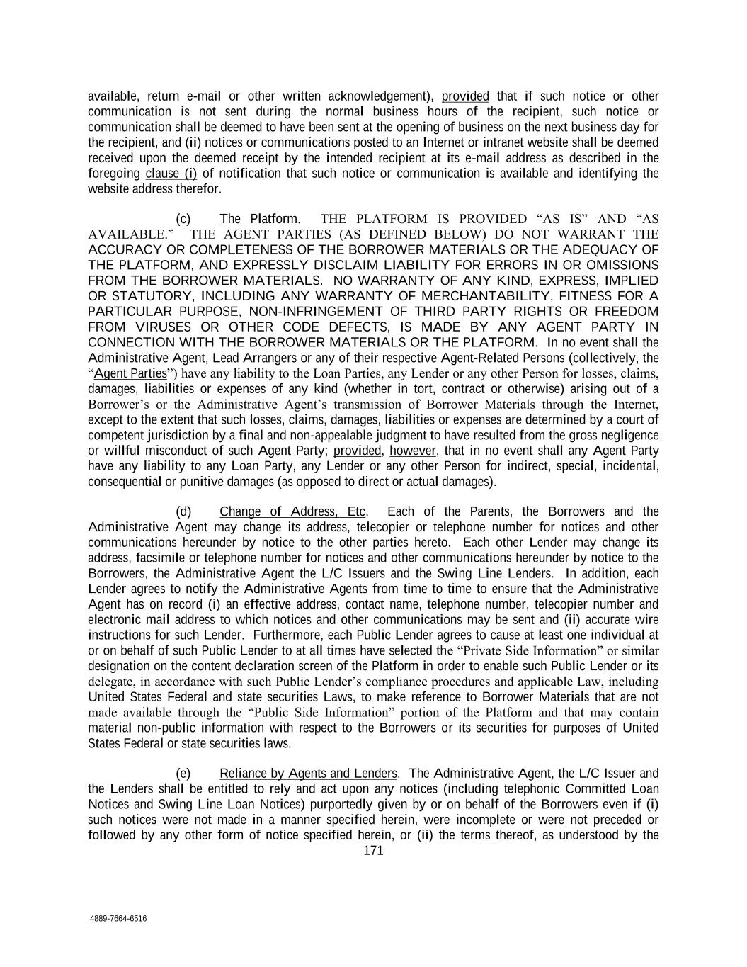 171 4889-7664-6516 available, return e-mail or other written acknowledgement), provided that if such notice or other communication is not sent during the normal business hours of the recipient, such notice or communication shall be deemed to have been sent at the opening of business on the next business day for the recipient, and (ii) notices or communications posted to an Internet or intranet website shall be deemed received upon the deemed receipt by the intended recipient at its e-mail address as described in the foregoing clause (i) of notification that such notice or communication is available and identifying the website address therefor. (c) The Platform. THE PLATFORM IS PROVIDED “AS IS” AND “AS AVAILABLE.” THE AGENT PARTIES (AS DEFINED BELOW) DO NOT WARRANT THE ACCURACY OR COMPLETENESS OF THE BORROWER MATERIALS OR THE ADEQUACY OF THE PLATFORM, AND EXPRESSLY DISCLAIM LIABILITY FOR ERRORS IN OR OMISSIONS FROM THE BORROWER MATERIALS. NO WARRANTY OF ANY KIND, EXPRESS, IMPLIED OR STATUTORY, INCLUDING ANY WARRANTY OF MERCHANTABILITY, FITNESS FOR A PARTICULAR PURPOSE, NON-INFRINGEMENT OF THIRD PARTY RIGHTS OR FREEDOM FROM VIRUSES OR OTHER CODE DEFECTS, IS MADE BY ANY AGENT PARTY IN CONNECTION WITH THE BORROWER MATERIALS OR THE PLATFORM. In no event shall the Administrative Agent, Lead Arrangers or any of their respective Agent-Related Persons (collectively, the “Agent Parties”) have any liability to the Loan Parties, any Lender or any other Person for losses, claims, damages, liabilities or expenses of any kind (whether in tort, contract or otherwise) arising out of a Borrower’s or the Administrative Agent’s transmission of Borrower Materials through the Internet, except to the extent that such losses, claims, damages, liabilities or expenses are determined by a court of competent jurisdiction by a final and non-appealable judgment to have resulted from the gross negligence or willful misconduct of such Agent Party; provided, however, that in no event shall any Agent Party have any liability to any Loan Party, any Lender or any other Person for indirect, special, incidental, consequential or punitive damages (as opposed to direct or actual damages). (d) Change of Address, Etc. Each of the Parents, the Borrowers and the Administrative Agent may change its address, telecopier or telephone number for notices and other communications hereunder by notice to the other parties hereto. Each other Lender may change its address, facsimile or telephone number for notices and other communications hereunder by notice to the Borrowers, the Administrative Agent the L/C Issuers and the Swing Line Lenders. In addition, each Lender agrees to notify the Administrative Agents from time to time to ensure that the Administrative Agent has on record (i) an effective address, contact name, telephone number, telecopier number and electronic mail address to which notices and other communications may be sent and (ii) accurate wire instructions for such Lender. Furthermore, each Public Lender agrees to cause at least one individual at or on behalf of such Public Lender to at all times have selected the “Private Side Information” or similar designation on the content declaration screen of the Platform in order to enable such Public Lender or its delegate, in accordance with such Public Lender’s compliance procedures and applicable Law, including United States Federal and state securities Laws, to make reference to Borrower Materials that are not made available through the “Public Side Information” portion of the Platform and that may contain material non-public information with respect to the Borrowers or its securities for purposes of United States Federal or state securities laws. (e) Reliance by Agents and Lenders. The Administrative Agent, the L/C Issuer and the Lenders shall be entitled to rely and act upon any notices (including telephonic Committed Loan Notices and Swing Line Loan Notices) purportedly given by or on behalf of the Borrowers even if (i) such notices were not made in a manner specified herein, were incomplete or were not preceded or followed by any other form of notice specified herein, or (ii) the terms thereof, as understood by the
