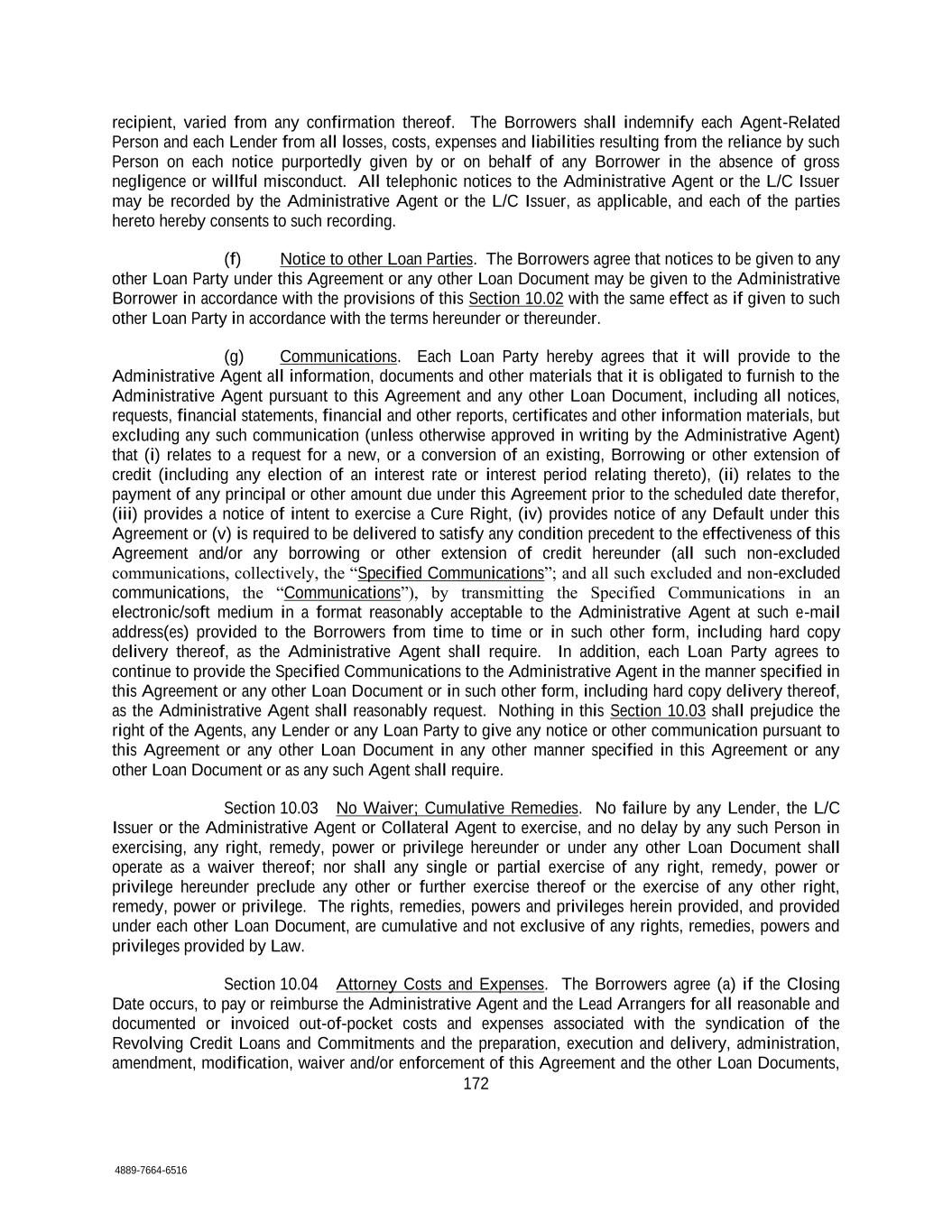 172 4889-7664-6516 recipient, varied from any confirmation thereof. The Borrowers shall indemnify each Agent-Related Person and each Lender from all losses, costs, expenses and liabilities resulting from the reliance by such Person on each notice purportedly given by or on behalf of any Borrower in the absence of gross negligence or willful misconduct. All telephonic notices to the Administrative Agent or the L/C Issuer may be recorded by the Administrative Agent or the L/C Issuer, as applicable, and each of the parties hereto hereby consents to such recording. (f) Notice to other Loan Parties. The Borrowers agree that notices to be given to any other Loan Party under this Agreement or any other Loan Document may be given to the Administrative Borrower in accordance with the provisions of this Section 10.02 with the same effect as if given to such other Loan Party in accordance with the terms hereunder or thereunder. (g) Communications. Each Loan Party hereby agrees that it will provide to the Administrative Agent all information, documents and other materials that it is obligated to furnish to the Administrative Agent pursuant to this Agreement and any other Loan Document, including all notices, requests, financial statements, financial and other reports, certificates and other information materials, but excluding any such communication (unless otherwise approved in writing by the Administrative Agent) that (i) relates to a request for a new, or a conversion of an existing, Borrowing or other extension of credit (including any election of an interest rate or interest period relating thereto), (ii) relates to the payment of any principal or other amount due under this Agreement prior to the scheduled date therefor, (iii) provides a notice of intent to exercise a Cure Right, (iv) provides notice of any Default under this Agreement or (v) is required to be delivered to satisfy any condition precedent to the effectiveness of this Agreement and/or any borrowing or other extension of credit hereunder (all such non-excluded communications, collectively, the “Specified Communications”; and all such excluded and non-excluded communications, the “Communications”), by transmitting the Specified Communications in an electronic/soft medium in a format reasonably acceptable to the Administrative Agent at such e-mail address(es) provided to the Borrowers from time to time or in such other form, including hard copy delivery thereof, as the Administrative Agent shall require. In addition, each Loan Party agrees to continue to provide the Specified Communications to the Administrative Agent in the manner specified in this Agreement or any other Loan Document or in such other form, including hard copy delivery thereof, as the Administrative Agent shall reasonably request. Nothing in this Section 10.03 shall prejudice the right of the Agents, any Lender or any Loan Party to give any notice or other communication pursuant to this Agreement or any other Loan Document in any other manner specified in this Agreement or any other Loan Document or as any such Agent shall require. Section 10.03 No Waiver; Cumulative Remedies. No failure by any Lender, the L/C Issuer or the Administrative Agent or Collateral Agent to exercise, and no delay by any such Person in exercising, any right, remedy, power or privilege hereunder or under any other Loan Document shall operate as a waiver thereof; nor shall any single or partial exercise of any right, remedy, power or privilege hereunder preclude any other or further exercise thereof or the exercise of any other right, remedy, power or privilege. The rights, remedies, powers and privileges herein provided, and provided under each other Loan Document, are cumulative and not exclusive of any rights, remedies, powers and privileges provided by Law. Section 10.04 Attorney Costs and Expenses. The Borrowers agree (a) if the Closing Date occurs, to pay or reimburse the Administrative Agent and the Lead Arrangers for all reasonable and documented or invoiced out-of-pocket costs and expenses associated with the syndication of the Revolving Credit Loans and Commitments and the preparation, execution and delivery, administration, amendment, modification, waiver and/or enforcement of this Agreement and the other Loan Documents,