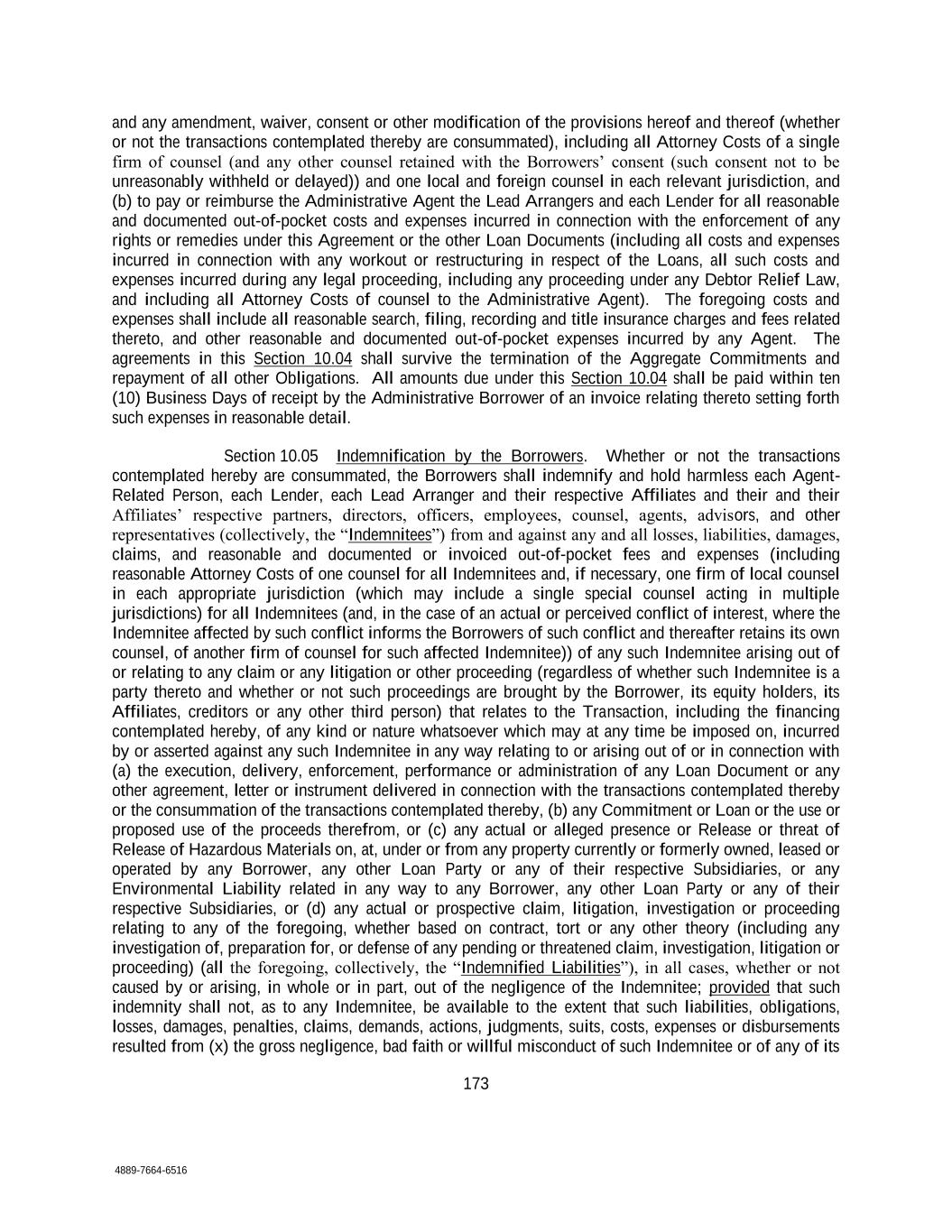173 4889-7664-6516 and any amendment, waiver, consent or other modification of the provisions hereof and thereof (whether or not the transactions contemplated thereby are consummated), including all Attorney Costs of a single firm of counsel (and any other counsel retained with the Borrowers’ consent (such consent not to be unreasonably withheld or delayed)) and one local and foreign counsel in each relevant jurisdiction, and (b) to pay or reimburse the Administrative Agent the Lead Arrangers and each Lender for all reasonable and documented out-of-pocket costs and expenses incurred in connection with the enforcement of any rights or remedies under this Agreement or the other Loan Documents (including all costs and expenses incurred in connection with any workout or restructuring in respect of the Loans, all such costs and expenses incurred during any legal proceeding, including any proceeding under any Debtor Relief Law, and including all Attorney Costs of counsel to the Administrative Agent). The foregoing costs and expenses shall include all reasonable search, filing, recording and title insurance charges and fees related thereto, and other reasonable and documented out-of-pocket expenses incurred by any Agent. The agreements in this Section 10.04 shall survive the termination of the Aggregate Commitments and repayment of all other Obligations. All amounts due under this Section 10.04 shall be paid within ten (10) Business Days of receipt by the Administrative Borrower of an invoice relating thereto setting forth such expenses in reasonable detail. Section 10.05 Indemnification by the Borrowers. Whether or not the transactions contemplated hereby are consummated, the Borrowers shall indemnify and hold harmless each Agent- Related Person, each Lender, each Lead Arranger and their respective Affiliates and their and their Affiliates’ respective partners, directors, officers, employees, counsel, agents, advisors, and other representatives (collectively, the “Indemnitees”) from and against any and all losses, liabilities, damages, claims, and reasonable and documented or invoiced out-of-pocket fees and expenses (including reasonable Attorney Costs of one counsel for all Indemnitees and, if necessary, one firm of local counsel in each appropriate jurisdiction (which may include a single special counsel acting in multiple jurisdictions) for all Indemnitees (and, in the case of an actual or perceived conflict of interest, where the Indemnitee affected by such conflict informs the Borrowers of such conflict and thereafter retains its own counsel, of another firm of counsel for such affected Indemnitee)) of any such Indemnitee arising out of or relating to any claim or any litigation or other proceeding (regardless of whether such Indemnitee is a party thereto and whether or not such proceedings are brought by the Borrower, its equity holders, its Affiliates, creditors or any other third person) that relates to the Transaction, including the financing contemplated hereby, of any kind or nature whatsoever which may at any time be imposed on, incurred by or asserted against any such Indemnitee in any way relating to or arising out of or in connection with (a) the execution, delivery, enforcement, performance or administration of any Loan Document or any other agreement, letter or instrument delivered in connection with the transactions contemplated thereby or the consummation of the transactions contemplated thereby, (b) any Commitment or Loan or the use or proposed use of the proceeds therefrom, or (c) any actual or alleged presence or Release or threat of Release of Hazardous Materials on, at, under or from any property currently or formerly owned, leased or operated by any Borrower, any other Loan Party or any of their respective Subsidiaries, or any Environmental Liability related in any way to any Borrower, any other Loan Party or any of their respective Subsidiaries, or (d) any actual or prospective claim, litigation, investigation or proceeding relating to any of the foregoing, whether based on contract, tort or any other theory (including any investigation of, preparation for, or defense of any pending or threatened claim, investigation, litigation or proceeding) (all the foregoing, collectively, the “Indemnified Liabilities”), in all cases, whether or not caused by or arising, in whole or in part, out of the negligence of the Indemnitee; provided that such indemnity shall not, as to any Indemnitee, be available to the extent that such liabilities, obligations, losses, damages, penalties, claims, demands, actions, judgments, suits, costs, expenses or disbursements resulted from (x) the gross negligence, bad faith or willful misconduct of such Indemnitee or of any of its