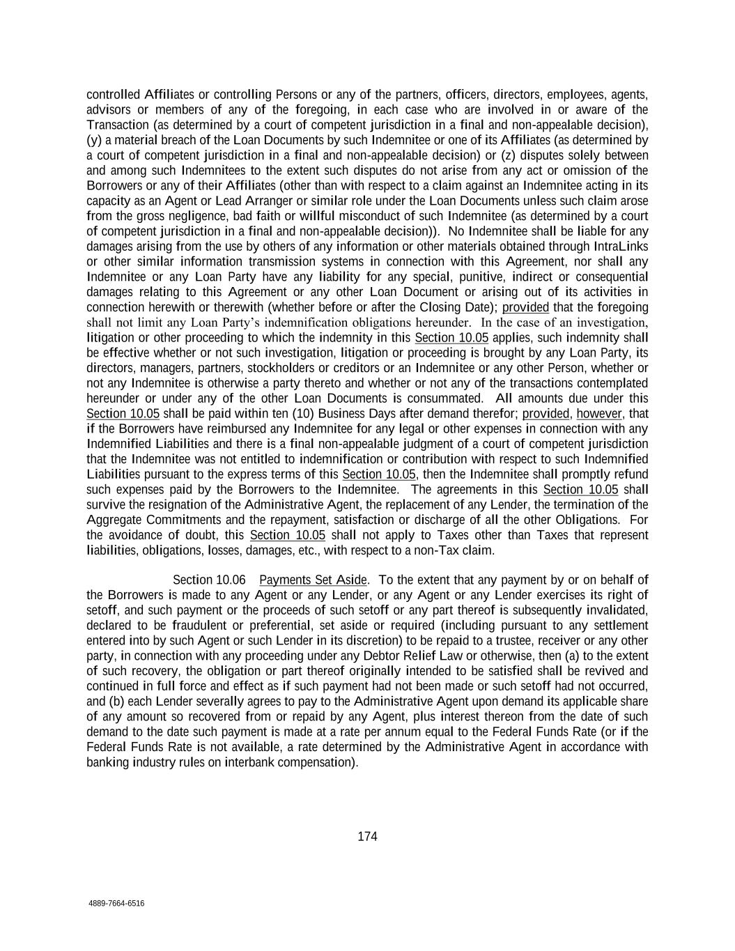 174 4889-7664-6516 controlled Affiliates or controlling Persons or any of the partners, officers, directors, employees, agents, advisors or members of any of the foregoing, in each case who are involved in or aware of the Transaction (as determined by a court of competent jurisdiction in a final and non-appealable decision), (y) a material breach of the Loan Documents by such Indemnitee or one of its Affiliates (as determined by a court of competent jurisdiction in a final and non-appealable decision) or (z) disputes solely between and among such Indemnitees to the extent such disputes do not arise from any act or omission of the Borrowers or any of their Affiliates (other than with respect to a claim against an Indemnitee acting in its capacity as an Agent or Lead Arranger or similar role under the Loan Documents unless such claim arose from the gross negligence, bad faith or willful misconduct of such Indemnitee (as determined by a court of competent jurisdiction in a final and non-appealable decision)). No Indemnitee shall be liable for any damages arising from the use by others of any information or other materials obtained through IntraLinks or other similar information transmission systems in connection with this Agreement, nor shall any Indemnitee or any Loan Party have any liability for any special, punitive, indirect or consequential damages relating to this Agreement or any other Loan Document or arising out of its activities in connection herewith or therewith (whether before or after the Closing Date); provided that the foregoing shall not limit any Loan Party’s indemnification obligations hereunder. In the case of an investigation, litigation or other proceeding to which the indemnity in this Section 10.05 applies, such indemnity shall be effective whether or not such investigation, litigation or proceeding is brought by any Loan Party, its directors, managers, partners, stockholders or creditors or an Indemnitee or any other Person, whether or not any Indemnitee is otherwise a party thereto and whether or not any of the transactions contemplated hereunder or under any of the other Loan Documents is consummated. All amounts due under this Section 10.05 shall be paid within ten (10) Business Days after demand therefor; provided, however, that if the Borrowers have reimbursed any Indemnitee for any legal or other expenses in connection with any Indemnified Liabilities and there is a final non-appealable judgment of a court of competent jurisdiction that the Indemnitee was not entitled to indemnification or contribution with respect to such Indemnified Liabilities pursuant to the express terms of this Section 10.05, then the Indemnitee shall promptly refund such expenses paid by the Borrowers to the Indemnitee. The agreements in this Section 10.05 shall survive the resignation of the Administrative Agent, the replacement of any Lender, the termination of the Aggregate Commitments and the repayment, satisfaction or discharge of all the other Obligations. For the avoidance of doubt, this Section 10.05 shall not apply to Taxes other than Taxes that represent liabilities, obligations, losses, damages, etc., with respect to a non-Tax claim. Section 10.06 Payments Set Aside. To the extent that any payment by or on behalf of the Borrowers is made to any Agent or any Lender, or any Agent or any Lender exercises its right of setoff, and such payment or the proceeds of such setoff or any part thereof is subsequently invalidated, declared to be fraudulent or preferential, set aside or required (including pursuant to any settlement entered into by such Agent or such Lender in its discretion) to be repaid to a trustee, receiver or any other party, in connection with any proceeding under any Debtor Relief Law or otherwise, then (a) to the extent of such recovery, the obligation or part thereof originally intended to be satisfied shall be revived and continued in full force and effect as if such payment had not been made or such setoff had not occurred, and (b) each Lender severally agrees to pay to the Administrative Agent upon demand its applicable share of any amount so recovered from or repaid by any Agent, plus interest thereon from the date of such demand to the date such payment is made at a rate per annum equal to the Federal Funds Rate (or if the Federal Funds Rate is not available, a rate determined by the Administrative Agent in accordance with banking industry rules on interbank compensation).