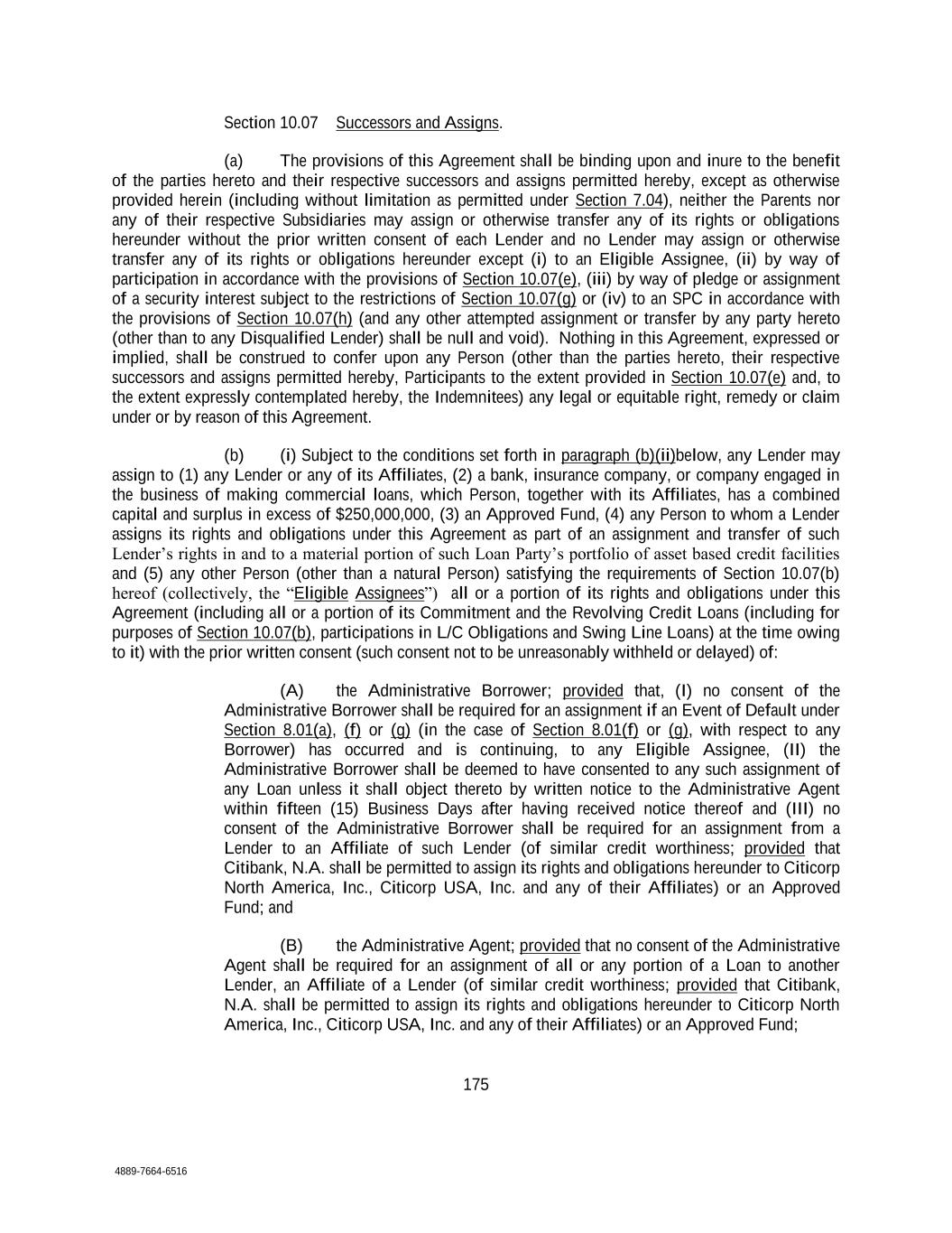 175 4889-7664-6516 Section 10.07 Successors and Assigns. (a) The provisions of this Agreement shall be binding upon and inure to the benefit of the parties hereto and their respective successors and assigns permitted hereby, except as otherwise provided herein (including without limitation as permitted under Section 7.04), neither the Parents nor any of their respective Subsidiaries may assign or otherwise transfer any of its rights or obligations hereunder without the prior written consent of each Lender and no Lender may assign or otherwise transfer any of its rights or obligations hereunder except (i) to an Eligible Assignee, (ii) by way of participation in accordance with the provisions of Section 10.07(e), (iii) by way of pledge or assignment of a security interest subject to the restrictions of Section 10.07(g) or (iv) to an SPC in accordance with the provisions of Section 10.07(h) (and any other attempted assignment or transfer by any party hereto (other than to any Disqualified Lender) shall be null and void). Nothing in this Agreement, expressed or implied, shall be construed to confer upon any Person (other than the parties hereto, their respective successors and assigns permitted hereby, Participants to the extent provided in Section 10.07(e) and, to the extent expressly contemplated hereby, the Indemnitees) any legal or equitable right, remedy or claim under or by reason of this Agreement. (b) (i) Subject to the conditions set forth in paragraph (b)(ii)below, any Lender may assign to (1) any Lender or any of its Affiliates, (2) a bank, insurance company, or company engaged in the business of making commercial loans, which Person, together with its Affiliates, has a combined capital and surplus in excess of $250,000,000, (3) an Approved Fund, (4) any Person to whom a Lender assigns its rights and obligations under this Agreement as part of an assignment and transfer of such Lender’s rights in and to a material portion of such Loan Party’s portfolio of asset based credit facilities and (5) any other Person (other than a natural Person) satisfying the requirements of Section 10.07(b) hereof (collectively, the “Eligible Assignees”) all or a portion of its rights and obligations under this Agreement (including all or a portion of its Commitment and the Revolving Credit Loans (including for purposes of Section 10.07(b), participations in L/C Obligations and Swing Line Loans) at the time owing to it) with the prior written consent (such consent not to be unreasonably withheld or delayed) of: (A) the Administrative Borrower; provided that, (I) no consent of the Administrative Borrower shall be required for an assignment if an Event of Default under Section 8.01(a), (f) or (g) (in the case of Section 8.01(f) or (g), with respect to any Borrower) has occurred and is continuing, to any Eligible Assignee, (II) the Administrative Borrower shall be deemed to have consented to any such assignment of any Loan unless it shall object thereto by written notice to the Administrative Agent within fifteen (15) Business Days after having received notice thereof and (III) no consent of the Administrative Borrower shall be required for an assignment from a Lender to an Affiliate of such Lender (of similar credit worthiness; provided that Citibank, N.A. shall be permitted to assign its rights and obligations hereunder to Citicorp North America, Inc., Citicorp USA, Inc. and any of their Affiliates) or an Approved Fund; and (B) the Administrative Agent; provided that no consent of the Administrative Agent shall be required for an assignment of all or any portion of a Loan to another Lender, an Affiliate of a Lender (of similar credit worthiness; provided that Citibank, N.A. shall be permitted to assign its rights and obligations hereunder to Citicorp North America, Inc., Citicorp USA, Inc. and any of their Affiliates) or an Approved Fund;