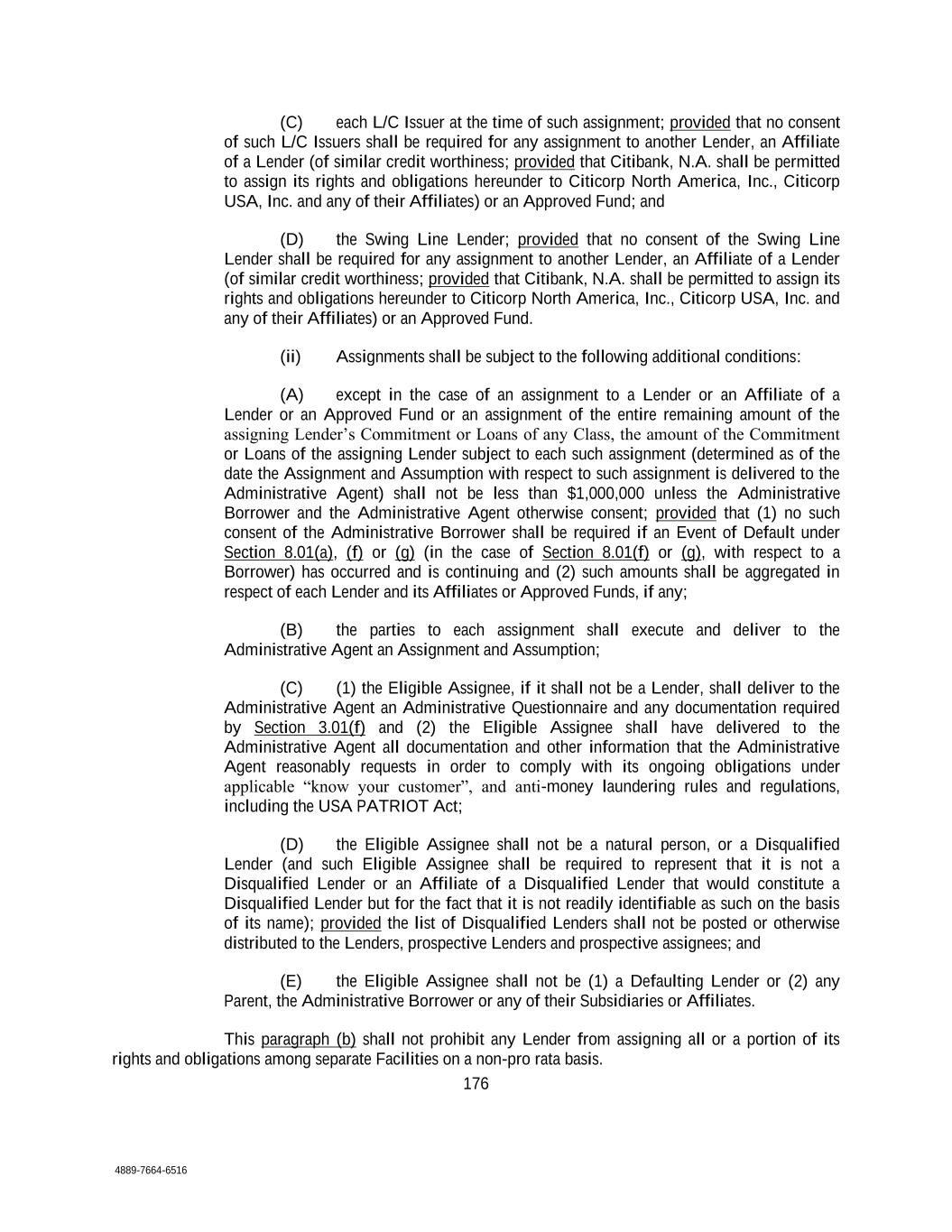 176 4889-7664-6516 (C) each L/C Issuer at the time of such assignment; provided that no consent of such L/C Issuers shall be required for any assignment to another Lender, an Affiliate of a Lender (of similar credit worthiness; provided that Citibank, N.A. shall be permitted to assign its rights and obligations hereunder to Citicorp North America, Inc., Citicorp USA, Inc. and any of their Affiliates) or an Approved Fund; and (D) the Swing Line Lender; provided that no consent of the Swing Line Lender shall be required for any assignment to another Lender, an Affiliate of a Lender (of similar credit worthiness; provided that Citibank, N.A. shall be permitted to assign its rights and obligations hereunder to Citicorp North America, Inc., Citicorp USA, Inc. and any of their Affiliates) or an Approved Fund. (ii) Assignments shall be subject to the following additional conditions: (A) except in the case of an assignment to a Lender or an Affiliate of a Lender or an Approved Fund or an assignment of the entire remaining amount of the assigning Lender’s Commitment or Loans of any Class, the amount of the Commitment or Loans of the assigning Lender subject to each such assignment (determined as of the date the Assignment and Assumption with respect to such assignment is delivered to the Administrative Agent) shall not be less than $1,000,000 unless the Administrative Borrower and the Administrative Agent otherwise consent; provided that (1) no such consent of the Administrative Borrower shall be required if an Event of Default under Section 8.01(a), (f) or (g) (in the case of Section 8.01(f) or (g), with respect to a Borrower) has occurred and is continuing and (2) such amounts shall be aggregated in respect of each Lender and its Affiliates or Approved Funds, if any; (B) the parties to each assignment shall execute and deliver to the Administrative Agent an Assignment and Assumption; (C) (1) the Eligible Assignee, if it shall not be a Lender, shall deliver to the Administrative Agent an Administrative Questionnaire and any documentation required by Section 3.01(f) and (2) the Eligible Assignee shall have delivered to the Administrative Agent all documentation and other information that the Administrative Agent reasonably requests in order to comply with its ongoing obligations under applicable “know your customer”, and anti-money laundering rules and regulations, including the USA PATRIOT Act; (D) the Eligible Assignee shall not be a natural person, or a Disqualified Lender (and such Eligible Assignee shall be required to represent that it is not a Disqualified Lender or an Affiliate of a Disqualified Lender that would constitute a Disqualified Lender but for the fact that it is not readily identifiable as such on the basis of its name); provided the list of Disqualified Lenders shall not be posted or otherwise distributed to the Lenders, prospective Lenders and prospective assignees; and (E) the Eligible Assignee shall not be (1) a Defaulting Lender or (2) any Parent, the Administrative Borrower or any of their Subsidiaries or Affiliates. This paragraph (b) shall not prohibit any Lender from assigning all or a portion of its rights and obligations among separate Facilities on a non-pro rata basis.