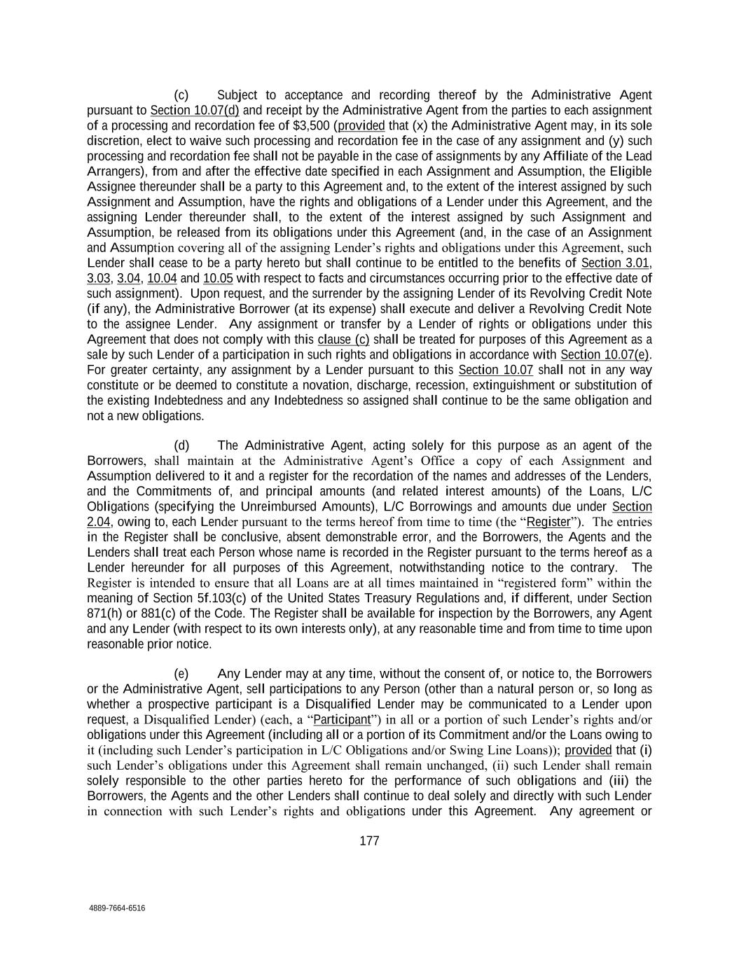 177 4889-7664-6516 (c) Subject to acceptance and recording thereof by the Administrative Agent pursuant to Section 10.07(d) and receipt by the Administrative Agent from the parties to each assignment of a processing and recordation fee of $3,500 (provided that (x) the Administrative Agent may, in its sole discretion, elect to waive such processing and recordation fee in the case of any assignment and (y) such processing and recordation fee shall not be payable in the case of assignments by any Affiliate of the Lead Arrangers), from and after the effective date specified in each Assignment and Assumption, the Eligible Assignee thereunder shall be a party to this Agreement and, to the extent of the interest assigned by such Assignment and Assumption, have the rights and obligations of a Lender under this Agreement, and the assigning Lender thereunder shall, to the extent of the interest assigned by such Assignment and Assumption, be released from its obligations under this Agreement (and, in the case of an Assignment and Assumption covering all of the assigning Lender’s rights and obligations under this Agreement, such Lender shall cease to be a party hereto but shall continue to be entitled to the benefits of Section 3.01, 3.03, 3.04, 10.04 and 10.05 with respect to facts and circumstances occurring prior to the effective date of such assignment). Upon request, and the surrender by the assigning Lender of its Revolving Credit Note (if any), the Administrative Borrower (at its expense) shall execute and deliver a Revolving Credit Note to the assignee Lender. Any assignment or transfer by a Lender of rights or obligations under this Agreement that does not comply with this clause (c) shall be treated for purposes of this Agreement as a sale by such Lender of a participation in such rights and obligations in accordance with Section 10.07(e). For greater certainty, any assignment by a Lender pursuant to this Section 10.07 shall not in any way constitute or be deemed to constitute a novation, discharge, recession, extinguishment or substitution of the existing Indebtedness and any Indebtedness so assigned shall continue to be the same obligation and not a new obligations. (d) The Administrative Agent, acting solely for this purpose as an agent of the Borrowers, shall maintain at the Administrative Agent’s Office a copy of each Assignment and Assumption delivered to it and a register for the recordation of the names and addresses of the Lenders, and the Commitments of, and principal amounts (and related interest amounts) of the Loans, L/C Obligations (specifying the Unreimbursed Amounts), L/C Borrowings and amounts due under Section 2.04, owing to, each Lender pursuant to the terms hereof from time to time (the “Register”). The entries in the Register shall be conclusive, absent demonstrable error, and the Borrowers, the Agents and the Lenders shall treat each Person whose name is recorded in the Register pursuant to the terms hereof as a Lender hereunder for all purposes of this Agreement, notwithstanding notice to the contrary. The Register is intended to ensure that all Loans are at all times maintained in “registered form” within the meaning of Section 5f.103(c) of the United States Treasury Regulations and, if different, under Section 871(h) or 881(c) of the Code. The Register shall be available for inspection by the Borrowers, any Agent and any Lender (with respect to its own interests only), at any reasonable time and from time to time upon reasonable prior notice. (e) Any Lender may at any time, without the consent of, or notice to, the Borrowers or the Administrative Agent, sell participations to any Person (other than a natural person or, so long as whether a prospective participant is a Disqualified Lender may be communicated to a Lender upon request, a Disqualified Lender) (each, a “Participant”) in all or a portion of such Lender’s rights and/or obligations under this Agreement (including all or a portion of its Commitment and/or the Loans owing to it (including such Lender’s participation in L/C Obligations and/or Swing Line Loans)); provided that (i) such Lender’s obligations under this Agreement shall remain unchanged, (ii) such Lender shall remain solely responsible to the other parties hereto for the performance of such obligations and (iii) the Borrowers, the Agents and the other Lenders shall continue to deal solely and directly with such Lender in connection with such Lender’s rights and obligations under this Agreement. Any agreement or