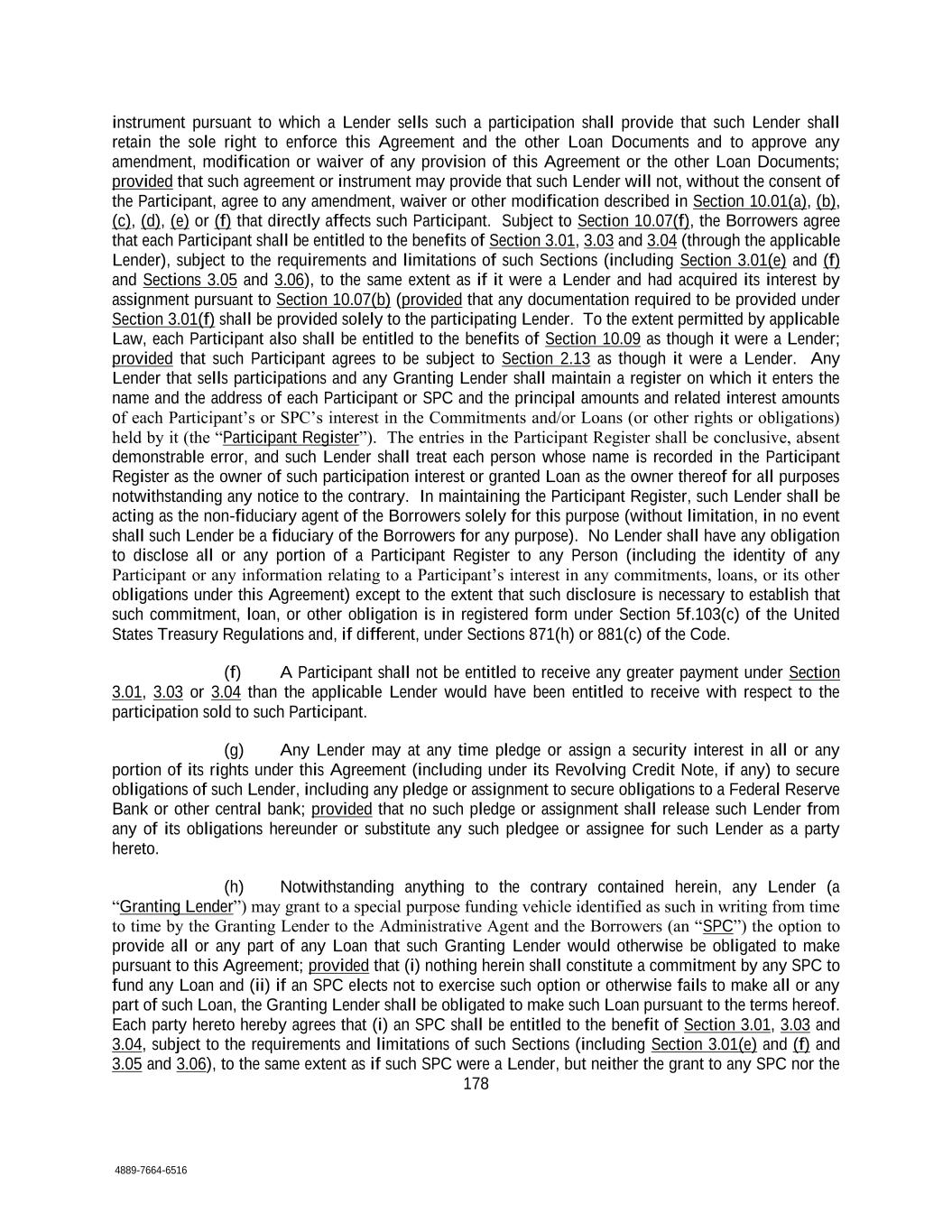 178 4889-7664-6516 instrument pursuant to which a Lender sells such a participation shall provide that such Lender shall retain the sole right to enforce this Agreement and the other Loan Documents and to approve any amendment, modification or waiver of any provision of this Agreement or the other Loan Documents; provided that such agreement or instrument may provide that such Lender will not, without the consent of the Participant, agree to any amendment, waiver or other modification described in Section 10.01(a), (b), (c), (d), (e) or (f) that directly affects such Participant. Subject to Section 10.07(f), the Borrowers agree that each Participant shall be entitled to the benefits of Section 3.01, 3.03 and 3.04 (through the applicable Lender), subject to the requirements and limitations of such Sections (including Section 3.01(e) and (f) and Sections 3.05 and 3.06), to the same extent as if it were a Lender and had acquired its interest by assignment pursuant to Section 10.07(b) (provided that any documentation required to be provided under Section 3.01(f) shall be provided solely to the participating Lender. To the extent permitted by applicable Law, each Participant also shall be entitled to the benefits of Section 10.09 as though it were a Lender; provided that such Participant agrees to be subject to Section 2.13 as though it were a Lender. Any Lender that sells participations and any Granting Lender shall maintain a register on which it enters the name and the address of each Participant or SPC and the principal amounts and related interest amounts of each Participant’s or SPC’s interest in the Commitments and/or Loans (or other rights or obligations) held by it (the “Participant Register”). The entries in the Participant Register shall be conclusive, absent demonstrable error, and such Lender shall treat each person whose name is recorded in the Participant Register as the owner of such participation interest or granted Loan as the owner thereof for all purposes notwithstanding any notice to the contrary. In maintaining the Participant Register, such Lender shall be acting as the non-fiduciary agent of the Borrowers solely for this purpose (without limitation, in no event shall such Lender be a fiduciary of the Borrowers for any purpose). No Lender shall have any obligation to disclose all or any portion of a Participant Register to any Person (including the identity of any Participant or any information relating to a Participant’s interest in any commitments, loans, or its other obligations under this Agreement) except to the extent that such disclosure is necessary to establish that such commitment, loan, or other obligation is in registered form under Section 5f.103(c) of the United States Treasury Regulations and, if different, under Sections 871(h) or 881(c) of the Code. (f) A Participant shall not be entitled to receive any greater payment under Section 3.01, 3.03 or 3.04 than the applicable Lender would have been entitled to receive with respect to the participation sold to such Participant. (g) Any Lender may at any time pledge or assign a security interest in all or any portion of its rights under this Agreement (including under its Revolving Credit Note, if any) to secure obligations of such Lender, including any pledge or assignment to secure obligations to a Federal Reserve Bank or other central bank; provided that no such pledge or assignment shall release such Lender from any of its obligations hereunder or substitute any such pledgee or assignee for such Lender as a party hereto. (h) Notwithstanding anything to the contrary contained herein, any Lender (a “Granting Lender”) may grant to a special purpose funding vehicle identified as such in writing from time to time by the Granting Lender to the Administrative Agent and the Borrowers (an “SPC”) the option to provide all or any part of any Loan that such Granting Lender would otherwise be obligated to make pursuant to this Agreement; provided that (i) nothing herein shall constitute a commitment by any SPC to fund any Loan and (ii) if an SPC elects not to exercise such option or otherwise fails to make all or any part of such Loan, the Granting Lender shall be obligated to make such Loan pursuant to the terms hereof. Each party hereto hereby agrees that (i) an SPC shall be entitled to the benefit of Section 3.01, 3.03 and 3.04, subject to the requirements and limitations of such Sections (including Section 3.01(e) and (f) and 3.05 and 3.06), to the same extent as if such SPC were a Lender, but neither the grant to any SPC nor the