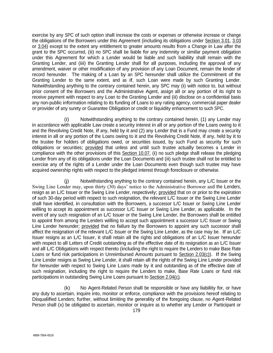 179 4889-7664-6516 exercise by any SPC of such option shall increase the costs or expenses or otherwise increase or change the obligations of the Borrowers under this Agreement (including its obligations under Section 3.01, 3.03 or 3.04) except to the extent any entitlement to greater amounts results from a Change in Law after the grant to the SPC occurred, (ii) no SPC shall be liable for any indemnity or similar payment obligation under this Agreement for which a Lender would be liable and such liability shall remain with the Granting Lender, and (iii) the Granting Lender shall for all purposes, including the approval of any amendment, waiver or other modification of any provision of any Loan Document, remain the lender of record hereunder. The making of a Loan by an SPC hereunder shall utilize the Commitment of the Granting Lender to the same extent, and as if, such Loan were made by such Granting Lender. Notwithstanding anything to the contrary contained herein, any SPC may (i) with notice to, but without prior consent of the Borrowers and the Administrative Agent, assign all or any portion of its right to receive payment with respect to any Loan to the Granting Lender and (ii) disclose on a confidential basis any non-public information relating to its funding of Loans to any rating agency, commercial paper dealer or provider of any surety or Guarantee Obligation or credit or liquidity enhancement to such SPC. (i) Notwithstanding anything to the contrary contained herein, (1) any Lender may in accordance with applicable Law create a security interest in all or any portion of the Loans owing to it and the Revolving Credit Note, if any, held by it and (2) any Lender that is a Fund may create a security interest in all or any portion of the Loans owing to it and the Revolving Credit Note, if any, held by it to the trustee for holders of obligations owed, or securities issued, by such Fund as security for such obligations or securities; provided that unless and until such trustee actually becomes a Lender in compliance with the other provisions of this Section 10.07, (i) no such pledge shall release the pledging Lender from any of its obligations under the Loan Documents and (ii) such trustee shall not be entitled to exercise any of the rights of a Lender under the Loan Documents even though such trustee may have acquired ownership rights with respect to the pledged interest through foreclosure or otherwise. (j) Notwithstanding anything to the contrary contained herein, any L/C Issuer or the Swing Line Lender may, upon thirty (30) days’ notice to the Administrative Borrower and the Lenders, resign as an L/C Issuer or the Swing Line Lender, respectively; provided that on or prior to the expiration of such 30-day period with respect to such resignation, the relevant L/C Issuer or the Swing Line Lender shall have identified, in consultation with the Borrowers, a successor L/C Issuer or Swing Line Lender willing to accept its appointment as successor L/C Issuer or Swing Line Lender, as applicable. In the event of any such resignation of an L/C Issuer or the Swing Line Lender, the Borrowers shall be entitled to appoint from among the Lenders willing to accept such appointment a successor L/C Issuer or Swing Line Lender hereunder; provided that no failure by the Borrowers to appoint any such successor shall affect the resignation of the relevant L/C Issuer or the Swing Line Lender, as the case may be. If an L/C Issuer resigns as an L/C Issuer, it shall retain all the rights and obligations of an L/C Issuer hereunder with respect to all Letters of Credit outstanding as of the effective date of its resignation as an L/C Issuer and all L/C Obligations with respect thereto (including the right to require the Lenders to make Base Rate Loans or fund risk participations in Unreimbursed Amounts pursuant to Section 2.03(c)). If the Swing Line Lender resigns as Swing Line Lender, it shall retain all the rights of the Swing Line Lender provided for hereunder with respect to Swing Line Loans made by it and outstanding as of the effective date of such resignation, including the right to require the Lenders to make, Base Rate Loans or fund risk participations in outstanding Swing Line Loans pursuant to Section 2.04(c). (k) No Agent-Related Person shall be responsible or have any liability for, or have any duty to ascertain, inquire into, monitor or enforce, compliance with the provisions hereof relating to Disqualified Lenders; further, without limiting the generality of the foregoing clause, no Agent-Related Person shall (x) be obligated to ascertain, monitor or inquire as to whether any Lender or Participant or