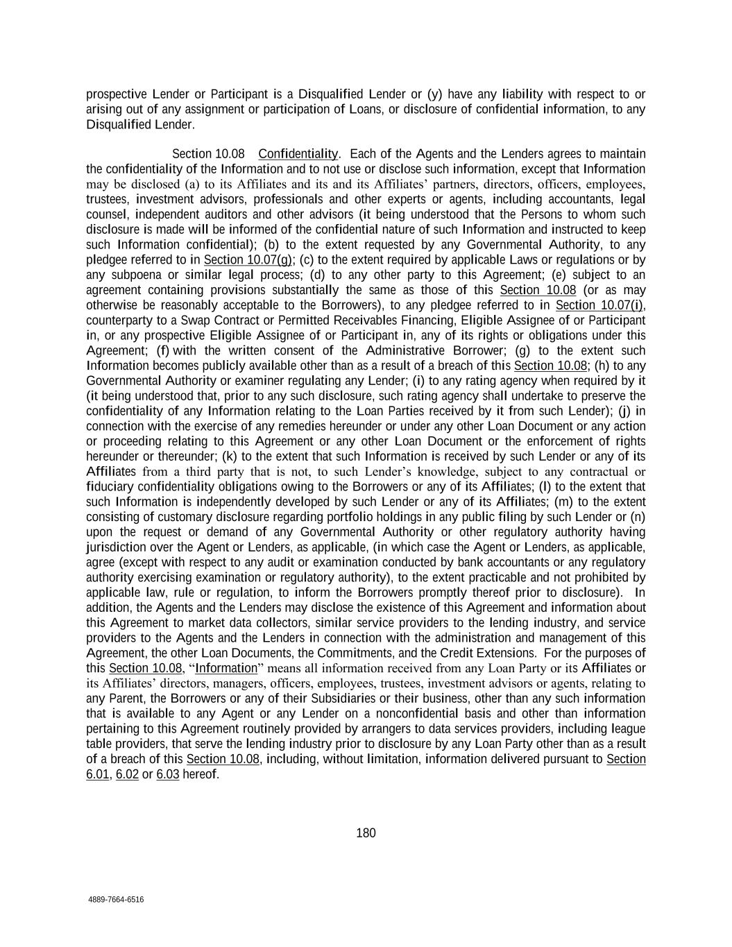 180 4889-7664-6516 prospective Lender or Participant is a Disqualified Lender or (y) have any liability with respect to or arising out of any assignment or participation of Loans, or disclosure of confidential information, to any Disqualified Lender. Section 10.08 Confidentiality. Each of the Agents and the Lenders agrees to maintain the confidentiality of the Information and to not use or disclose such information, except that Information may be disclosed (a) to its Affiliates and its and its Affiliates’ partners, directors, officers, employees, trustees, investment advisors, professionals and other experts or agents, including accountants, legal counsel, independent auditors and other advisors (it being understood that the Persons to whom such disclosure is made will be informed of the confidential nature of such Information and instructed to keep such Information confidential); (b) to the extent requested by any Governmental Authority, to any pledgee referred to in Section 10.07(g); (c) to the extent required by applicable Laws or regulations or by any subpoena or similar legal process; (d) to any other party to this Agreement; (e) subject to an agreement containing provisions substantially the same as those of this Section 10.08 (or as may otherwise be reasonably acceptable to the Borrowers), to any pledgee referred to in Section 10.07(i), counterparty to a Swap Contract or Permitted Receivables Financing, Eligible Assignee of or Participant in, or any prospective Eligible Assignee of or Participant in, any of its rights or obligations under this Agreement; (f) with the written consent of the Administrative Borrower; (g) to the extent such Information becomes publicly available other than as a result of a breach of this Section 10.08; (h) to any Governmental Authority or examiner regulating any Lender; (i) to any rating agency when required by it (it being understood that, prior to any such disclosure, such rating agency shall undertake to preserve the confidentiality of any Information relating to the Loan Parties received by it from such Lender); (j) in connection with the exercise of any remedies hereunder or under any other Loan Document or any action or proceeding relating to this Agreement or any other Loan Document or the enforcement of rights hereunder or thereunder; (k) to the extent that such Information is received by such Lender or any of its Affiliates from a third party that is not, to such Lender’s knowledge, subject to any contractual or fiduciary confidentiality obligations owing to the Borrowers or any of its Affiliates; (l) to the extent that such Information is independently developed by such Lender or any of its Affiliates; (m) to the extent consisting of customary disclosure regarding portfolio holdings in any public filing by such Lender or (n) upon the request or demand of any Governmental Authority or other regulatory authority having jurisdiction over the Agent or Lenders, as applicable, (in which case the Agent or Lenders, as applicable, agree (except with respect to any audit or examination conducted by bank accountants or any regulatory authority exercising examination or regulatory authority), to the extent practicable and not prohibited by applicable law, rule or regulation, to inform the Borrowers promptly thereof prior to disclosure). In addition, the Agents and the Lenders may disclose the existence of this Agreement and information about this Agreement to market data collectors, similar service providers to the lending industry, and service providers to the Agents and the Lenders in connection with the administration and management of this Agreement, the other Loan Documents, the Commitments, and the Credit Extensions. For the purposes of this Section 10.08, “Information” means all information received from any Loan Party or its Affiliates or its Affiliates’ directors, managers, officers, employees, trustees, investment advisors or agents, relating to any Parent, the Borrowers or any of their Subsidiaries or their business, other than any such information that is available to any Agent or any Lender on a nonconfidential basis and other than information pertaining to this Agreement routinely provided by arrangers to data services providers, including league table providers, that serve the lending industry prior to disclosure by any Loan Party other than as a result of a breach of this Section 10.08, including, without limitation, information delivered pursuant to Section 6.01, 6.02 or 6.03 hereof.