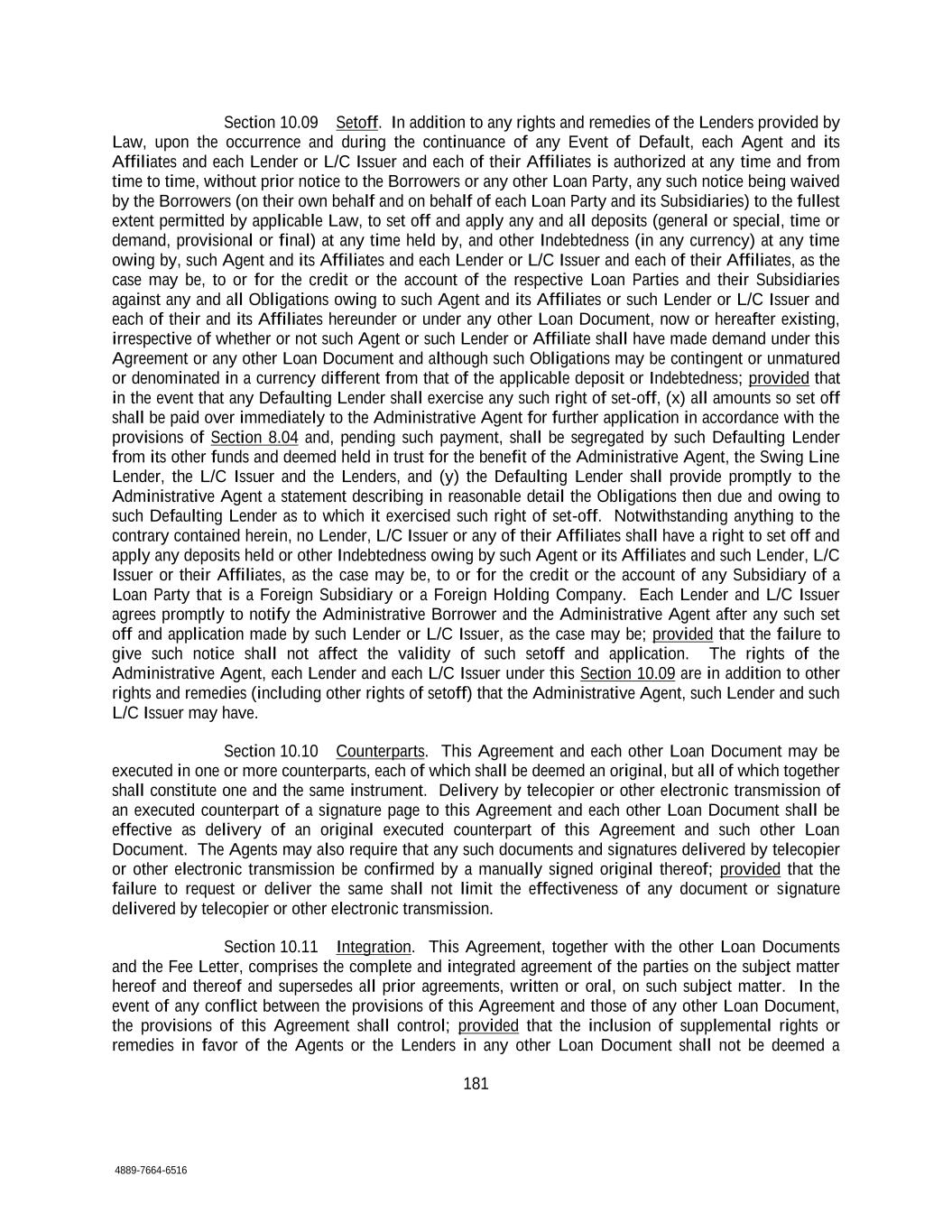 181 4889-7664-6516 Section 10.09 Setoff. In addition to any rights and remedies of the Lenders provided by Law, upon the occurrence and during the continuance of any Event of Default, each Agent and its Affiliates and each Lender or L/C Issuer and each of their Affiliates is authorized at any time and from time to time, without prior notice to the Borrowers or any other Loan Party, any such notice being waived by the Borrowers (on their own behalf and on behalf of each Loan Party and its Subsidiaries) to the fullest extent permitted by applicable Law, to set off and apply any and all deposits (general or special, time or demand, provisional or final) at any time held by, and other Indebtedness (in any currency) at any time owing by, such Agent and its Affiliates and each Lender or L/C Issuer and each of their Affiliates, as the case may be, to or for the credit or the account of the respective Loan Parties and their Subsidiaries against any and all Obligations owing to such Agent and its Affiliates or such Lender or L/C Issuer and each of their and its Affiliates hereunder or under any other Loan Document, now or hereafter existing, irrespective of whether or not such Agent or such Lender or Affiliate shall have made demand under this Agreement or any other Loan Document and although such Obligations may be contingent or unmatured or denominated in a currency different from that of the applicable deposit or Indebtedness; provided that in the event that any Defaulting Lender shall exercise any such right of set-off, (x) all amounts so set off shall be paid over immediately to the Administrative Agent for further application in accordance with the provisions of Section 8.04 and, pending such payment, shall be segregated by such Defaulting Lender from its other funds and deemed held in trust for the benefit of the Administrative Agent, the Swing Line Lender, the L/C Issuer and the Lenders, and (y) the Defaulting Lender shall provide promptly to the Administrative Agent a statement describing in reasonable detail the Obligations then due and owing to such Defaulting Lender as to which it exercised such right of set-off. Notwithstanding anything to the contrary contained herein, no Lender, L/C Issuer or any of their Affiliates shall have a right to set off and apply any deposits held or other Indebtedness owing by such Agent or its Affiliates and such Lender, L/C Issuer or their Affiliates, as the case may be, to or for the credit or the account of any Subsidiary of a Loan Party that is a Foreign Subsidiary or a Foreign Holding Company. Each Lender and L/C Issuer agrees promptly to notify the Administrative Borrower and the Administrative Agent after any such set off and application made by such Lender or L/C Issuer, as the case may be; provided that the failure to give such notice shall not affect the validity of such setoff and application. The rights of the Administrative Agent, each Lender and each L/C Issuer under this Section 10.09 are in addition to other rights and remedies (including other rights of setoff) that the Administrative Agent, such Lender and such L/C Issuer may have. Section 10.10 Counterparts. This Agreement and each other Loan Document may be executed in one or more counterparts, each of which shall be deemed an original, but all of which together shall constitute one and the same instrument. Delivery by telecopier or other electronic transmission of an executed counterpart of a signature page to this Agreement and each other Loan Document shall be effective as delivery of an original executed counterpart of this Agreement and such other Loan Document. The Agents may also require that any such documents and signatures delivered by telecopier or other electronic transmission be confirmed by a manually signed original thereof; provided that the failure to request or deliver the same shall not limit the effectiveness of any document or signature delivered by telecopier or other electronic transmission. Section 10.11 Integration. This Agreement, together with the other Loan Documents and the Fee Letter, comprises the complete and integrated agreement of the parties on the subject matter hereof and thereof and supersedes all prior agreements, written or oral, on such subject matter. In the event of any conflict between the provisions of this Agreement and those of any other Loan Document, the provisions of this Agreement shall control; provided that the inclusion of supplemental rights or remedies in favor of the Agents or the Lenders in any other Loan Document shall not be deemed a