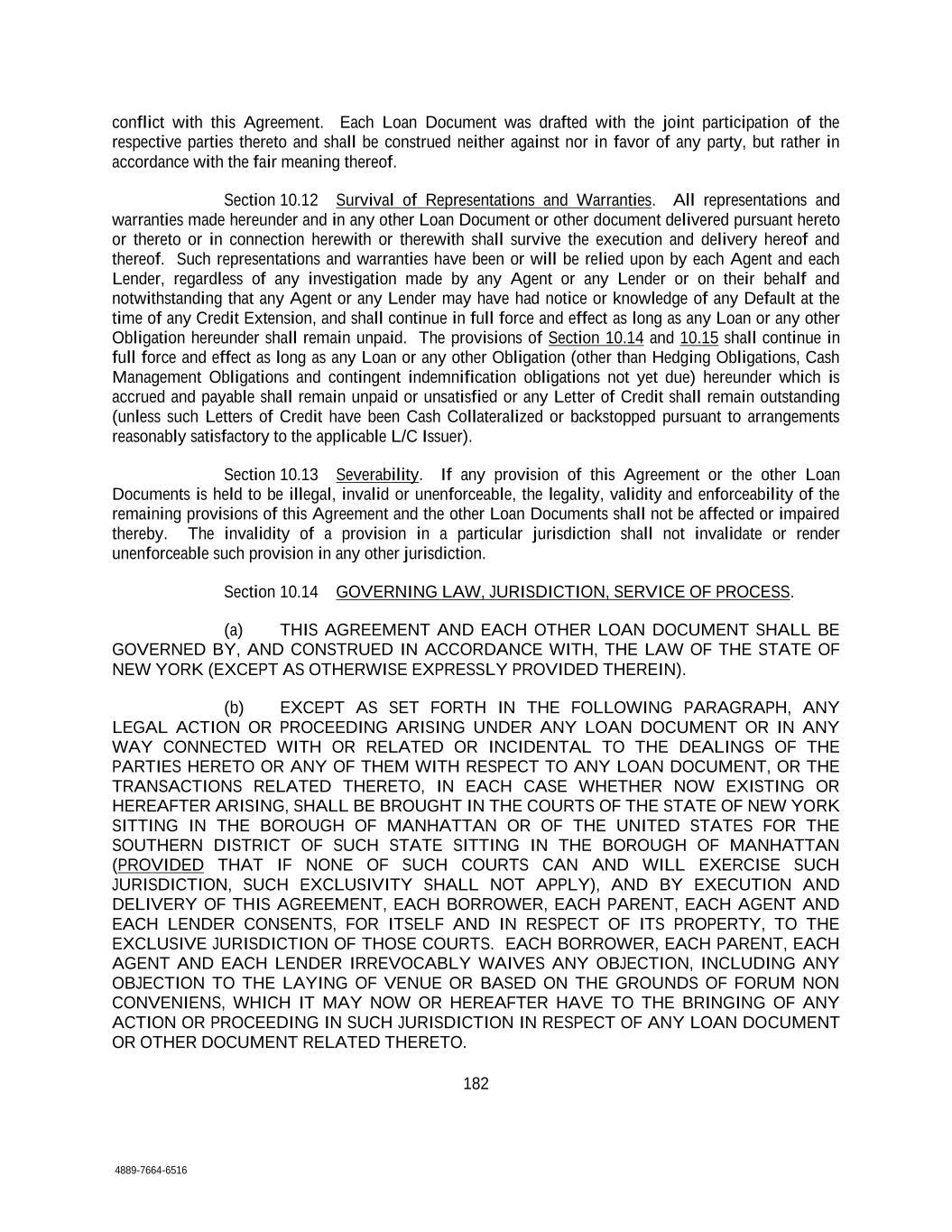 182 4889-7664-6516 conflict with this Agreement. Each Loan Document was drafted with the joint participation of the respective parties thereto and shall be construed neither against nor in favor of any party, but rather in accordance with the fair meaning thereof. Section 10.12 Survival of Representations and Warranties. All representations and warranties made hereunder and in any other Loan Document or other document delivered pursuant hereto or thereto or in connection herewith or therewith shall survive the execution and delivery hereof and thereof. Such representations and warranties have been or will be relied upon by each Agent and each Lender, regardless of any investigation made by any Agent or any Lender or on their behalf and notwithstanding that any Agent or any Lender may have had notice or knowledge of any Default at the time of any Credit Extension, and shall continue in full force and effect as long as any Loan or any other Obligation hereunder shall remain unpaid. The provisions of Section 10.14 and 10.15 shall continue in full force and effect as long as any Loan or any other Obligation (other than Hedging Obligations, Cash Management Obligations and contingent indemnification obligations not yet due) hereunder which is accrued and payable shall remain unpaid or unsatisfied or any Letter of Credit shall remain outstanding (unless such Letters of Credit have been Cash Collateralized or backstopped pursuant to arrangements reasonably satisfactory to the applicable L/C Issuer). Section 10.13 Severability. If any provision of this Agreement or the other Loan Documents is held to be illegal, invalid or unenforceable, the legality, validity and enforceability of the remaining provisions of this Agreement and the other Loan Documents shall not be affected or impaired thereby. The invalidity of a provision in a particular jurisdiction shall not invalidate or render unenforceable such provision in any other jurisdiction. Section 10.14 GOVERNING LAW, JURISDICTION, SERVICE OF PROCESS. (a) THIS AGREEMENT AND EACH OTHER LOAN DOCUMENT SHALL BE GOVERNED BY, AND CONSTRUED IN ACCORDANCE WITH, THE LAW OF THE STATE OF NEW YORK (EXCEPT AS OTHERWISE EXPRESSLY PROVIDED THEREIN). (b) EXCEPT AS SET FORTH IN THE FOLLOWING PARAGRAPH, ANY LEGAL ACTION OR PROCEEDING ARISING UNDER ANY LOAN DOCUMENT OR IN ANY WAY CONNECTED WITH OR RELATED OR INCIDENTAL TO THE DEALINGS OF THE PARTIES HERETO OR ANY OF THEM WITH RESPECT TO ANY LOAN DOCUMENT, OR THE TRANSACTIONS RELATED THERETO, IN EACH CASE WHETHER NOW EXISTING OR HEREAFTER ARISING, SHALL BE BROUGHT IN THE COURTS OF THE STATE OF NEW YORK SITTING IN THE BOROUGH OF MANHATTAN OR OF THE UNITED STATES FOR THE SOUTHERN DISTRICT OF SUCH STATE SITTING IN THE BOROUGH OF MANHATTAN (PROVIDED THAT IF NONE OF SUCH COURTS CAN AND WILL EXERCISE SUCH JURISDICTION, SUCH EXCLUSIVITY SHALL NOT APPLY), AND BY EXECUTION AND DELIVERY OF THIS AGREEMENT, EACH BORROWER, EACH PARENT, EACH AGENT AND EACH LENDER CONSENTS, FOR ITSELF AND IN RESPECT OF ITS PROPERTY, TO THE EXCLUSIVE JURISDICTION OF THOSE COURTS. EACH BORROWER, EACH PARENT, EACH AGENT AND EACH LENDER IRREVOCABLY WAIVES ANY OBJECTION, INCLUDING ANY OBJECTION TO THE LAYING OF VENUE OR BASED ON THE GROUNDS OF FORUM NON CONVENIENS, WHICH IT MAY NOW OR HEREAFTER HAVE TO THE BRINGING OF ANY ACTION OR PROCEEDING IN SUCH JURISDICTION IN RESPECT OF ANY LOAN DOCUMENT OR OTHER DOCUMENT RELATED THERETO.