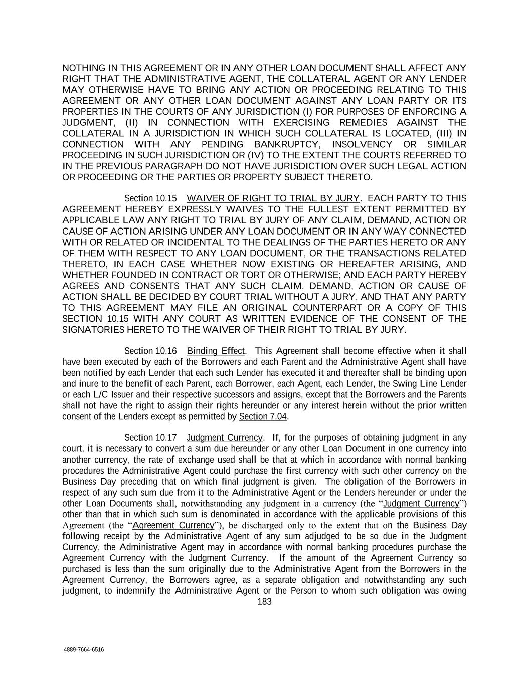 183 4889-7664-6516 NOTHING IN THIS AGREEMENT OR IN ANY OTHER LOAN DOCUMENT SHALL AFFECT ANY RIGHT THAT THE ADMINISTRATIVE AGENT, THE COLLATERAL AGENT OR ANY LENDER MAY OTHERWISE HAVE TO BRING ANY ACTION OR PROCEEDING RELATING TO THIS AGREEMENT OR ANY OTHER LOAN DOCUMENT AGAINST ANY LOAN PARTY OR ITS PROPERTIES IN THE COURTS OF ANY JURISDICTION (I) FOR PURPOSES OF ENFORCING A JUDGMENT, (II) IN CONNECTION WITH EXERCISING REMEDIES AGAINST THE COLLATERAL IN A JURISDICTION IN WHICH SUCH COLLATERAL IS LOCATED, (III) IN CONNECTION WITH ANY PENDING BANKRUPTCY, INSOLVENCY OR SIMILAR PROCEEDING IN SUCH JURISDICTION OR (IV) TO THE EXTENT THE COURTS REFERRED TO IN THE PREVIOUS PARAGRAPH DO NOT HAVE JURISDICTION OVER SUCH LEGAL ACTION OR PROCEEDING OR THE PARTIES OR PROPERTY SUBJECT THERETO. Section 10.15 WAIVER OF RIGHT TO TRIAL BY JURY. EACH PARTY TO THIS AGREEMENT HEREBY EXPRESSLY WAIVES TO THE FULLEST EXTENT PERMITTED BY APPLICABLE LAW ANY RIGHT TO TRIAL BY JURY OF ANY CLAIM, DEMAND, ACTION OR CAUSE OF ACTION ARISING UNDER ANY LOAN DOCUMENT OR IN ANY WAY CONNECTED WITH OR RELATED OR INCIDENTAL TO THE DEALINGS OF THE PARTIES HERETO OR ANY OF THEM WITH RESPECT TO ANY LOAN DOCUMENT, OR THE TRANSACTIONS RELATED THERETO, IN EACH CASE WHETHER NOW EXISTING OR HEREAFTER ARISING, AND WHETHER FOUNDED IN CONTRACT OR TORT OR OTHERWISE; AND EACH PARTY HEREBY AGREES AND CONSENTS THAT ANY SUCH CLAIM, DEMAND, ACTION OR CAUSE OF ACTION SHALL BE DECIDED BY COURT TRIAL WITHOUT A JURY, AND THAT ANY PARTY TO THIS AGREEMENT MAY FILE AN ORIGINAL COUNTERPART OR A COPY OF THIS SECTION 10.15 WITH ANY COURT AS WRITTEN EVIDENCE OF THE CONSENT OF THE SIGNATORIES HERETO TO THE WAIVER OF THEIR RIGHT TO TRIAL BY JURY. Section 10.16 Binding Effect. This Agreement shall become effective when it shall have been executed by each of the Borrowers and each Parent and the Administrative Agent shall have been notified by each Lender that each such Lender has executed it and thereafter shall be binding upon and inure to the benefit of each Parent, each Borrower, each Agent, each Lender, the Swing Line Lender or each L/C Issuer and their respective successors and assigns, except that the Borrowers and the Parents shall not have the right to assign their rights hereunder or any interest herein without the prior written consent of the Lenders except as permitted by Section 7.04. Section 10.17 Judgment Currency. If, for the purposes of obtaining judgment in any court, it is necessary to convert a sum due hereunder or any other Loan Document in one currency into another currency, the rate of exchange used shall be that at which in accordance with normal banking procedures the Administrative Agent could purchase the first currency with such other currency on the Business Day preceding that on which final judgment is given. The obligation of the Borrowers in respect of any such sum due from it to the Administrative Agent or the Lenders hereunder or under the other Loan Documents shall, notwithstanding any judgment in a currency (the “Judgment Currency”) other than that in which such sum is denominated in accordance with the applicable provisions of this Agreement (the “Agreement Currency”), be discharged only to the extent that on the Business Day following receipt by the Administrative Agent of any sum adjudged to be so due in the Judgment Currency, the Administrative Agent may in accordance with normal banking procedures purchase the Agreement Currency with the Judgment Currency. If the amount of the Agreement Currency so purchased is less than the sum originally due to the Administrative Agent from the Borrowers in the Agreement Currency, the Borrowers agree, as a separate obligation and notwithstanding any such judgment, to indemnify the Administrative Agent or the Person to whom such obligation was owing