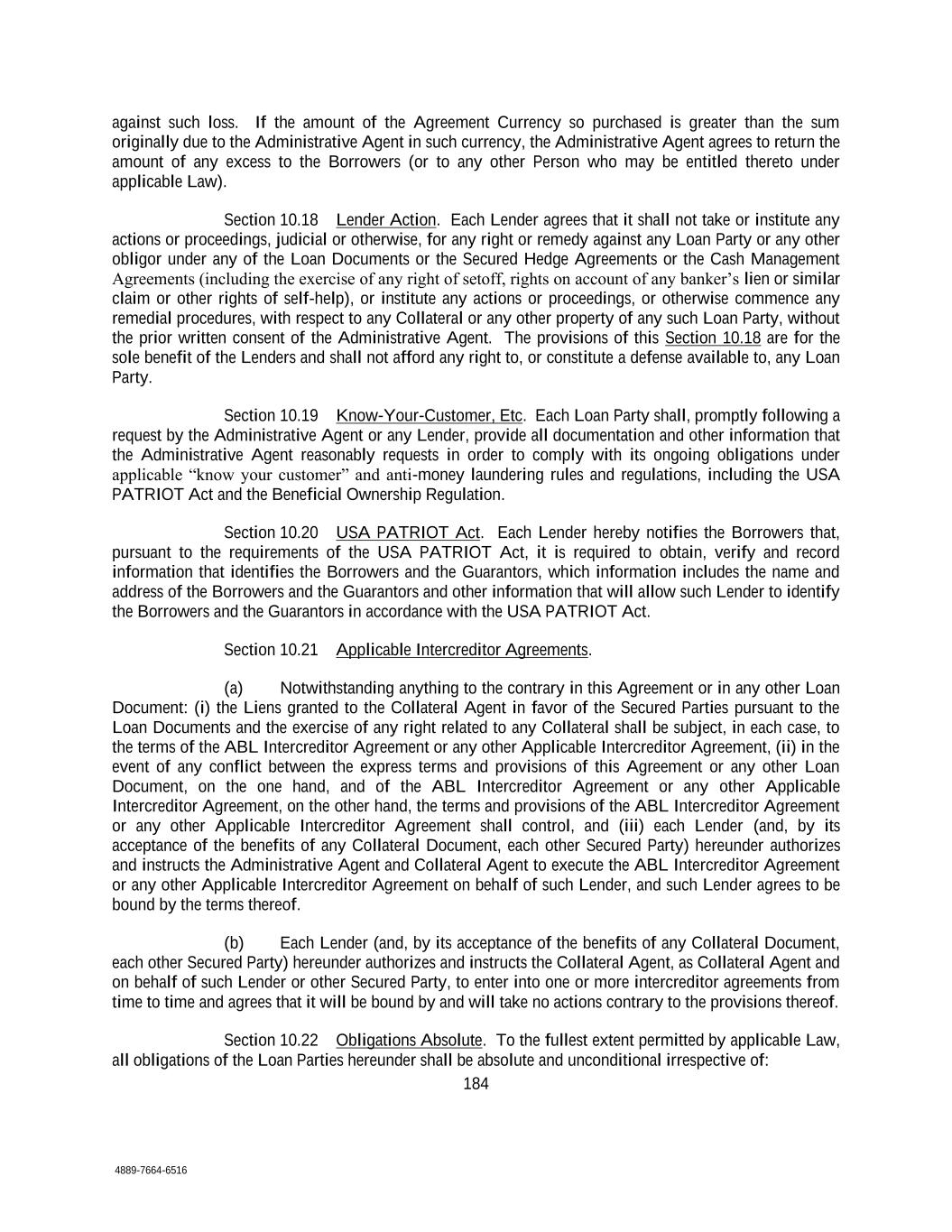 184 4889-7664-6516 against such loss. If the amount of the Agreement Currency so purchased is greater than the sum originally due to the Administrative Agent in such currency, the Administrative Agent agrees to return the amount of any excess to the Borrowers (or to any other Person who may be entitled thereto under applicable Law). Section 10.18 Lender Action. Each Lender agrees that it shall not take or institute any actions or proceedings, judicial or otherwise, for any right or remedy against any Loan Party or any other obligor under any of the Loan Documents or the Secured Hedge Agreements or the Cash Management Agreements (including the exercise of any right of setoff, rights on account of any banker’s lien or similar claim or other rights of self-help), or institute any actions or proceedings, or otherwise commence any remedial procedures, with respect to any Collateral or any other property of any such Loan Party, without the prior written consent of the Administrative Agent. The provisions of this Section 10.18 are for the sole benefit of the Lenders and shall not afford any right to, or constitute a defense available to, any Loan Party. Section 10.19 Know-Your-Customer, Etc. Each Loan Party shall, promptly following a request by the Administrative Agent or any Lender, provide all documentation and other information that the Administrative Agent reasonably requests in order to comply with its ongoing obligations under applicable “know your customer” and anti-money laundering rules and regulations, including the USA PATRIOT Act and the Beneficial Ownership Regulation. Section 10.20 USA PATRIOT Act. Each Lender hereby notifies the Borrowers that, pursuant to the requirements of the USA PATRIOT Act, it is required to obtain, verify and record information that identifies the Borrowers and the Guarantors, which information includes the name and address of the Borrowers and the Guarantors and other information that will allow such Lender to identify the Borrowers and the Guarantors in accordance with the USA PATRIOT Act. Section 10.21 Applicable Intercreditor Agreements. (a) Notwithstanding anything to the contrary in this Agreement or in any other Loan Document: (i) the Liens granted to the Collateral Agent in favor of the Secured Parties pursuant to the Loan Documents and the exercise of any right related to any Collateral shall be subject, in each case, to the terms of the ABL Intercreditor Agreement or any other Applicable Intercreditor Agreement, (ii) in the event of any conflict between the express terms and provisions of this Agreement or any other Loan Document, on the one hand, and of the ABL Intercreditor Agreement or any other Applicable Intercreditor Agreement, on the other hand, the terms and provisions of the ABL Intercreditor Agreement or any other Applicable Intercreditor Agreement shall control, and (iii) each Lender (and, by its acceptance of the benefits of any Collateral Document, each other Secured Party) hereunder authorizes and instructs the Administrative Agent and Collateral Agent to execute the ABL Intercreditor Agreement or any other Applicable Intercreditor Agreement on behalf of such Lender, and such Lender agrees to be bound by the terms thereof. (b) Each Lender (and, by its acceptance of the benefits of any Collateral Document, each other Secured Party) hereunder authorizes and instructs the Collateral Agent, as Collateral Agent and on behalf of such Lender or other Secured Party, to enter into one or more intercreditor agreements from time to time and agrees that it will be bound by and will take no actions contrary to the provisions thereof. Section 10.22 Obligations Absolute. To the fullest extent permitted by applicable Law, all obligations of the Loan Parties hereunder shall be absolute and unconditional irrespective of: