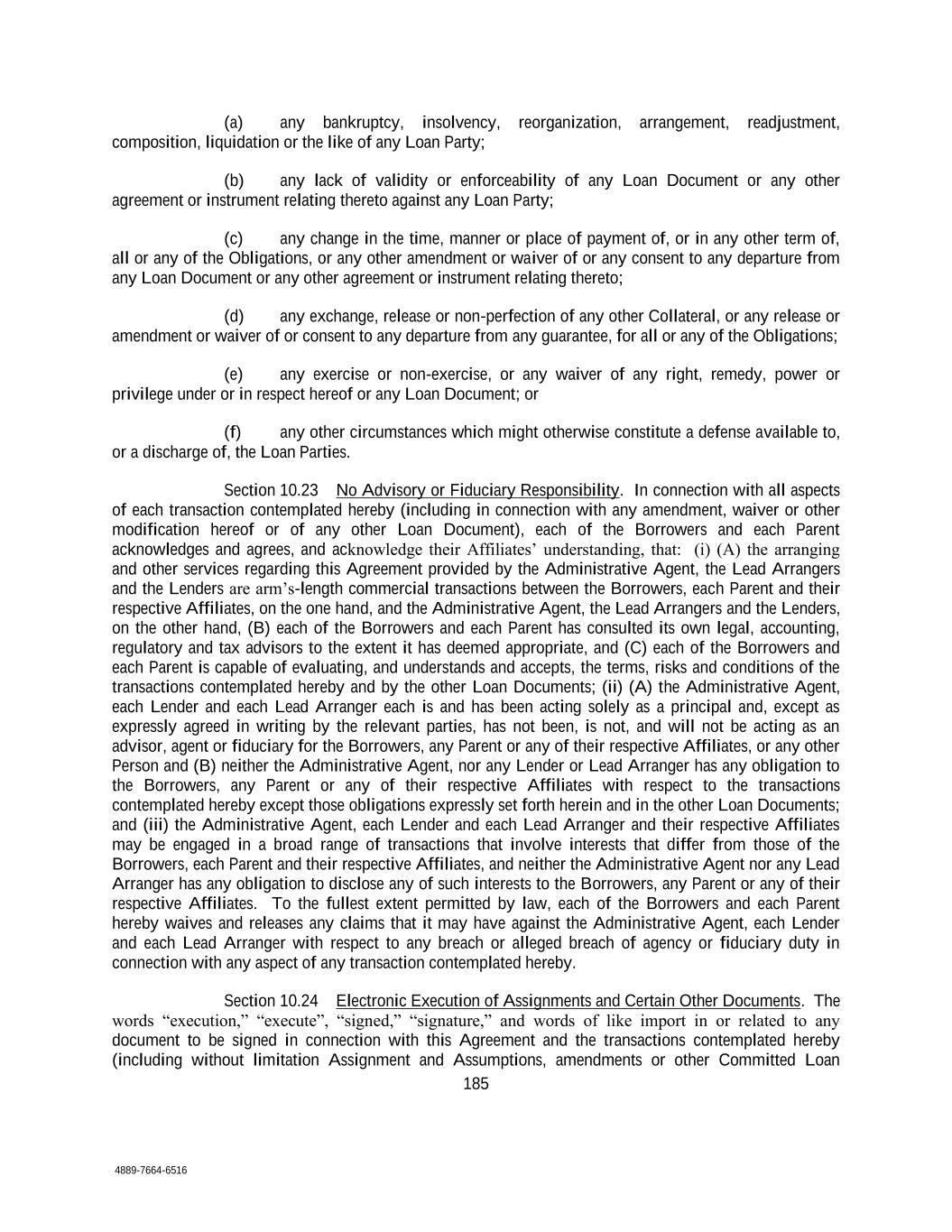 185 4889-7664-6516 (a) any bankruptcy, insolvency, reorganization, arrangement, readjustment, composition, liquidation or the like of any Loan Party; (b) any lack of validity or enforceability of any Loan Document or any other agreement or instrument relating thereto against any Loan Party; (c) any change in the time, manner or place of payment of, or in any other term of, all or any of the Obligations, or any other amendment or waiver of or any consent to any departure from any Loan Document or any other agreement or instrument relating thereto; (d) any exchange, release or non-perfection of any other Collateral, or any release or amendment or waiver of or consent to any departure from any guarantee, for all or any of the Obligations; (e) any exercise or non-exercise, or any waiver of any right, remedy, power or privilege under or in respect hereof or any Loan Document; or (f) any other circumstances which might otherwise constitute a defense available to, or a discharge of, the Loan Parties. Section 10.23 No Advisory or Fiduciary Responsibility. In connection with all aspects of each transaction contemplated hereby (including in connection with any amendment, waiver or other modification hereof or of any other Loan Document), each of the Borrowers and each Parent acknowledges and agrees, and acknowledge their Affiliates’ understanding, that: (i) (A) the arranging and other services regarding this Agreement provided by the Administrative Agent, the Lead Arrangers and the Lenders are arm’s-length commercial transactions between the Borrowers, each Parent and their respective Affiliates, on the one hand, and the Administrative Agent, the Lead Arrangers and the Lenders, on the other hand, (B) each of the Borrowers and each Parent has consulted its own legal, accounting, regulatory and tax advisors to the extent it has deemed appropriate, and (C) each of the Borrowers and each Parent is capable of evaluating, and understands and accepts, the terms, risks and conditions of the transactions contemplated hereby and by the other Loan Documents; (ii) (A) the Administrative Agent, each Lender and each Lead Arranger each is and has been acting solely as a principal and, except as expressly agreed in writing by the relevant parties, has not been, is not, and will not be acting as an advisor, agent or fiduciary for the Borrowers, any Parent or any of their respective Affiliates, or any other Person and (B) neither the Administrative Agent, nor any Lender or Lead Arranger has any obligation to the Borrowers, any Parent or any of their respective Affiliates with respect to the transactions contemplated hereby except those obligations expressly set forth herein and in the other Loan Documents; and (iii) the Administrative Agent, each Lender and each Lead Arranger and their respective Affiliates may be engaged in a broad range of transactions that involve interests that differ from those of the Borrowers, each Parent and their respective Affiliates, and neither the Administrative Agent nor any Lead Arranger has any obligation to disclose any of such interests to the Borrowers, any Parent or any of their respective Affiliates. To the fullest extent permitted by law, each of the Borrowers and each Parent hereby waives and releases any claims that it may have against the Administrative Agent, each Lender and each Lead Arranger with respect to any breach or alleged breach of agency or fiduciary duty in connection with any aspect of any transaction contemplated hereby. Section 10.24 Electronic Execution of Assignments and Certain Other Documents. The words “execution,” “execute”, “signed,” “signature,” and words of like import in or related to any document to be signed in connection with this Agreement and the transactions contemplated hereby (including without limitation Assignment and Assumptions, amendments or other Committed Loan