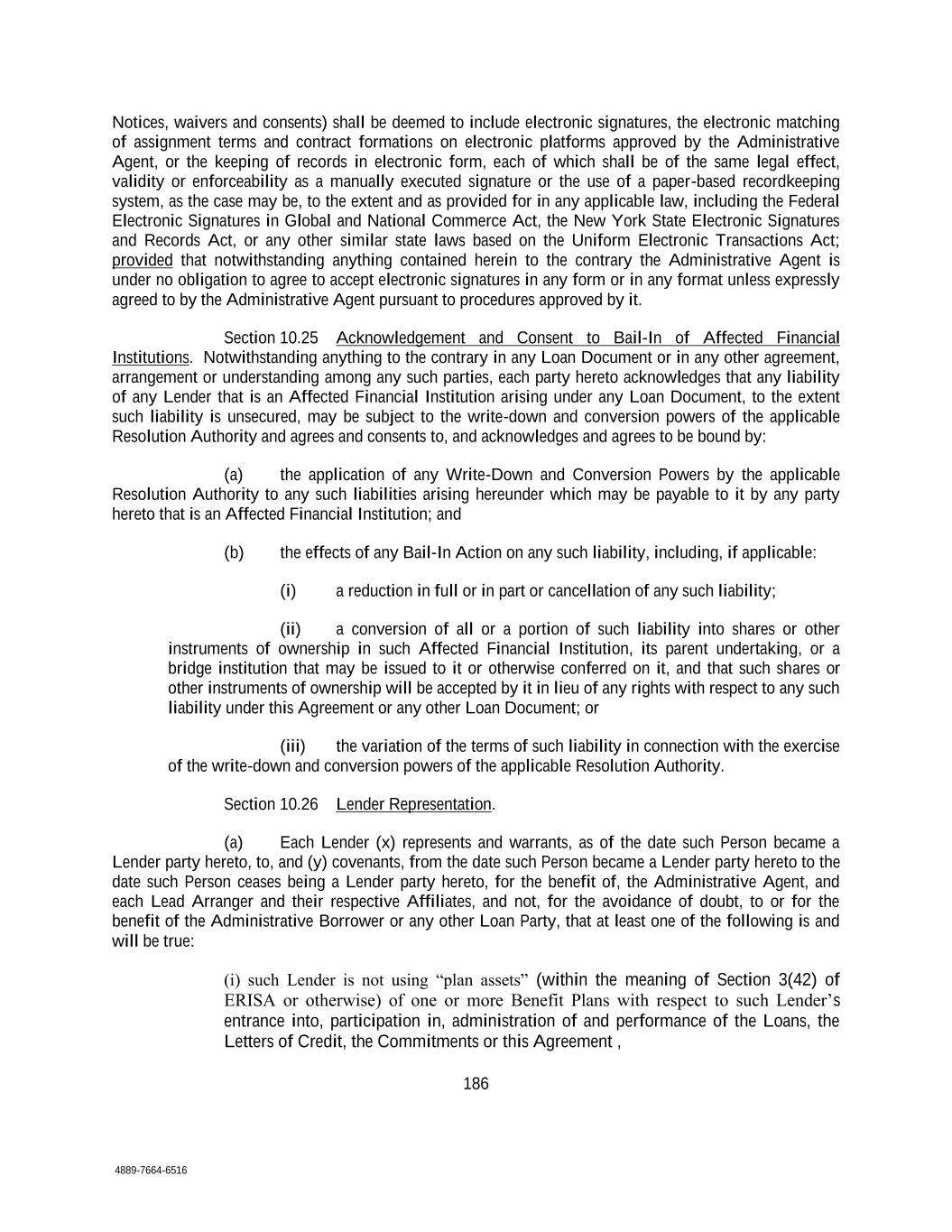 186 4889-7664-6516 Notices, waivers and consents) shall be deemed to include electronic signatures, the electronic matching of assignment terms and contract formations on electronic platforms approved by the Administrative Agent, or the keeping of records in electronic form, each of which shall be of the same legal effect, validity or enforceability as a manually executed signature or the use of a paper-based recordkeeping system, as the case may be, to the extent and as provided for in any applicable law, including the Federal Electronic Signatures in Global and National Commerce Act, the New York State Electronic Signatures and Records Act, or any other similar state laws based on the Uniform Electronic Transactions Act; provided that notwithstanding anything contained herein to the contrary the Administrative Agent is under no obligation to agree to accept electronic signatures in any form or in any format unless expressly agreed to by the Administrative Agent pursuant to procedures approved by it. Section 10.25 Acknowledgement and Consent to Bail-In of Affected Financial Institutions. Notwithstanding anything to the contrary in any Loan Document or in any other agreement, arrangement or understanding among any such parties, each party hereto acknowledges that any liability of any Lender that is an Affected Financial Institution arising under any Loan Document, to the extent such liability is unsecured, may be subject to the write-down and conversion powers of the applicable Resolution Authority and agrees and consents to, and acknowledges and agrees to be bound by: (a) the application of any Write-Down and Conversion Powers by the applicable Resolution Authority to any such liabilities arising hereunder which may be payable to it by any party hereto that is an Affected Financial Institution; and (b) the effects of any Bail-In Action on any such liability, including, if applicable: (i) a reduction in full or in part or cancellation of any such liability; (ii) a conversion of all or a portion of such liability into shares or other instruments of ownership in such Affected Financial Institution, its parent undertaking, or a bridge institution that may be issued to it or otherwise conferred on it, and that such shares or other instruments of ownership will be accepted by it in lieu of any rights with respect to any such liability under this Agreement or any other Loan Document; or (iii) the variation of the terms of such liability in connection with the exercise of the write-down and conversion powers of the applicable Resolution Authority. Section 10.26 Lender Representation. (a) Each Lender (x) represents and warrants, as of the date such Person became a Lender party hereto, to, and (y) covenants, from the date such Person became a Lender party hereto to the date such Person ceases being a Lender party hereto, for the benefit of, the Administrative Agent, and each Lead Arranger and their respective Affiliates, and not, for the avoidance of doubt, to or for the benefit of the Administrative Borrower or any other Loan Party, that at least one of the following is and will be true: (i) such Lender is not using “plan assets” (within the meaning of Section 3(42) of ERISA or otherwise) of one or more Benefit Plans with respect to such Lender’s entrance into, participation in, administration of and performance of the Loans, the Letters of Credit, the Commitments or this Agreement ,