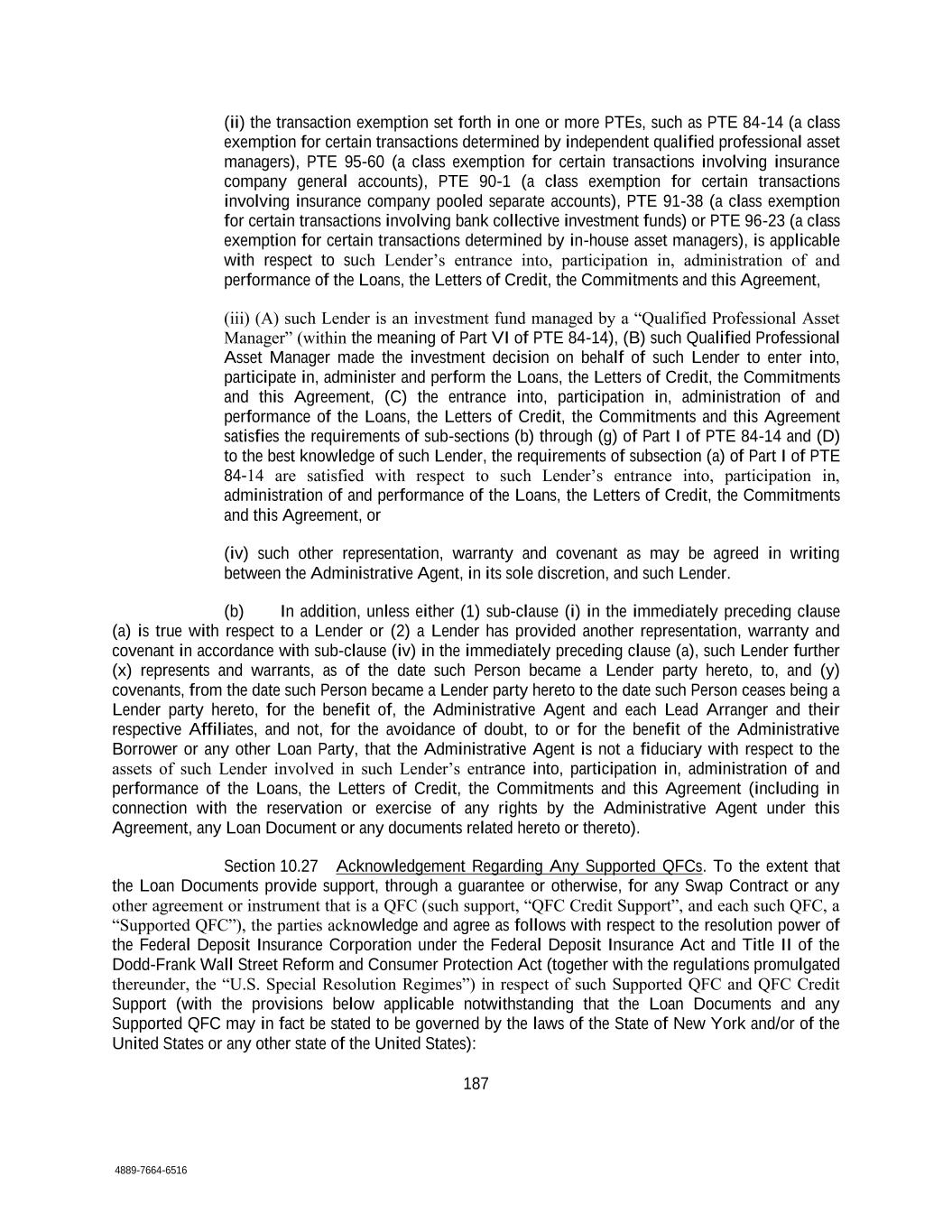 187 4889-7664-6516 (ii) the transaction exemption set forth in one or more PTEs, such as PTE 84-14 (a class exemption for certain transactions determined by independent qualified professional asset managers), PTE 95-60 (a class exemption for certain transactions involving insurance company general accounts), PTE 90-1 (a class exemption for certain transactions involving insurance company pooled separate accounts), PTE 91-38 (a class exemption for certain transactions involving bank collective investment funds) or PTE 96-23 (a class exemption for certain transactions determined by in-house asset managers), is applicable with respect to such Lender’s entrance into, participation in, administration of and performance of the Loans, the Letters of Credit, the Commitments and this Agreement, (iii) (A) such Lender is an investment fund managed by a “Qualified Professional Asset Manager” (within the meaning of Part VI of PTE 84-14), (B) such Qualified Professional Asset Manager made the investment decision on behalf of such Lender to enter into, participate in, administer and perform the Loans, the Letters of Credit, the Commitments and this Agreement, (C) the entrance into, participation in, administration of and performance of the Loans, the Letters of Credit, the Commitments and this Agreement satisfies the requirements of sub-sections (b) through (g) of Part I of PTE 84-14 and (D) to the best knowledge of such Lender, the requirements of subsection (a) of Part I of PTE 84-14 are satisfied with respect to such Lender’s entrance into, participation in, administration of and performance of the Loans, the Letters of Credit, the Commitments and this Agreement, or (iv) such other representation, warranty and covenant as may be agreed in writing between the Administrative Agent, in its sole discretion, and such Lender. (b) In addition, unless either (1) sub-clause (i) in the immediately preceding clause (a) is true with respect to a Lender or (2) a Lender has provided another representation, warranty and covenant in accordance with sub-clause (iv) in the immediately preceding clause (a), such Lender further (x) represents and warrants, as of the date such Person became a Lender party hereto, to, and (y) covenants, from the date such Person became a Lender party hereto to the date such Person ceases being a Lender party hereto, for the benefit of, the Administrative Agent and each Lead Arranger and their respective Affiliates, and not, for the avoidance of doubt, to or for the benefit of the Administrative Borrower or any other Loan Party, that the Administrative Agent is not a fiduciary with respect to the assets of such Lender involved in such Lender’s entrance into, participation in, administration of and performance of the Loans, the Letters of Credit, the Commitments and this Agreement (including in connection with the reservation or exercise of any rights by the Administrative Agent under this Agreement, any Loan Document or any documents related hereto or thereto). Section 10.27 Acknowledgement Regarding Any Supported QFCs. To the extent that the Loan Documents provide support, through a guarantee or otherwise, for any Swap Contract or any other agreement or instrument that is a QFC (such support, “QFC Credit Support”, and each such QFC, a “Supported QFC”), the parties acknowledge and agree as follows with respect to the resolution power of the Federal Deposit Insurance Corporation under the Federal Deposit Insurance Act and Title II of the Dodd-Frank Wall Street Reform and Consumer Protection Act (together with the regulations promulgated thereunder, the “U.S. Special Resolution Regimes”) in respect of such Supported QFC and QFC Credit Support (with the provisions below applicable notwithstanding that the Loan Documents and any Supported QFC may in fact be stated to be governed by the laws of the State of New York and/or of the United States or any other state of the United States):