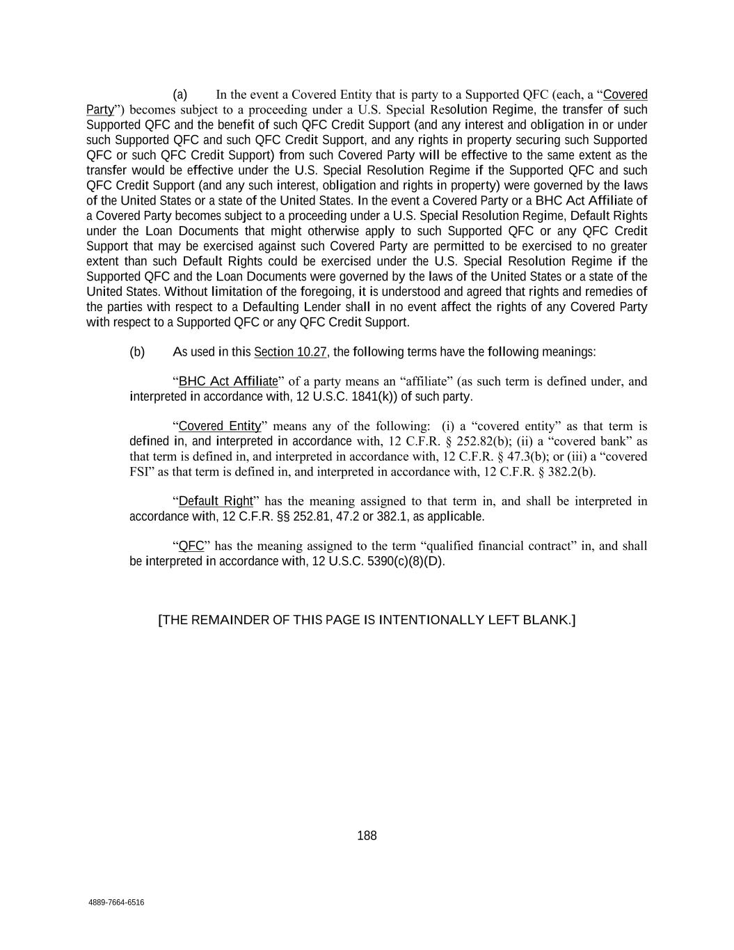 188 4889-7664-6516 (a) In the event a Covered Entity that is party to a Supported QFC (each, a “Covered Party”) becomes subject to a proceeding under a U.S. Special Resolution Regime, the transfer of such Supported QFC and the benefit of such QFC Credit Support (and any interest and obligation in or under such Supported QFC and such QFC Credit Support, and any rights in property securing such Supported QFC or such QFC Credit Support) from such Covered Party will be effective to the same extent as the transfer would be effective under the U.S. Special Resolution Regime if the Supported QFC and such QFC Credit Support (and any such interest, obligation and rights in property) were governed by the laws of the United States or a state of the United States. In the event a Covered Party or a BHC Act Affiliate of a Covered Party becomes subject to a proceeding under a U.S. Special Resolution Regime, Default Rights under the Loan Documents that might otherwise apply to such Supported QFC or any QFC Credit Support that may be exercised against such Covered Party are permitted to be exercised to no greater extent than such Default Rights could be exercised under the U.S. Special Resolution Regime if the Supported QFC and the Loan Documents were governed by the laws of the United States or a state of the United States. Without limitation of the foregoing, it is understood and agreed that rights and remedies of the parties with respect to a Defaulting Lender shall in no event affect the rights of any Covered Party with respect to a Supported QFC or any QFC Credit Support. (b) As used in this Section 10.27, the following terms have the following meanings: “BHC Act Affiliate” of a party means an “affiliate” (as such term is defined under, and interpreted in accordance with, 12 U.S.C. 1841(k)) of such party. “Covered Entity” means any of the following: (i) a “covered entity” as that term is defined in, and interpreted in accordance with, 12 C.F.R. § 252.82(b); (ii) a “covered bank” as that term is defined in, and interpreted in accordance with, 12 C.F.R. § 47.3(b); or (iii) a “covered FSI” as that term is defined in, and interpreted in accordance with, 12 C.F.R. § 382.2(b). “Default Right” has the meaning assigned to that term in, and shall be interpreted in accordance with, 12 C.F.R. §§ 252.81, 47.2 or 382.1, as applicable. “QFC” has the meaning assigned to the term “qualified financial contract” in, and shall be interpreted in accordance with, 12 U.S.C. 5390(c)(8)(D). [THE REMAINDER OF THIS PAGE IS INTENTIONALLY LEFT BLANK.]