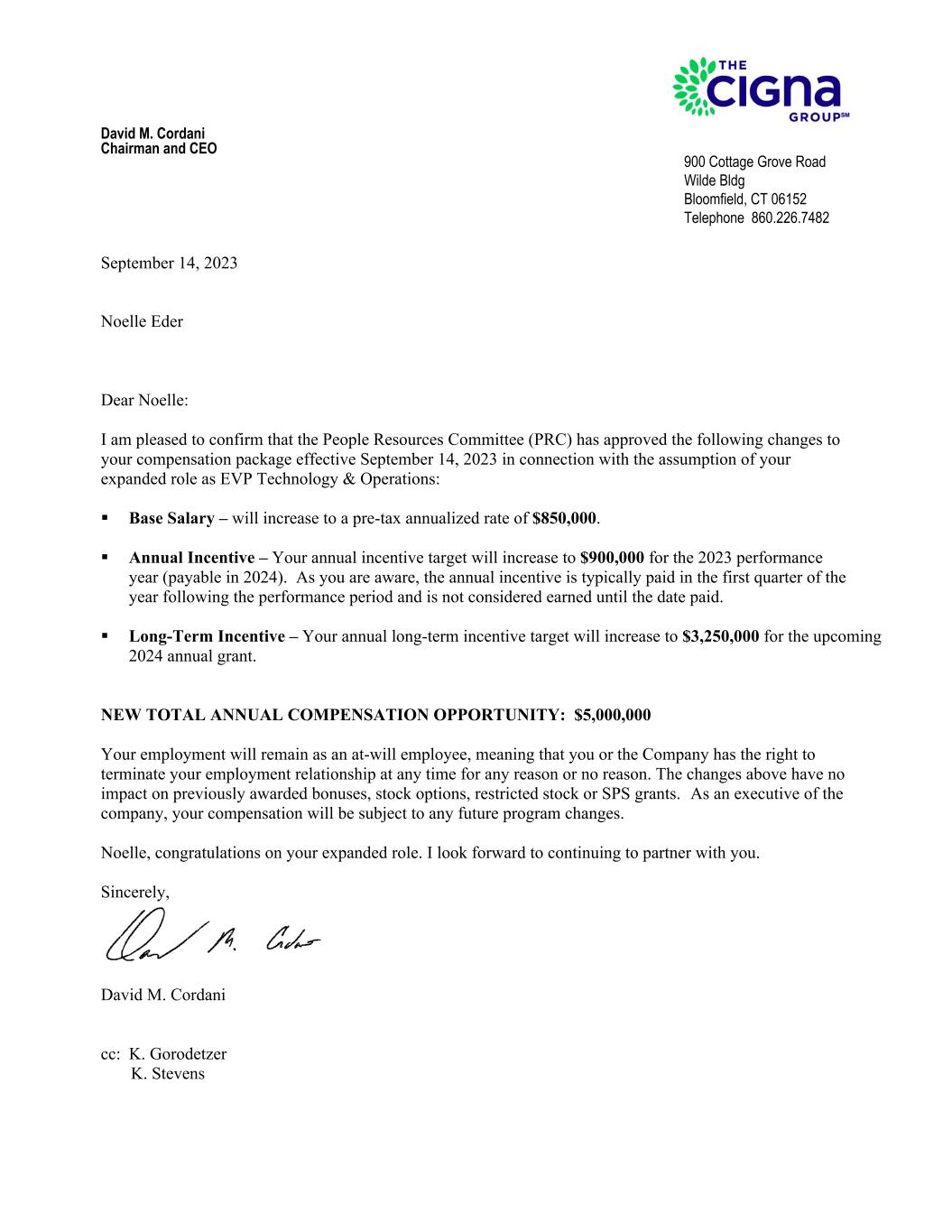 David M. Cordani Chairman and CEO September 14, 2023 Noelle Eder Dear Noelle: I am pleased to confirm that the People Resources Committee (PRC) has approved the following changes to your compensation package effective September 14, 2023 in connection with the assumption of your expanded role as EVP Technology & Operations:  Base Salary – will increase to a pre-tax annualized rate of $850,000.  Annual Incentive – Your annual incentive target will increase to $900,000 for the 2023 performance year (payable in 2024). As you are aware, the annual incentive is typically paid in the first quarter of the year following the performance period and is not considered earned until the date paid.  Long-Term Incentive – Your annual long-term incentive target will increase to $3,250,000 for the upcoming 2024 annual grant. NEW TOTAL ANNUAL COMPENSATION OPPORTUNITY: $5,000,000 Your employment will remain as an at-will employee, meaning that you or the Company has the right to terminate your employment relationship at any time for any reason or no reason. The changes above have no impact on previously awarded bonuses, stock options, restricted stock or SPS grants. As an executive of the company, your compensation will be subject to any future program changes. Noelle, congratulations on your expanded role. I look forward to continuing to partner with you. Sincerely, David M. Cordani cc: K. Gorodetzer K. Stevens 900 Cottage Grove Road Wilde Bldg Bloomfield, CT 06152 Telephone 860.226.7482