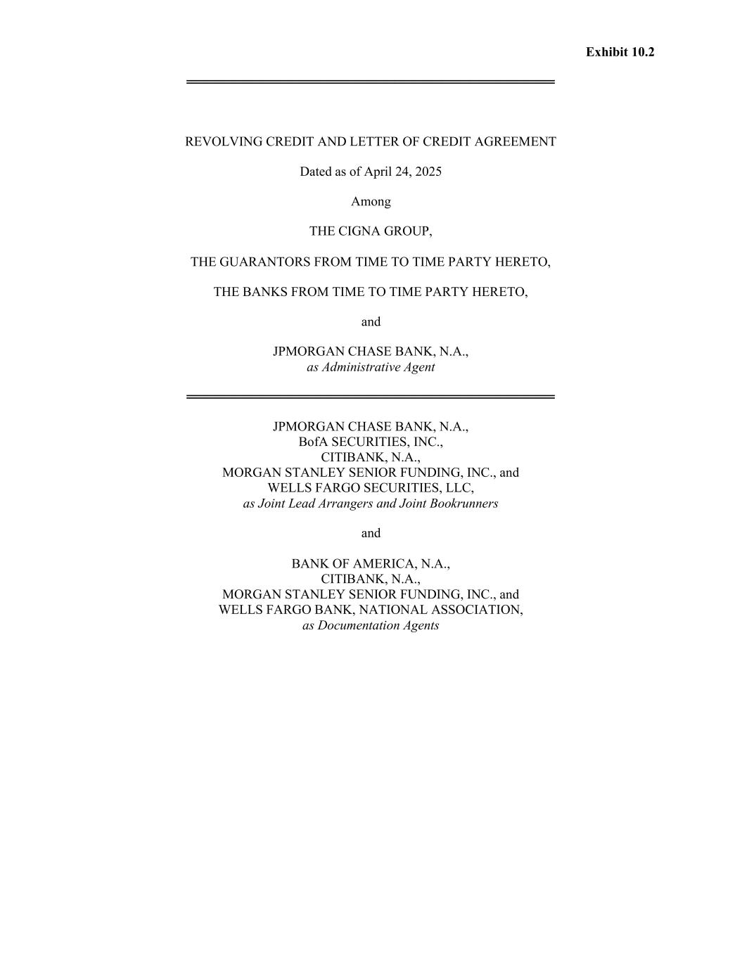 Exhibit 10.2 ═══════════════════════════════════════ REVOLVING CREDIT AND LETTER OF CREDIT AGREEMENT Dated as of April 24, 2025 Among THE CIGNA GROUP, THE GUARANTORS FROM TIME TO TIME PARTY HERETO, THE BANKS FROM TIME TO TIME PARTY HERETO, and JPMORGAN CHASE BANK, N.A., as Administrative Agent ═══════════════════════════════════════ JPMORGAN CHASE BANK, N.A., BofA SECURITIES, INC., CITIBANK, N.A., MORGAN STANLEY SENIOR FUNDING, INC., and WELLS FARGO SECURITIES, LLC, as Joint Lead Arrangers and Joint Bookrunners and BANK OF AMERICA, N.A., CITIBANK, N.A., MORGAN STANLEY SENIOR FUNDING, INC., and WELLS FARGO BANK, NATIONAL ASSOCIATION, as Documentation Agents
