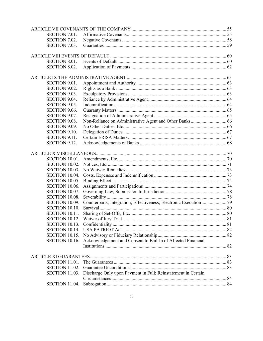 ii ARTICLE VII COVENANTS OF THE COMPANY ................................................................................ 55 SECTION 7.01. Affirmative Covenants .................................................................................... 55 SECTION 7.02. Negative Covenants ........................................................................................ 58 SECTION 7.03. Guaranties ....................................................................................................... 59 ARTICLE VIII EVENTS OF DEFAULT .................................................................................................. 60 SECTION 8.01. Events of Default ............................................................................................ 60 SECTION 8.02. Application of Payments ................................................................................. 62 ARTICLE IX THE ADMINISTRATIVE AGENT .................................................................................... 63 SECTION 9.01. Appointment and Authority ............................................................................ 63 SECTION 9.02. Rights as a Bank ............................................................................................. 63 SECTION 9.03. Exculpatory Provisions ................................................................................... 63 SECTION 9.04. Reliance by Administrative Agent .................................................................. 64 SECTION 9.05. Indemnification ............................................................................................... 64 SECTION 9.06. Guaranty Matters ............................................................................................ 65 SECTION 9.07. Resignation of Administrative Agent ............................................................. 65 SECTION 9.08. Non-Reliance on Administrative Agent and Other Banks .............................. 66 SECTION 9.09. No Other Duties, Etc. ...................................................................................... 66 SECTION 9.10. Delegation of Duties ....................................................................................... 67 SECTION 9.11. Certain ERISA Matters ................................................................................... 67 SECTION 9.12. Acknowledgements of Banks ......................................................................... 68 ARTICLE X MISCELLANEOUS.............................................................................................................. 70 SECTION 10.01. Amendments, Etc. ........................................................................................... 70 SECTION 10.02. Notices, Etc. .................................................................................................... 71 SECTION 10.03. No Waiver; Remedies ..................................................................................... 73 SECTION 10.04. Costs, Expenses and Indemnification ............................................................. 73 SECTION 10.05. Binding Effect ................................................................................................. 74 SECTION 10.06. Assignments and Participations ...................................................................... 74 SECTION 10.07. Governing Law; Submission to Jurisdiction. .................................................. 78 SECTION 10.08. Severability ..................................................................................................... 78 SECTION 10.09. Counterparts; Integration; Effectiveness; Electronic Execution ..................... 79 SECTION 10.10. Survival ........................................................................................................... 80 SECTION 10.11. Sharing of Set-Offs, Etc. ................................................................................. 80 SECTION 10.12. Waiver of Jury Trial ........................................................................................ 81 SECTION 10.13. Confidentiality ................................................................................................ 81 SECTION 10.14. USA PATRIOT Act ........................................................................................ 82 SECTION 10.15. No Advisory or Fiduciary Relationship .......................................................... 82 SECTION 10.16. Acknowledgement and Consent to Bail-In of Affected Financial Institutions ...................................................................................................... 82 ARTICLE XI GUARANTEES ................................................................................................................... 83 SECTION 11.01. The Guarantees ............................................................................................... 83 SECTION 11.02. Guarantee Unconditional ................................................................................ 83 SECTION 11.03. Discharge Only upon Payment in Full; Reinstatement in Certain Circumstances ................................................................................................. 84 SECTION 11.04. Subrogation ..................................................................................................... 84