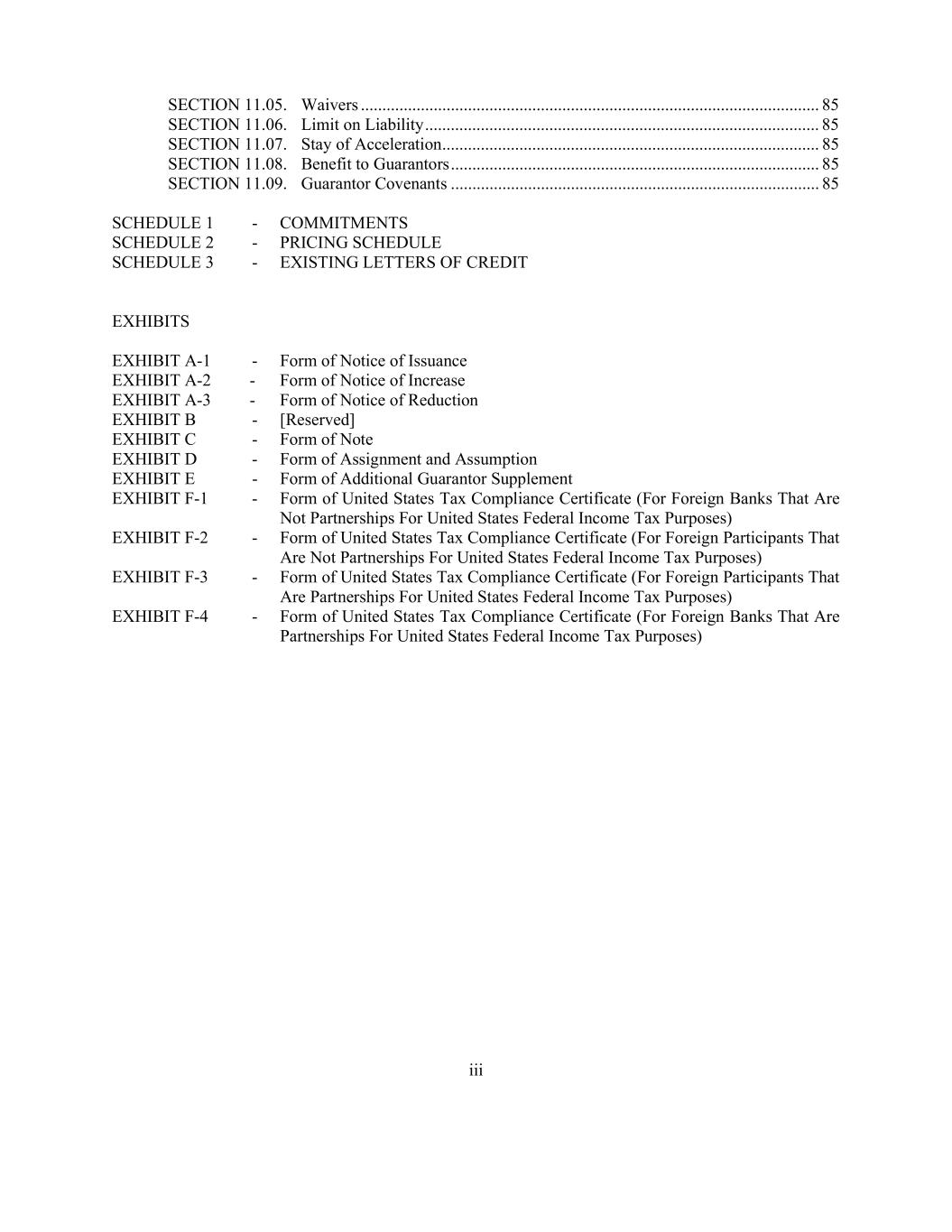 iii SECTION 11.05. Waivers ........................................................................................................... 85 SECTION 11.06. Limit on Liability ............................................................................................ 85 SECTION 11.07. Stay of Acceleration ........................................................................................ 85 SECTION 11.08. Benefit to Guarantors ...................................................................................... 85 SECTION 11.09. Guarantor Covenants ...................................................................................... 85 SCHEDULE 1 - COMMITMENTS SCHEDULE 2 - PRICING SCHEDULE SCHEDULE 3 - EXISTING LETTERS OF CREDIT EXHIBITS EXHIBIT A-1 - Form of Notice of Issuance EXHIBIT A-2 - Form of Notice of Increase EXHIBIT A-3 - Form of Notice of Reduction EXHIBIT B - [Reserved] EXHIBIT C - Form of Note EXHIBIT D - Form of Assignment and Assumption EXHIBIT E - Form of Additional Guarantor Supplement EXHIBIT F-1 - Form of United States Tax Compliance Certificate (For Foreign Banks That Are Not Partnerships For United States Federal Income Tax Purposes) EXHIBIT F-2 - Form of United States Tax Compliance Certificate (For Foreign Participants That Are Not Partnerships For United States Federal Income Tax Purposes) EXHIBIT F-3 - Form of United States Tax Compliance Certificate (For Foreign Participants That Are Partnerships For United States Federal Income Tax Purposes) EXHIBIT F-4 - Form of United States Tax Compliance Certificate (For Foreign Banks That Are Partnerships For United States Federal Income Tax Purposes)