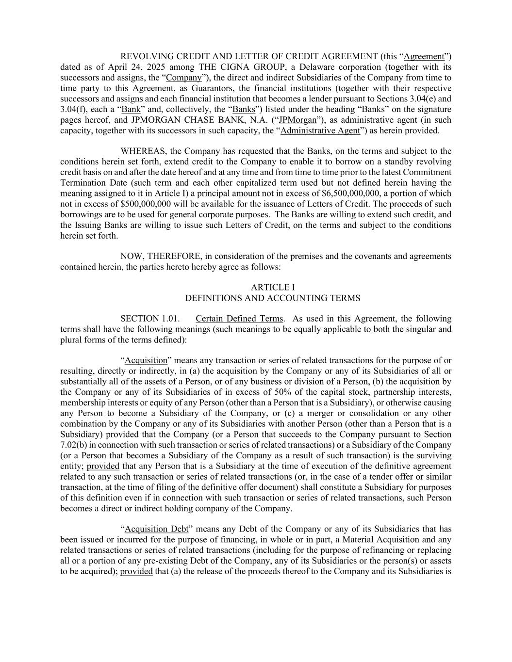 REVOLVING CREDIT AND LETTER OF CREDIT AGREEMENT (this “Agreement”) dated as of April 24, 2025 among THE CIGNA GROUP, a Delaware corporation (together with its successors and assigns, the “Company”), the direct and indirect Subsidiaries of the Company from time to time party to this Agreement, as Guarantors, the financial institutions (together with their respective successors and assigns and each financial institution that becomes a lender pursuant to Sections 3.04(e) and 3.04(f), each a “Bank” and, collectively, the “Banks”) listed under the heading “Banks” on the signature pages hereof, and JPMORGAN CHASE BANK, N.A. (“JPMorgan”), as administrative agent (in such capacity, together with its successors in such capacity, the “Administrative Agent”) as herein provided. WHEREAS, the Company has requested that the Banks, on the terms and subject to the conditions herein set forth, extend credit to the Company to enable it to borrow on a standby revolving credit basis on and after the date hereof and at any time and from time to time prior to the latest Commitment Termination Date (such term and each other capitalized term used but not defined herein having the meaning assigned to it in Article I) a principal amount not in excess of $6,500,000,000, a portion of which not in excess of $500,000,000 will be available for the issuance of Letters of Credit. The proceeds of such borrowings are to be used for general corporate purposes. The Banks are willing to extend such credit, and the Issuing Banks are willing to issue such Letters of Credit, on the terms and subject to the conditions herein set forth. NOW, THEREFORE, in consideration of the premises and the covenants and agreements contained herein, the parties hereto hereby agree as follows: ARTICLE I DEFINITIONS AND ACCOUNTING TERMS SECTION 1.01. Certain Defined Terms. As used in this Agreement, the following terms shall have the following meanings (such meanings to be equally applicable to both the singular and plural forms of the terms defined): “Acquisition” means any transaction or series of related transactions for the purpose of or resulting, directly or indirectly, in (a) the acquisition by the Company or any of its Subsidiaries of all or substantially all of the assets of a Person, or of any business or division of a Person, (b) the acquisition by the Company or any of its Subsidiaries of in excess of 50% of the capital stock, partnership interests, membership interests or equity of any Person (other than a Person that is a Subsidiary), or otherwise causing any Person to become a Subsidiary of the Company, or (c) a merger or consolidation or any other combination by the Company or any of its Subsidiaries with another Person (other than a Person that is a Subsidiary) provided that the Company (or a Person that succeeds to the Company pursuant to Section 7.02(b) in connection with such transaction or series of related transactions) or a Subsidiary of the Company (or a Person that becomes a Subsidiary of the Company as a result of such transaction) is the surviving entity; provided that any Person that is a Subsidiary at the time of execution of the definitive agreement related to any such transaction or series of related transactions (or, in the case of a tender offer or similar transaction, at the time of filing of the definitive offer document) shall constitute a Subsidiary for purposes of this definition even if in connection with such transaction or series of related transactions, such Person becomes a direct or indirect holding company of the Company. “Acquisition Debt” means any Debt of the Company or any of its Subsidiaries that has been issued or incurred for the purpose of financing, in whole or in part, a Material Acquisition and any related transactions or series of related transactions (including for the purpose of refinancing or replacing all or a portion of any pre-existing Debt of the Company, any of its Subsidiaries or the person(s) or assets to be acquired); provided that (a) the release of the proceeds thereof to the Company and its Subsidiaries is