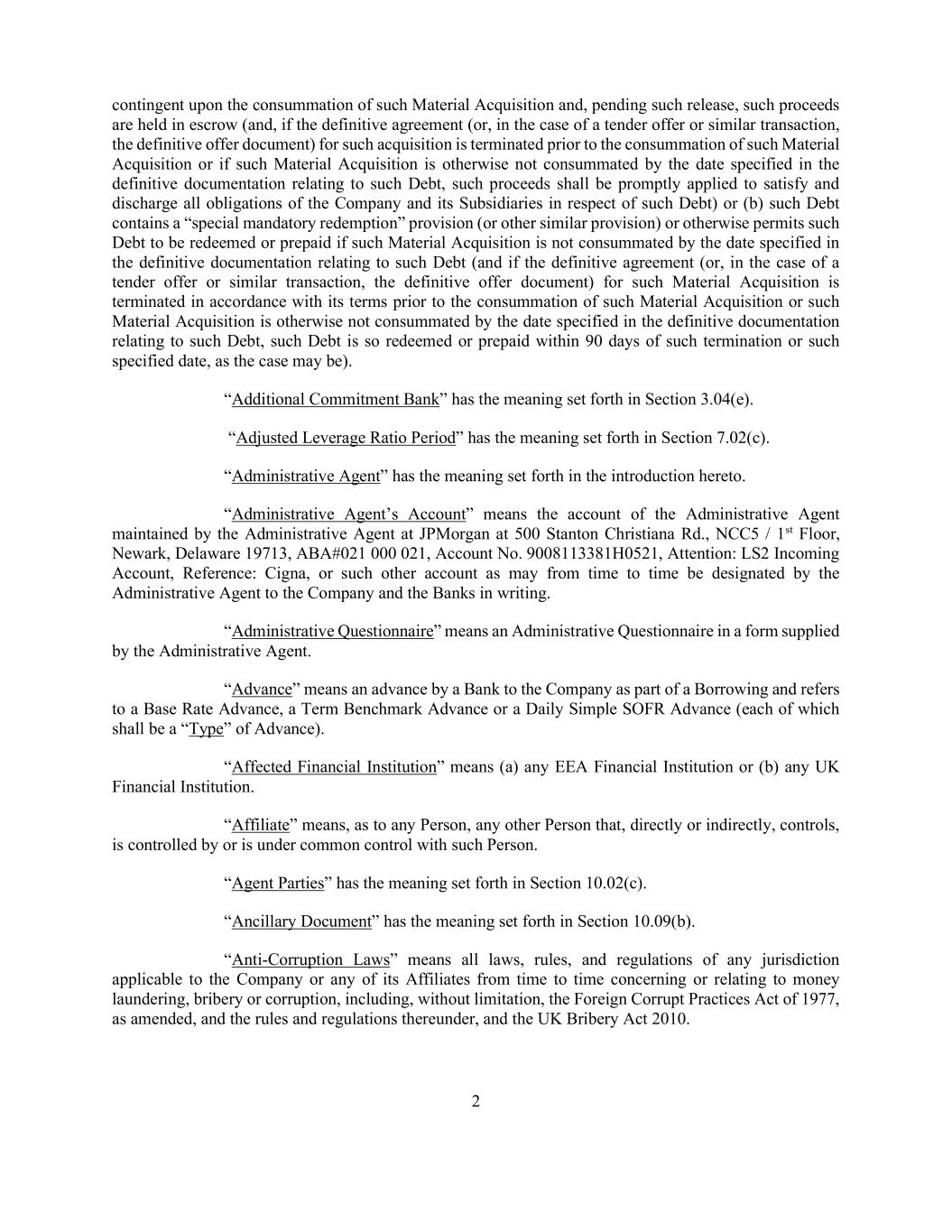2 contingent upon the consummation of such Material Acquisition and, pending such release, such proceeds are held in escrow (and, if the definitive agreement (or, in the case of a tender offer or similar transaction, the definitive offer document) for such acquisition is terminated prior to the consummation of such Material Acquisition or if such Material Acquisition is otherwise not consummated by the date specified in the definitive documentation relating to such Debt, such proceeds shall be promptly applied to satisfy and discharge all obligations of the Company and its Subsidiaries in respect of such Debt) or (b) such Debt contains a “special mandatory redemption” provision (or other similar provision) or otherwise permits such Debt to be redeemed or prepaid if such Material Acquisition is not consummated by the date specified in the definitive documentation relating to such Debt (and if the definitive agreement (or, in the case of a tender offer or similar transaction, the definitive offer document) for such Material Acquisition is terminated in accordance with its terms prior to the consummation of such Material Acquisition or such Material Acquisition is otherwise not consummated by the date specified in the definitive documentation relating to such Debt, such Debt is so redeemed or prepaid within 90 days of such termination or such specified date, as the case may be). “Additional Commitment Bank” has the meaning set forth in Section 3.04(e). “Adjusted Leverage Ratio Period” has the meaning set forth in Section 7.02(c). “Administrative Agent” has the meaning set forth in the introduction hereto. “Administrative Agent’s Account” means the account of the Administrative Agent maintained by the Administrative Agent at JPMorgan at 500 Stanton Christiana Rd., NCC5 / 1st Floor, Newark, Delaware 19713, ABA#021 000 021, Account No. 9008113381H0521, Attention: LS2 Incoming Account, Reference: Cigna, or such other account as may from time to time be designated by the Administrative Agent to the Company and the Banks in writing. “Administrative Questionnaire” means an Administrative Questionnaire in a form supplied by the Administrative Agent. “Advance” means an advance by a Bank to the Company as part of a Borrowing and refers to a Base Rate Advance, a Term Benchmark Advance or a Daily Simple SOFR Advance (each of which shall be a “Type” of Advance). “Affected Financial Institution” means (a) any EEA Financial Institution or (b) any UK Financial Institution. “Affiliate” means, as to any Person, any other Person that, directly or indirectly, controls, is controlled by or is under common control with such Person. “Agent Parties” has the meaning set forth in Section 10.02(c). “Ancillary Document” has the meaning set forth in Section 10.09(b). “Anti-Corruption Laws” means all laws, rules, and regulations of any jurisdiction applicable to the Company or any of its Affiliates from time to time concerning or relating to money laundering, bribery or corruption, including, without limitation, the Foreign Corrupt Practices Act of 1977, as amended, and the rules and regulations thereunder, and the UK Bribery Act 2010.