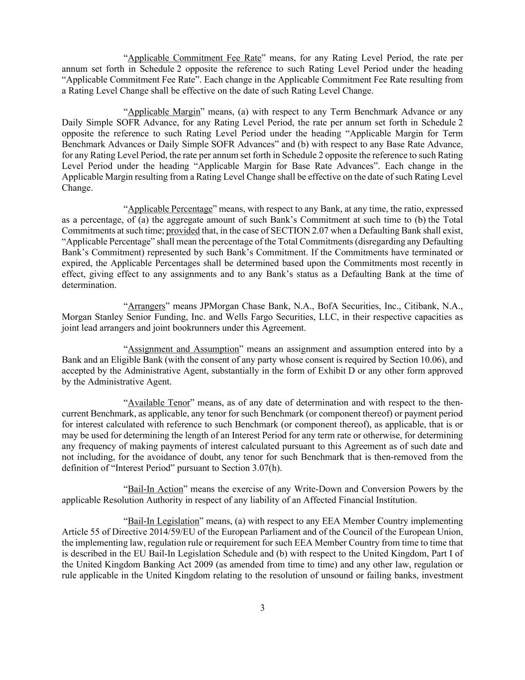 3 “Applicable Commitment Fee Rate” means, for any Rating Level Period, the rate per annum set forth in Schedule 2 opposite the reference to such Rating Level Period under the heading “Applicable Commitment Fee Rate”. Each change in the Applicable Commitment Fee Rate resulting from a Rating Level Change shall be effective on the date of such Rating Level Change. “Applicable Margin” means, (a) with respect to any Term Benchmark Advance or any Daily Simple SOFR Advance, for any Rating Level Period, the rate per annum set forth in Schedule 2 opposite the reference to such Rating Level Period under the heading “Applicable Margin for Term Benchmark Advances or Daily Simple SOFR Advances” and (b) with respect to any Base Rate Advance, for any Rating Level Period, the rate per annum set forth in Schedule 2 opposite the reference to such Rating Level Period under the heading “Applicable Margin for Base Rate Advances”. Each change in the Applicable Margin resulting from a Rating Level Change shall be effective on the date of such Rating Level Change. “Applicable Percentage” means, with respect to any Bank, at any time, the ratio, expressed as a percentage, of (a) the aggregate amount of such Bank’s Commitment at such time to (b) the Total Commitments at such time; provided that, in the case of SECTION 2.07 when a Defaulting Bank shall exist, “Applicable Percentage” shall mean the percentage of the Total Commitments (disregarding any Defaulting Bank’s Commitment) represented by such Bank’s Commitment. If the Commitments have terminated or expired, the Applicable Percentages shall be determined based upon the Commitments most recently in effect, giving effect to any assignments and to any Bank’s status as a Defaulting Bank at the time of determination. “Arrangers” means JPMorgan Chase Bank, N.A., BofA Securities, Inc., Citibank, N.A., Morgan Stanley Senior Funding, Inc. and Wells Fargo Securities, LLC, in their respective capacities as joint lead arrangers and joint bookrunners under this Agreement. “Assignment and Assumption” means an assignment and assumption entered into by a Bank and an Eligible Bank (with the consent of any party whose consent is required by Section 10.06), and accepted by the Administrative Agent, substantially in the form of Exhibit D or any other form approved by the Administrative Agent. “Available Tenor” means, as of any date of determination and with respect to the then- current Benchmark, as applicable, any tenor for such Benchmark (or component thereof) or payment period for interest calculated with reference to such Benchmark (or component thereof), as applicable, that is or may be used for determining the length of an Interest Period for any term rate or otherwise, for determining any frequency of making payments of interest calculated pursuant to this Agreement as of such date and not including, for the avoidance of doubt, any tenor for such Benchmark that is then-removed from the definition of “Interest Period” pursuant to Section 3.07(h). “Bail-In Action” means the exercise of any Write-Down and Conversion Powers by the applicable Resolution Authority in respect of any liability of an Affected Financial Institution. “Bail-In Legislation” means, (a) with respect to any EEA Member Country implementing Article 55 of Directive 2014/59/EU of the European Parliament and of the Council of the European Union, the implementing law, regulation rule or requirement for such EEA Member Country from time to time that is described in the EU Bail-In Legislation Schedule and (b) with respect to the United Kingdom, Part I of the United Kingdom Banking Act 2009 (as amended from time to time) and any other law, regulation or rule applicable in the United Kingdom relating to the resolution of unsound or failing banks, investment