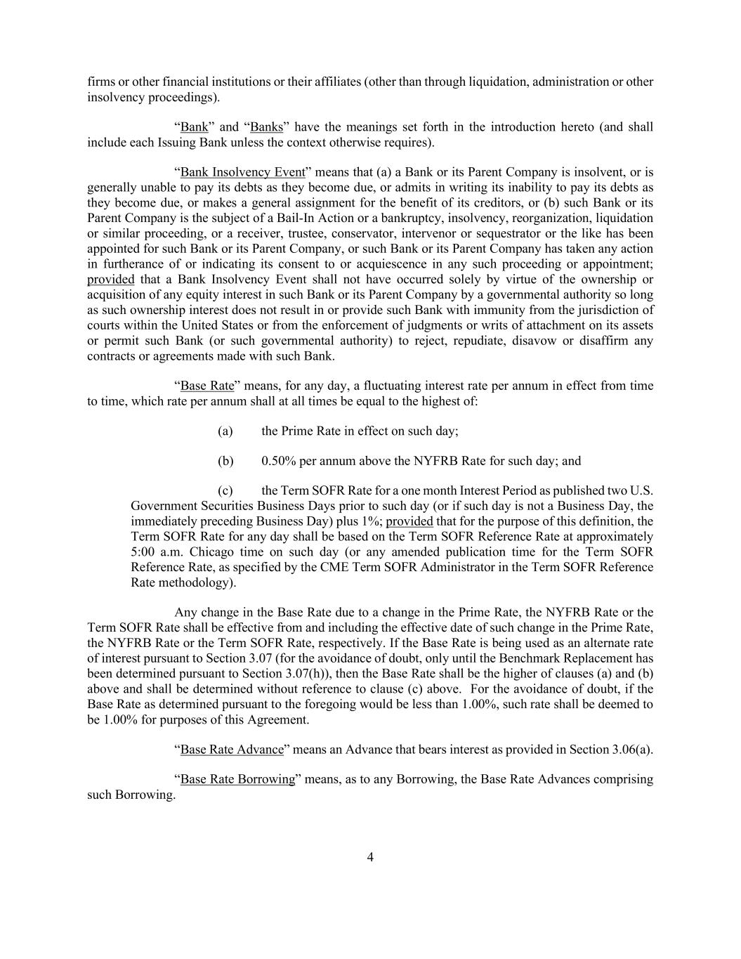 4 firms or other financial institutions or their affiliates (other than through liquidation, administration or other insolvency proceedings). “Bank” and “Banks” have the meanings set forth in the introduction hereto (and shall include each Issuing Bank unless the context otherwise requires). “Bank Insolvency Event” means that (a) a Bank or its Parent Company is insolvent, or is generally unable to pay its debts as they become due, or admits in writing its inability to pay its debts as they become due, or makes a general assignment for the benefit of its creditors, or (b) such Bank or its Parent Company is the subject of a Bail-In Action or a bankruptcy, insolvency, reorganization, liquidation or similar proceeding, or a receiver, trustee, conservator, intervenor or sequestrator or the like has been appointed for such Bank or its Parent Company, or such Bank or its Parent Company has taken any action in furtherance of or indicating its consent to or acquiescence in any such proceeding or appointment; provided that a Bank Insolvency Event shall not have occurred solely by virtue of the ownership or acquisition of any equity interest in such Bank or its Parent Company by a governmental authority so long as such ownership interest does not result in or provide such Bank with immunity from the jurisdiction of courts within the United States or from the enforcement of judgments or writs of attachment on its assets or permit such Bank (or such governmental authority) to reject, repudiate, disavow or disaffirm any contracts or agreements made with such Bank. “Base Rate” means, for any day, a fluctuating interest rate per annum in effect from time to time, which rate per annum shall at all times be equal to the highest of: (a) the Prime Rate in effect on such day; (b) 0.50% per annum above the NYFRB Rate for such day; and (c) the Term SOFR Rate for a one month Interest Period as published two U.S. Government Securities Business Days prior to such day (or if such day is not a Business Day, the immediately preceding Business Day) plus 1%; provided that for the purpose of this definition, the Term SOFR Rate for any day shall be based on the Term SOFR Reference Rate at approximately 5:00 a.m. Chicago time on such day (or any amended publication time for the Term SOFR Reference Rate, as specified by the CME Term SOFR Administrator in the Term SOFR Reference Rate methodology). Any change in the Base Rate due to a change in the Prime Rate, the NYFRB Rate or the Term SOFR Rate shall be effective from and including the effective date of such change in the Prime Rate, the NYFRB Rate or the Term SOFR Rate, respectively. If the Base Rate is being used as an alternate rate of interest pursuant to Section 3.07 (for the avoidance of doubt, only until the Benchmark Replacement has been determined pursuant to Section 3.07(h)), then the Base Rate shall be the higher of clauses (a) and (b) above and shall be determined without reference to clause (c) above. For the avoidance of doubt, if the Base Rate as determined pursuant to the foregoing would be less than 1.00%, such rate shall be deemed to be 1.00% for purposes of this Agreement. “Base Rate Advance” means an Advance that bears interest as provided in Section 3.06(a). “Base Rate Borrowing” means, as to any Borrowing, the Base Rate Advances comprising such Borrowing.