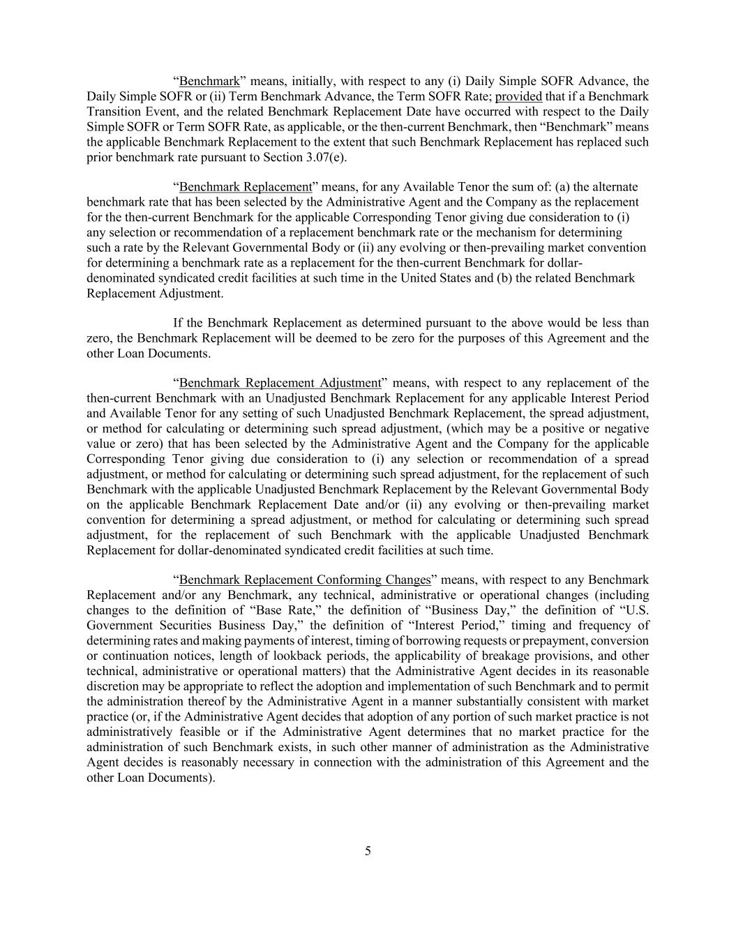 5 “Benchmark” means, initially, with respect to any (i) Daily Simple SOFR Advance, the Daily Simple SOFR or (ii) Term Benchmark Advance, the Term SOFR Rate; provided that if a Benchmark Transition Event, and the related Benchmark Replacement Date have occurred with respect to the Daily Simple SOFR or Term SOFR Rate, as applicable, or the then-current Benchmark, then “Benchmark” means the applicable Benchmark Replacement to the extent that such Benchmark Replacement has replaced such prior benchmark rate pursuant to Section 3.07(e). “Benchmark Replacement” means, for any Available Tenor the sum of: (a) the alternate benchmark rate that has been selected by the Administrative Agent and the Company as the replacement for the then-current Benchmark for the applicable Corresponding Tenor giving due consideration to (i) any selection or recommendation of a replacement benchmark rate or the mechanism for determining such a rate by the Relevant Governmental Body or (ii) any evolving or then-prevailing market convention for determining a benchmark rate as a replacement for the then-current Benchmark for dollar- denominated syndicated credit facilities at such time in the United States and (b) the related Benchmark Replacement Adjustment. If the Benchmark Replacement as determined pursuant to the above would be less than zero, the Benchmark Replacement will be deemed to be zero for the purposes of this Agreement and the other Loan Documents. “Benchmark Replacement Adjustment” means, with respect to any replacement of the then-current Benchmark with an Unadjusted Benchmark Replacement for any applicable Interest Period and Available Tenor for any setting of such Unadjusted Benchmark Replacement, the spread adjustment, or method for calculating or determining such spread adjustment, (which may be a positive or negative value or zero) that has been selected by the Administrative Agent and the Company for the applicable Corresponding Tenor giving due consideration to (i) any selection or recommendation of a spread adjustment, or method for calculating or determining such spread adjustment, for the replacement of such Benchmark with the applicable Unadjusted Benchmark Replacement by the Relevant Governmental Body on the applicable Benchmark Replacement Date and/or (ii) any evolving or then-prevailing market convention for determining a spread adjustment, or method for calculating or determining such spread adjustment, for the replacement of such Benchmark with the applicable Unadjusted Benchmark Replacement for dollar-denominated syndicated credit facilities at such time. “Benchmark Replacement Conforming Changes” means, with respect to any Benchmark Replacement and/or any Benchmark, any technical, administrative or operational changes (including changes to the definition of “Base Rate,” the definition of “Business Day,” the definition of “U.S. Government Securities Business Day,” the definition of “Interest Period,” timing and frequency of determining rates and making payments of interest, timing of borrowing requests or prepayment, conversion or continuation notices, length of lookback periods, the applicability of breakage provisions, and other technical, administrative or operational matters) that the Administrative Agent decides in its reasonable discretion may be appropriate to reflect the adoption and implementation of such Benchmark and to permit the administration thereof by the Administrative Agent in a manner substantially consistent with market practice (or, if the Administrative Agent decides that adoption of any portion of such market practice is not administratively feasible or if the Administrative Agent determines that no market practice for the administration of such Benchmark exists, in such other manner of administration as the Administrative Agent decides is reasonably necessary in connection with the administration of this Agreement and the other Loan Documents).