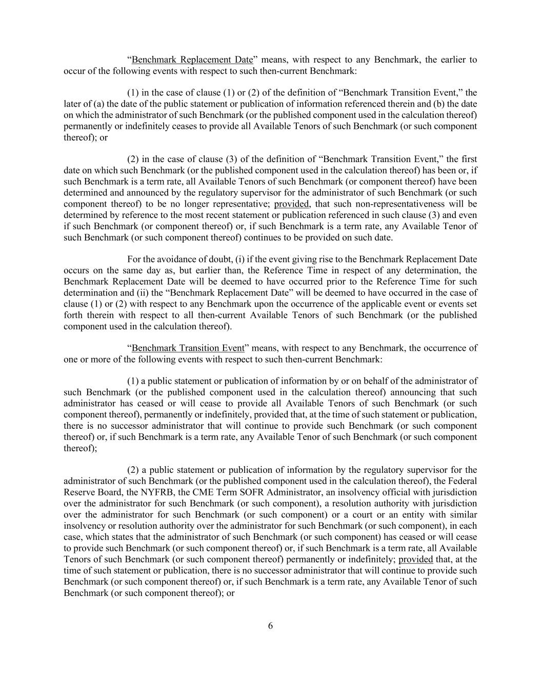 6 “Benchmark Replacement Date” means, with respect to any Benchmark, the earlier to occur of the following events with respect to such then-current Benchmark: (1) in the case of clause (1) or (2) of the definition of “Benchmark Transition Event,” the later of (a) the date of the public statement or publication of information referenced therein and (b) the date on which the administrator of such Benchmark (or the published component used in the calculation thereof) permanently or indefinitely ceases to provide all Available Tenors of such Benchmark (or such component thereof); or (2) in the case of clause (3) of the definition of “Benchmark Transition Event,” the first date on which such Benchmark (or the published component used in the calculation thereof) has been or, if such Benchmark is a term rate, all Available Tenors of such Benchmark (or component thereof) have been determined and announced by the regulatory supervisor for the administrator of such Benchmark (or such component thereof) to be no longer representative; provided, that such non-representativeness will be determined by reference to the most recent statement or publication referenced in such clause (3) and even if such Benchmark (or component thereof) or, if such Benchmark is a term rate, any Available Tenor of such Benchmark (or such component thereof) continues to be provided on such date. For the avoidance of doubt, (i) if the event giving rise to the Benchmark Replacement Date occurs on the same day as, but earlier than, the Reference Time in respect of any determination, the Benchmark Replacement Date will be deemed to have occurred prior to the Reference Time for such determination and (ii) the “Benchmark Replacement Date” will be deemed to have occurred in the case of clause (1) or (2) with respect to any Benchmark upon the occurrence of the applicable event or events set forth therein with respect to all then-current Available Tenors of such Benchmark (or the published component used in the calculation thereof). “Benchmark Transition Event” means, with respect to any Benchmark, the occurrence of one or more of the following events with respect to such then-current Benchmark: (1) a public statement or publication of information by or on behalf of the administrator of such Benchmark (or the published component used in the calculation thereof) announcing that such administrator has ceased or will cease to provide all Available Tenors of such Benchmark (or such component thereof), permanently or indefinitely, provided that, at the time of such statement or publication, there is no successor administrator that will continue to provide such Benchmark (or such component thereof) or, if such Benchmark is a term rate, any Available Tenor of such Benchmark (or such component thereof); (2) a public statement or publication of information by the regulatory supervisor for the administrator of such Benchmark (or the published component used in the calculation thereof), the Federal Reserve Board, the NYFRB, the CME Term SOFR Administrator, an insolvency official with jurisdiction over the administrator for such Benchmark (or such component), a resolution authority with jurisdiction over the administrator for such Benchmark (or such component) or a court or an entity with similar insolvency or resolution authority over the administrator for such Benchmark (or such component), in each case, which states that the administrator of such Benchmark (or such component) has ceased or will cease to provide such Benchmark (or such component thereof) or, if such Benchmark is a term rate, all Available Tenors of such Benchmark (or such component thereof) permanently or indefinitely; provided that, at the time of such statement or publication, there is no successor administrator that will continue to provide such Benchmark (or such component thereof) or, if such Benchmark is a term rate, any Available Tenor of such Benchmark (or such component thereof); or