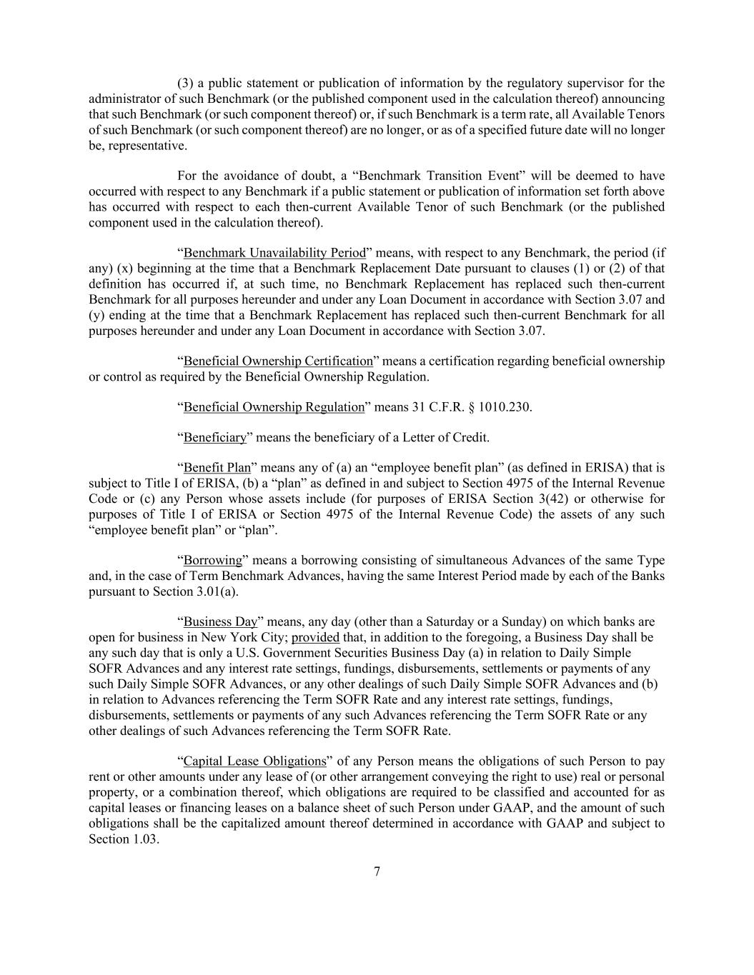 7 (3) a public statement or publication of information by the regulatory supervisor for the administrator of such Benchmark (or the published component used in the calculation thereof) announcing that such Benchmark (or such component thereof) or, if such Benchmark is a term rate, all Available Tenors of such Benchmark (or such component thereof) are no longer, or as of a specified future date will no longer be, representative. For the avoidance of doubt, a “Benchmark Transition Event” will be deemed to have occurred with respect to any Benchmark if a public statement or publication of information set forth above has occurred with respect to each then-current Available Tenor of such Benchmark (or the published component used in the calculation thereof). “Benchmark Unavailability Period” means, with respect to any Benchmark, the period (if any) (x) beginning at the time that a Benchmark Replacement Date pursuant to clauses (1) or (2) of that definition has occurred if, at such time, no Benchmark Replacement has replaced such then-current Benchmark for all purposes hereunder and under any Loan Document in accordance with Section 3.07 and (y) ending at the time that a Benchmark Replacement has replaced such then-current Benchmark for all purposes hereunder and under any Loan Document in accordance with Section 3.07. “Beneficial Ownership Certification” means a certification regarding beneficial ownership or control as required by the Beneficial Ownership Regulation. “Beneficial Ownership Regulation” means 31 C.F.R. § 1010.230. “Beneficiary” means the beneficiary of a Letter of Credit. “Benefit Plan” means any of (a) an “employee benefit plan” (as defined in ERISA) that is subject to Title I of ERISA, (b) a “plan” as defined in and subject to Section 4975 of the Internal Revenue Code or (c) any Person whose assets include (for purposes of ERISA Section 3(42) or otherwise for purposes of Title I of ERISA or Section 4975 of the Internal Revenue Code) the assets of any such “employee benefit plan” or “plan”. “Borrowing” means a borrowing consisting of simultaneous Advances of the same Type and, in the case of Term Benchmark Advances, having the same Interest Period made by each of the Banks pursuant to Section 3.01(a). “Business Day” means, any day (other than a Saturday or a Sunday) on which banks are open for business in New York City; provided that, in addition to the foregoing, a Business Day shall be any such day that is only a U.S. Government Securities Business Day (a) in relation to Daily Simple SOFR Advances and any interest rate settings, fundings, disbursements, settlements or payments of any such Daily Simple SOFR Advances, or any other dealings of such Daily Simple SOFR Advances and (b) in relation to Advances referencing the Term SOFR Rate and any interest rate settings, fundings, disbursements, settlements or payments of any such Advances referencing the Term SOFR Rate or any other dealings of such Advances referencing the Term SOFR Rate. “Capital Lease Obligations” of any Person means the obligations of such Person to pay rent or other amounts under any lease of (or other arrangement conveying the right to use) real or personal property, or a combination thereof, which obligations are required to be classified and accounted for as capital leases or financing leases on a balance sheet of such Person under GAAP, and the amount of such obligations shall be the capitalized amount thereof determined in accordance with GAAP and subject to Section 1.03.