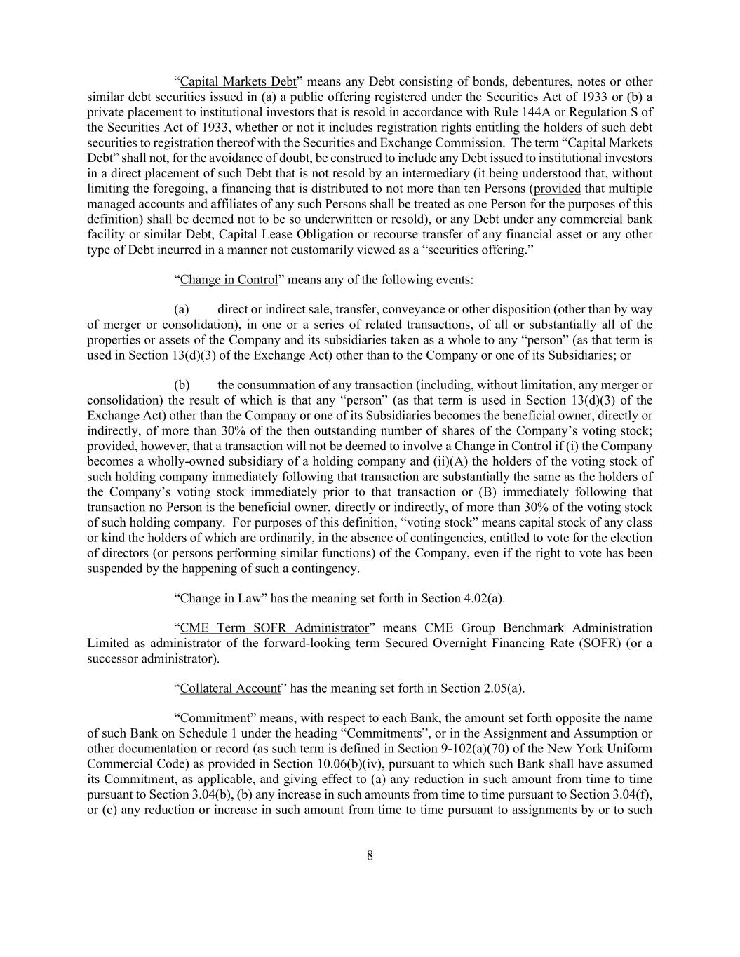 8 “Capital Markets Debt” means any Debt consisting of bonds, debentures, notes or other similar debt securities issued in (a) a public offering registered under the Securities Act of 1933 or (b) a private placement to institutional investors that is resold in accordance with Rule 144A or Regulation S of the Securities Act of 1933, whether or not it includes registration rights entitling the holders of such debt securities to registration thereof with the Securities and Exchange Commission. The term “Capital Markets Debt” shall not, for the avoidance of doubt, be construed to include any Debt issued to institutional investors in a direct placement of such Debt that is not resold by an intermediary (it being understood that, without limiting the foregoing, a financing that is distributed to not more than ten Persons (provided that multiple managed accounts and affiliates of any such Persons shall be treated as one Person for the purposes of this definition) shall be deemed not to be so underwritten or resold), or any Debt under any commercial bank facility or similar Debt, Capital Lease Obligation or recourse transfer of any financial asset or any other type of Debt incurred in a manner not customarily viewed as a “securities offering.” “Change in Control” means any of the following events: (a) direct or indirect sale, transfer, conveyance or other disposition (other than by way of merger or consolidation), in one or a series of related transactions, of all or substantially all of the properties or assets of the Company and its subsidiaries taken as a whole to any “person” (as that term is used in Section 13(d)(3) of the Exchange Act) other than to the Company or one of its Subsidiaries; or (b) the consummation of any transaction (including, without limitation, any merger or consolidation) the result of which is that any “person” (as that term is used in Section 13(d)(3) of the Exchange Act) other than the Company or one of its Subsidiaries becomes the beneficial owner, directly or indirectly, of more than 30% of the then outstanding number of shares of the Company’s voting stock; provided, however, that a transaction will not be deemed to involve a Change in Control if (i) the Company becomes a wholly-owned subsidiary of a holding company and (ii)(A) the holders of the voting stock of such holding company immediately following that transaction are substantially the same as the holders of the Company’s voting stock immediately prior to that transaction or (B) immediately following that transaction no Person is the beneficial owner, directly or indirectly, of more than 30% of the voting stock of such holding company. For purposes of this definition, “voting stock” means capital stock of any class or kind the holders of which are ordinarily, in the absence of contingencies, entitled to vote for the election of directors (or persons performing similar functions) of the Company, even if the right to vote has been suspended by the happening of such a contingency. “Change in Law” has the meaning set forth in Section 4.02(a). “CME Term SOFR Administrator” means CME Group Benchmark Administration Limited as administrator of the forward-looking term Secured Overnight Financing Rate (SOFR) (or a successor administrator). “Collateral Account” has the meaning set forth in Section 2.05(a). “Commitment” means, with respect to each Bank, the amount set forth opposite the name of such Bank on Schedule 1 under the heading “Commitments”, or in the Assignment and Assumption or other documentation or record (as such term is defined in Section 9-102(a)(70) of the New York Uniform Commercial Code) as provided in Section 10.06(b)(iv), pursuant to which such Bank shall have assumed its Commitment, as applicable, and giving effect to (a) any reduction in such amount from time to time pursuant to Section 3.04(b), (b) any increase in such amounts from time to time pursuant to Section 3.04(f), or (c) any reduction or increase in such amount from time to time pursuant to assignments by or to such
