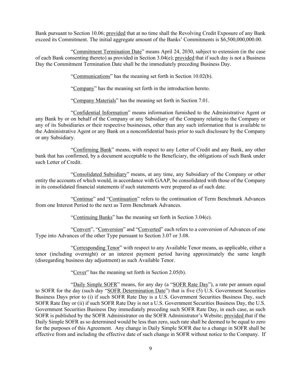 9 Bank pursuant to Section 10.06; provided that at no time shall the Revolving Credit Exposure of any Bank exceed its Commitment. The initial aggregate amount of the Banks’ Commitments is $6,500,000,000.00. “Commitment Termination Date” means April 24, 2030, subject to extension (in the case of each Bank consenting thereto) as provided in Section 3.04(e); provided that if such day is not a Business Day the Commitment Termination Date shall be the immediately preceding Business Day. “Communications” has the meaning set forth in Section 10.02(b). “Company” has the meaning set forth in the introduction hereto. “Company Materials” has the meaning set forth in Section 7.01. “Confidential Information” means information furnished to the Administrative Agent or any Bank by or on behalf of the Company or any Subsidiary of the Company relating to the Company or any of its Subsidiaries or their respective businesses, other than any such information that is available to the Administrative Agent or any Bank on a nonconfidential basis prior to such disclosure by the Company or any Subsidiary. “Confirming Bank” means, with respect to any Letter of Credit and any Bank, any other bank that has confirmed, by a document acceptable to the Beneficiary, the obligations of such Bank under such Letter of Credit. “Consolidated Subsidiary” means, at any time, any Subsidiary of the Company or other entity the accounts of which would, in accordance with GAAP, be consolidated with those of the Company in its consolidated financial statements if such statements were prepared as of such date. “Continue” and “Continuation” refers to the continuation of Term Benchmark Advances from one Interest Period to the next as Term Benchmark Advances. “Continuing Banks” has the meaning set forth in Section 3.04(e). “Convert”, “Conversion” and “Converted” each refers to a conversion of Advances of one Type into Advances of the other Type pursuant to Section 3.07 or 3.08. “Corresponding Tenor” with respect to any Available Tenor means, as applicable, either a tenor (including overnight) or an interest payment period having approximately the same length (disregarding business day adjustment) as such Available Tenor. “Cover” has the meaning set forth in Section 2.05(b). “Daily Simple SOFR” means, for any day (a “SOFR Rate Day”), a rate per annum equal to SOFR for the day (such day “SOFR Determination Date”) that is five (5) U.S. Government Securities Business Days prior to (i) if such SOFR Rate Day is a U.S. Government Securities Business Day, such SOFR Rate Day or (ii) if such SOFR Rate Day is not a U.S. Government Securities Business Day, the U.S. Government Securities Business Day immediately preceding such SOFR Rate Day, in each case, as such SOFR is published by the SOFR Administrator on the SOFR Administrator’s Website; provided that if the Daily Simple SOFR as so determined would be less than zero, such rate shall be deemed to be equal to zero for the purposes of this Agreement. Any change in Daily Simple SOFR due to a change in SOFR shall be effective from and including the effective date of such change in SOFR without notice to the Company. If