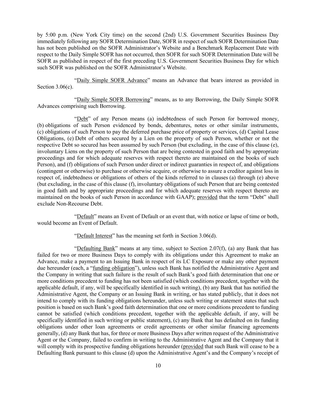 10 by 5:00 p.m. (New York City time) on the second (2nd) U.S. Government Securities Business Day immediately following any SOFR Determination Date, SOFR in respect of such SOFR Determination Date has not been published on the SOFR Administrator’s Website and a Benchmark Replacement Date with respect to the Daily Simple SOFR has not occurred, then SOFR for such SOFR Determination Date will be SOFR as published in respect of the first preceding U.S. Government Securities Business Day for which such SOFR was published on the SOFR Administrator’s Website. “Daily Simple SOFR Advance” means an Advance that bears interest as provided in Section 3.06(c). “Daily Simple SOFR Borrowing” means, as to any Borrowing, the Daily Simple SOFR Advances comprising such Borrowing. “Debt” of any Person means (a) indebtedness of such Person for borrowed money, (b) obligations of such Person evidenced by bonds, debentures, notes or other similar instruments, (c) obligations of such Person to pay the deferred purchase price of property or services, (d) Capital Lease Obligations, (e) Debt of others secured by a Lien on the property of such Person, whether or not the respective Debt so secured has been assumed by such Person (but excluding, in the case of this clause (e), involuntary Liens on the property of such Person that are being contested in good faith and by appropriate proceedings and for which adequate reserves with respect thereto are maintained on the books of such Person), and (f) obligations of such Person under direct or indirect guaranties in respect of, and obligations (contingent or otherwise) to purchase or otherwise acquire, or otherwise to assure a creditor against loss in respect of, indebtedness or obligations of others of the kinds referred to in clauses (a) through (e) above (but excluding, in the case of this clause (f), involuntary obligations of such Person that are being contested in good faith and by appropriate proceedings and for which adequate reserves with respect thereto are maintained on the books of such Person in accordance with GAAP); provided that the term “Debt” shall exclude Non-Recourse Debt. “Default” means an Event of Default or an event that, with notice or lapse of time or both, would become an Event of Default. “Default Interest” has the meaning set forth in Section 3.06(d). “Defaulting Bank” means at any time, subject to Section 2.07(f), (a) any Bank that has failed for two or more Business Days to comply with its obligations under this Agreement to make an Advance, make a payment to an Issuing Bank in respect of its LC Exposure or make any other payment due hereunder (each, a “funding obligation”), unless such Bank has notified the Administrative Agent and the Company in writing that such failure is the result of such Bank’s good faith determination that one or more conditions precedent to funding has not been satisfied (which conditions precedent, together with the applicable default, if any, will be specifically identified in such writing), (b) any Bank that has notified the Administrative Agent, the Company or an Issuing Bank in writing, or has stated publicly, that it does not intend to comply with its funding obligations hereunder, unless such writing or statement states that such position is based on such Bank’s good faith determination that one or more conditions precedent to funding cannot be satisfied (which conditions precedent, together with the applicable default, if any, will be specifically identified in such writing or public statement), (c) any Bank that has defaulted on its funding obligations under other loan agreements or credit agreements or other similar financing agreements generally, (d) any Bank that has, for three or more Business Days after written request of the Administrative Agent or the Company, failed to confirm in writing to the Administrative Agent and the Company that it will comply with its prospective funding obligations hereunder (provided that such Bank will cease to be a Defaulting Bank pursuant to this clause (d) upon the Administrative Agent’s and the Company’s receipt of
