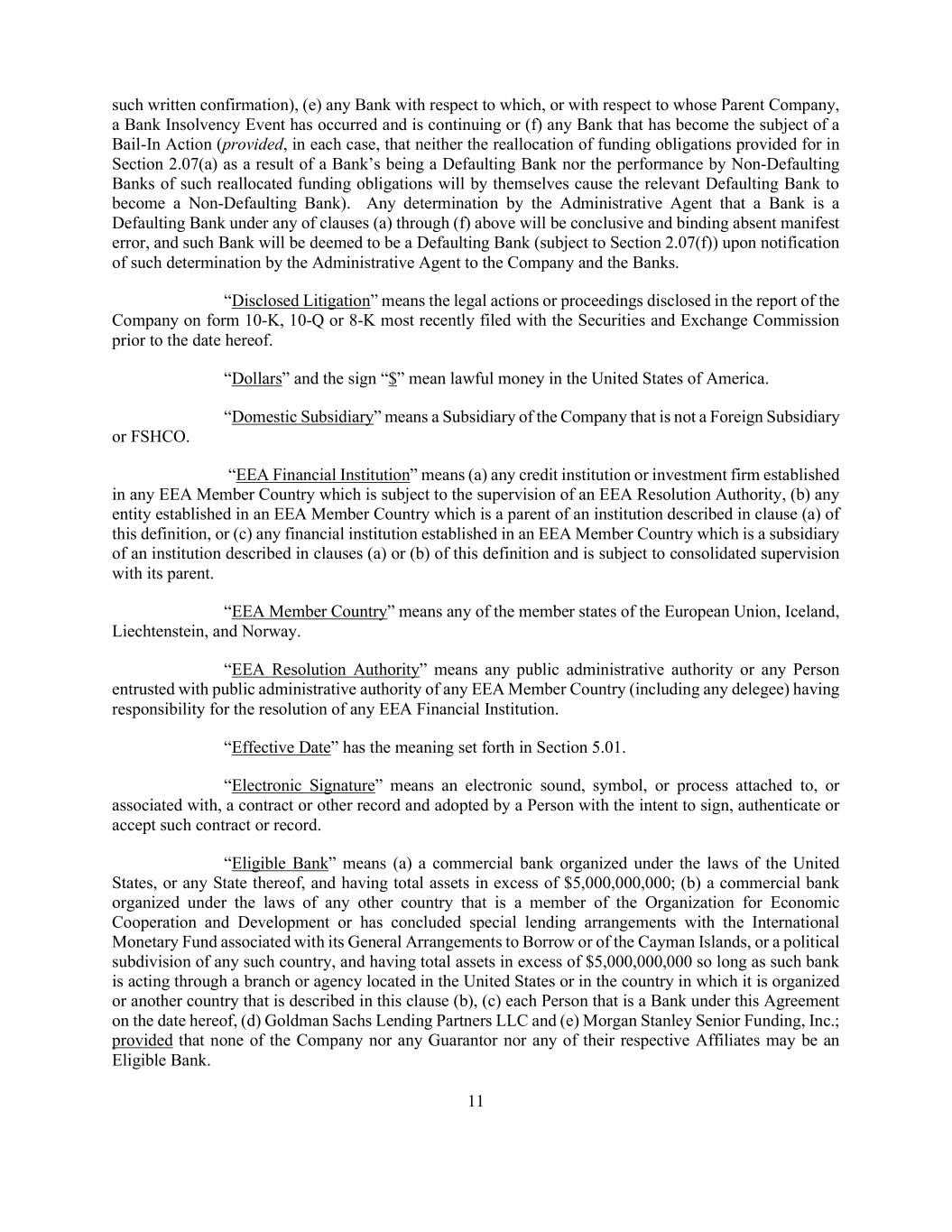 11 such written confirmation), (e) any Bank with respect to which, or with respect to whose Parent Company, a Bank Insolvency Event has occurred and is continuing or (f) any Bank that has become the subject of a Bail-In Action (provided, in each case, that neither the reallocation of funding obligations provided for in Section 2.07(a) as a result of a Bank’s being a Defaulting Bank nor the performance by Non-Defaulting Banks of such reallocated funding obligations will by themselves cause the relevant Defaulting Bank to become a Non-Defaulting Bank). Any determination by the Administrative Agent that a Bank is a Defaulting Bank under any of clauses (a) through (f) above will be conclusive and binding absent manifest error, and such Bank will be deemed to be a Defaulting Bank (subject to Section 2.07(f)) upon notification of such determination by the Administrative Agent to the Company and the Banks. “Disclosed Litigation” means the legal actions or proceedings disclosed in the report of the Company on form 10-K, 10-Q or 8-K most recently filed with the Securities and Exchange Commission prior to the date hereof. “Dollars” and the sign “$” mean lawful money in the United States of America. “Domestic Subsidiary” means a Subsidiary of the Company that is not a Foreign Subsidiary or FSHCO. “EEA Financial Institution” means (a) any credit institution or investment firm established in any EEA Member Country which is subject to the supervision of an EEA Resolution Authority, (b) any entity established in an EEA Member Country which is a parent of an institution described in clause (a) of this definition, or (c) any financial institution established in an EEA Member Country which is a subsidiary of an institution described in clauses (a) or (b) of this definition and is subject to consolidated supervision with its parent. “EEA Member Country” means any of the member states of the European Union, Iceland, Liechtenstein, and Norway. “EEA Resolution Authority” means any public administrative authority or any Person entrusted with public administrative authority of any EEA Member Country (including any delegee) having responsibility for the resolution of any EEA Financial Institution. “Effective Date” has the meaning set forth in Section 5.01. “Electronic Signature” means an electronic sound, symbol, or process attached to, or associated with, a contract or other record and adopted by a Person with the intent to sign, authenticate or accept such contract or record. “Eligible Bank” means (a) a commercial bank organized under the laws of the United States, or any State thereof, and having total assets in excess of $5,000,000,000; (b) a commercial bank organized under the laws of any other country that is a member of the Organization for Economic Cooperation and Development or has concluded special lending arrangements with the International Monetary Fund associated with its General Arrangements to Borrow or of the Cayman Islands, or a political subdivision of any such country, and having total assets in excess of $5,000,000,000 so long as such bank is acting through a branch or agency located in the United States or in the country in which it is organized or another country that is described in this clause (b), (c) each Person that is a Bank under this Agreement on the date hereof, (d) Goldman Sachs Lending Partners LLC and (e) Morgan Stanley Senior Funding, Inc.; provided that none of the Company nor any Guarantor nor any of their respective Affiliates may be an Eligible Bank.
