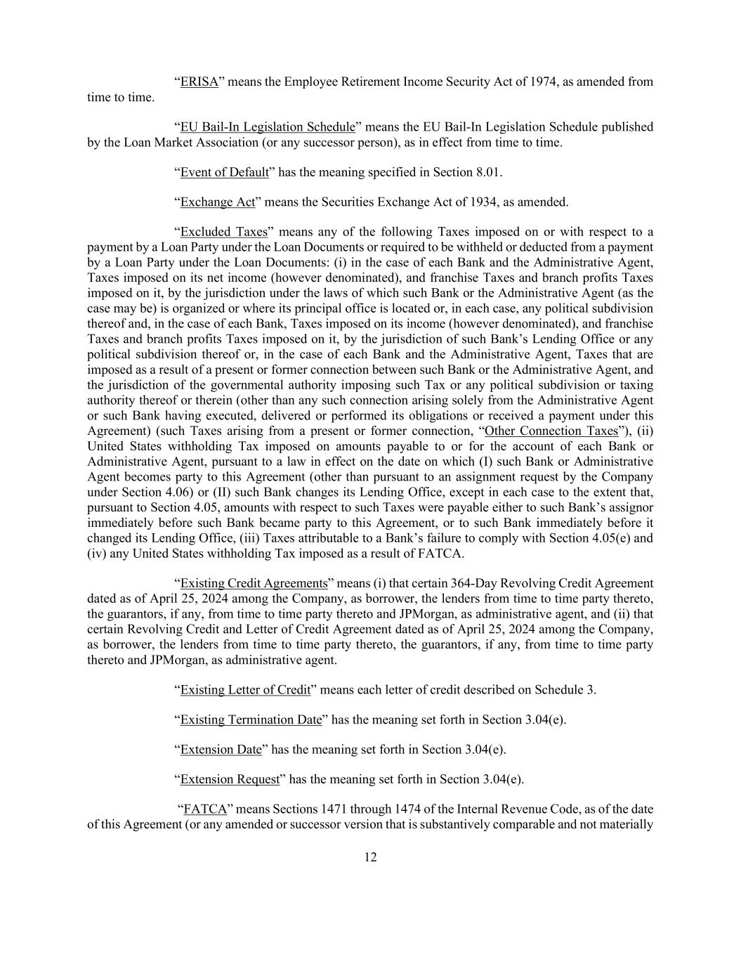 12 “ERISA” means the Employee Retirement Income Security Act of 1974, as amended from time to time. “EU Bail-In Legislation Schedule” means the EU Bail-In Legislation Schedule published by the Loan Market Association (or any successor person), as in effect from time to time. “Event of Default” has the meaning specified in Section 8.01. “Exchange Act” means the Securities Exchange Act of 1934, as amended. “Excluded Taxes” means any of the following Taxes imposed on or with respect to a payment by a Loan Party under the Loan Documents or required to be withheld or deducted from a payment by a Loan Party under the Loan Documents: (i) in the case of each Bank and the Administrative Agent, Taxes imposed on its net income (however denominated), and franchise Taxes and branch profits Taxes imposed on it, by the jurisdiction under the laws of which such Bank or the Administrative Agent (as the case may be) is organized or where its principal office is located or, in each case, any political subdivision thereof and, in the case of each Bank, Taxes imposed on its income (however denominated), and franchise Taxes and branch profits Taxes imposed on it, by the jurisdiction of such Bank’s Lending Office or any political subdivision thereof or, in the case of each Bank and the Administrative Agent, Taxes that are imposed as a result of a present or former connection between such Bank or the Administrative Agent, and the jurisdiction of the governmental authority imposing such Tax or any political subdivision or taxing authority thereof or therein (other than any such connection arising solely from the Administrative Agent or such Bank having executed, delivered or performed its obligations or received a payment under this Agreement) (such Taxes arising from a present or former connection, “Other Connection Taxes”), (ii) United States withholding Tax imposed on amounts payable to or for the account of each Bank or Administrative Agent, pursuant to a law in effect on the date on which (I) such Bank or Administrative Agent becomes party to this Agreement (other than pursuant to an assignment request by the Company under Section 4.06) or (II) such Bank changes its Lending Office, except in each case to the extent that, pursuant to Section 4.05, amounts with respect to such Taxes were payable either to such Bank’s assignor immediately before such Bank became party to this Agreement, or to such Bank immediately before it changed its Lending Office, (iii) Taxes attributable to a Bank’s failure to comply with Section 4.05(e) and (iv) any United States withholding Tax imposed as a result of FATCA. “Existing Credit Agreements” means (i) that certain 364-Day Revolving Credit Agreement dated as of April 25, 2024 among the Company, as borrower, the lenders from time to time party thereto, the guarantors, if any, from time to time party thereto and JPMorgan, as administrative agent, and (ii) that certain Revolving Credit and Letter of Credit Agreement dated as of April 25, 2024 among the Company, as borrower, the lenders from time to time party thereto, the guarantors, if any, from time to time party thereto and JPMorgan, as administrative agent. “Existing Letter of Credit” means each letter of credit described on Schedule 3. “Existing Termination Date” has the meaning set forth in Section 3.04(e). “Extension Date” has the meaning set forth in Section 3.04(e). “Extension Request” has the meaning set forth in Section 3.04(e). “FATCA” means Sections 1471 through 1474 of the Internal Revenue Code, as of the date of this Agreement (or any amended or successor version that is substantively comparable and not materially
