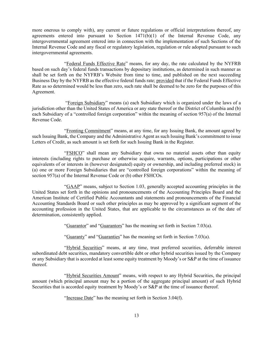 13 more onerous to comply with), any current or future regulations or official interpretations thereof, any agreements entered into pursuant to Section 1471(b)(1) of the Internal Revenue Code, any intergovernmental agreement entered into in connection with the implementation of such Sections of the Internal Revenue Code and any fiscal or regulatory legislation, regulation or rule adopted pursuant to such intergovernmental agreements. “Federal Funds Effective Rate” means, for any day, the rate calculated by the NYFRB based on such day’s federal funds transactions by depositary institutions, as determined in such manner as shall be set forth on the NYFRB’s Website from time to time, and published on the next succeeding Business Day by the NYFRB as the effective federal funds rate; provided that if the Federal Funds Effective Rate as so determined would be less than zero, such rate shall be deemed to be zero for the purposes of this Agreement. “Foreign Subsidiary” means (a) each Subsidiary which is organized under the laws of a jurisdiction other than the United States of America or any state thereof or the District of Columbia and (b) each Subsidiary of a “controlled foreign corporation” within the meaning of section 957(a) of the Internal Revenue Code. “Fronting Commitment” means, at any time, for any Issuing Bank, the amount agreed by such Issuing Bank, the Company and the Administrative Agent as such Issuing Bank’s commitment to issue Letters of Credit, as such amount is set forth for such Issuing Bank in the Register. “FSHCO” shall mean any Subsidiary that owns no material assets other than equity interests (including rights to purchase or otherwise acquire, warrants, options, participations or other equivalents of or interests in (however designated) equity or ownership, and including preferred stock) in (a) one or more Foreign Subsidiaries that are “controlled foreign corporations” within the meaning of section 957(a) of the Internal Revenue Code or (b) other FSHCOs. “GAAP” means, subject to Section 1.03, generally accepted accounting principles in the United States set forth in the opinions and pronouncements of the Accounting Principles Board and the American Institute of Certified Public Accountants and statements and pronouncements of the Financial Accounting Standards Board or such other principles as may be approved by a significant segment of the accounting profession in the United States, that are applicable to the circumstances as of the date of determination, consistently applied. “Guarantor” and “Guarantors” has the meaning set forth in Section 7.03(a). “Guaranty” and “Guaranties” has the meaning set forth in Section 7.03(a). “Hybrid Securities” means, at any time, trust preferred securities, deferrable interest subordinated debt securities, mandatory convertible debt or other hybrid securities issued by the Company or any Subsidiary that is accorded at least some equity treatment by Moody’s or S&P at the time of issuance thereof. “Hybrid Securities Amount” means, with respect to any Hybrid Securities, the principal amount (which principal amount may be a portion of the aggregate principal amount) of such Hybrid Securities that is accorded equity treatment by Moody’s or S&P at the time of issuance thereof. “Increase Date” has the meaning set forth in Section 3.04(f).