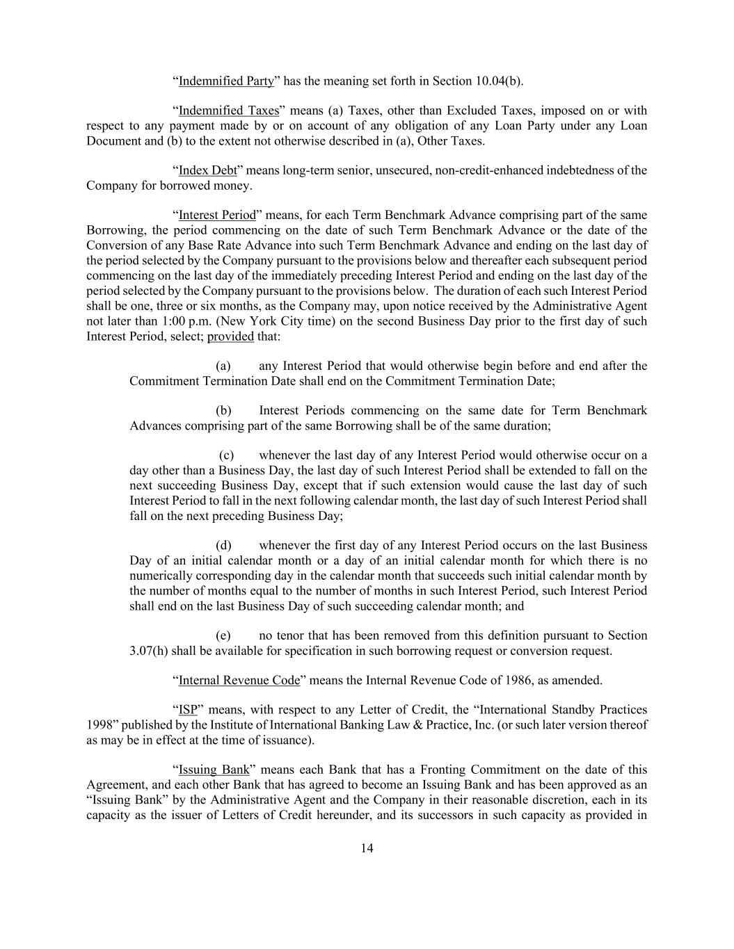 14 “Indemnified Party” has the meaning set forth in Section 10.04(b). “Indemnified Taxes” means (a) Taxes, other than Excluded Taxes, imposed on or with respect to any payment made by or on account of any obligation of any Loan Party under any Loan Document and (b) to the extent not otherwise described in (a), Other Taxes. “Index Debt” means long-term senior, unsecured, non-credit-enhanced indebtedness of the Company for borrowed money. “Interest Period” means, for each Term Benchmark Advance comprising part of the same Borrowing, the period commencing on the date of such Term Benchmark Advance or the date of the Conversion of any Base Rate Advance into such Term Benchmark Advance and ending on the last day of the period selected by the Company pursuant to the provisions below and thereafter each subsequent period commencing on the last day of the immediately preceding Interest Period and ending on the last day of the period selected by the Company pursuant to the provisions below. The duration of each such Interest Period shall be one, three or six months, as the Company may, upon notice received by the Administrative Agent not later than 1:00 p.m. (New York City time) on the second Business Day prior to the first day of such Interest Period, select; provided that: (a) any Interest Period that would otherwise begin before and end after the Commitment Termination Date shall end on the Commitment Termination Date; (b) Interest Periods commencing on the same date for Term Benchmark Advances comprising part of the same Borrowing shall be of the same duration; (c) whenever the last day of any Interest Period would otherwise occur on a day other than a Business Day, the last day of such Interest Period shall be extended to fall on the next succeeding Business Day, except that if such extension would cause the last day of such Interest Period to fall in the next following calendar month, the last day of such Interest Period shall fall on the next preceding Business Day; (d) whenever the first day of any Interest Period occurs on the last Business Day of an initial calendar month or a day of an initial calendar month for which there is no numerically corresponding day in the calendar month that succeeds such initial calendar month by the number of months equal to the number of months in such Interest Period, such Interest Period shall end on the last Business Day of such succeeding calendar month; and (e) no tenor that has been removed from this definition pursuant to Section 3.07(h) shall be available for specification in such borrowing request or conversion request. “Internal Revenue Code” means the Internal Revenue Code of 1986, as amended. “ISP” means, with respect to any Letter of Credit, the “International Standby Practices 1998” published by the Institute of International Banking Law & Practice, Inc. (or such later version thereof as may be in effect at the time of issuance). “Issuing Bank” means each Bank that has a Fronting Commitment on the date of this Agreement, and each other Bank that has agreed to become an Issuing Bank and has been approved as an “Issuing Bank” by the Administrative Agent and the Company in their reasonable discretion, each in its capacity as the issuer of Letters of Credit hereunder, and its successors in such capacity as provided in