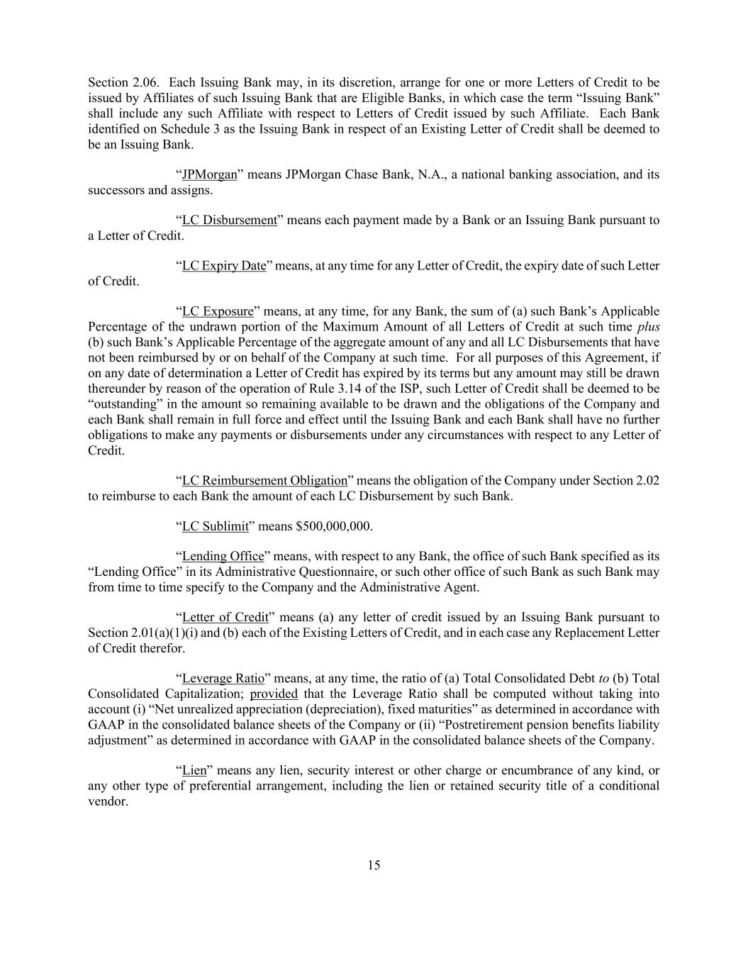 15 Section 2.06. Each Issuing Bank may, in its discretion, arrange for one or more Letters of Credit to be issued by Affiliates of such Issuing Bank that are Eligible Banks, in which case the term “Issuing Bank” shall include any such Affiliate with respect to Letters of Credit issued by such Affiliate. Each Bank identified on Schedule 3 as the Issuing Bank in respect of an Existing Letter of Credit shall be deemed to be an Issuing Bank. “JPMorgan” means JPMorgan Chase Bank, N.A., a national banking association, and its successors and assigns. “LC Disbursement” means each payment made by a Bank or an Issuing Bank pursuant to a Letter of Credit. “LC Expiry Date” means, at any time for any Letter of Credit, the expiry date of such Letter of Credit. “LC Exposure” means, at any time, for any Bank, the sum of (a) such Bank’s Applicable Percentage of the undrawn portion of the Maximum Amount of all Letters of Credit at such time plus (b) such Bank’s Applicable Percentage of the aggregate amount of any and all LC Disbursements that have not been reimbursed by or on behalf of the Company at such time. For all purposes of this Agreement, if on any date of determination a Letter of Credit has expired by its terms but any amount may still be drawn thereunder by reason of the operation of Rule 3.14 of the ISP, such Letter of Credit shall be deemed to be “outstanding” in the amount so remaining available to be drawn and the obligations of the Company and each Bank shall remain in full force and effect until the Issuing Bank and each Bank shall have no further obligations to make any payments or disbursements under any circumstances with respect to any Letter of Credit. “LC Reimbursement Obligation” means the obligation of the Company under Section 2.02 to reimburse to each Bank the amount of each LC Disbursement by such Bank. “LC Sublimit” means $500,000,000. “Lending Office” means, with respect to any Bank, the office of such Bank specified as its “Lending Office” in its Administrative Questionnaire, or such other office of such Bank as such Bank may from time to time specify to the Company and the Administrative Agent. “Letter of Credit” means (a) any letter of credit issued by an Issuing Bank pursuant to Section 2.01(a)(1)(i) and (b) each of the Existing Letters of Credit, and in each case any Replacement Letter of Credit therefor. “Leverage Ratio” means, at any time, the ratio of (a) Total Consolidated Debt to (b) Total Consolidated Capitalization; provided that the Leverage Ratio shall be computed without taking into account (i) “Net unrealized appreciation (depreciation), fixed maturities” as determined in accordance with GAAP in the consolidated balance sheets of the Company or (ii) “Postretirement pension benefits liability adjustment” as determined in accordance with GAAP in the consolidated balance sheets of the Company. “Lien” means any lien, security interest or other charge or encumbrance of any kind, or any other type of preferential arrangement, including the lien or retained security title of a conditional vendor.