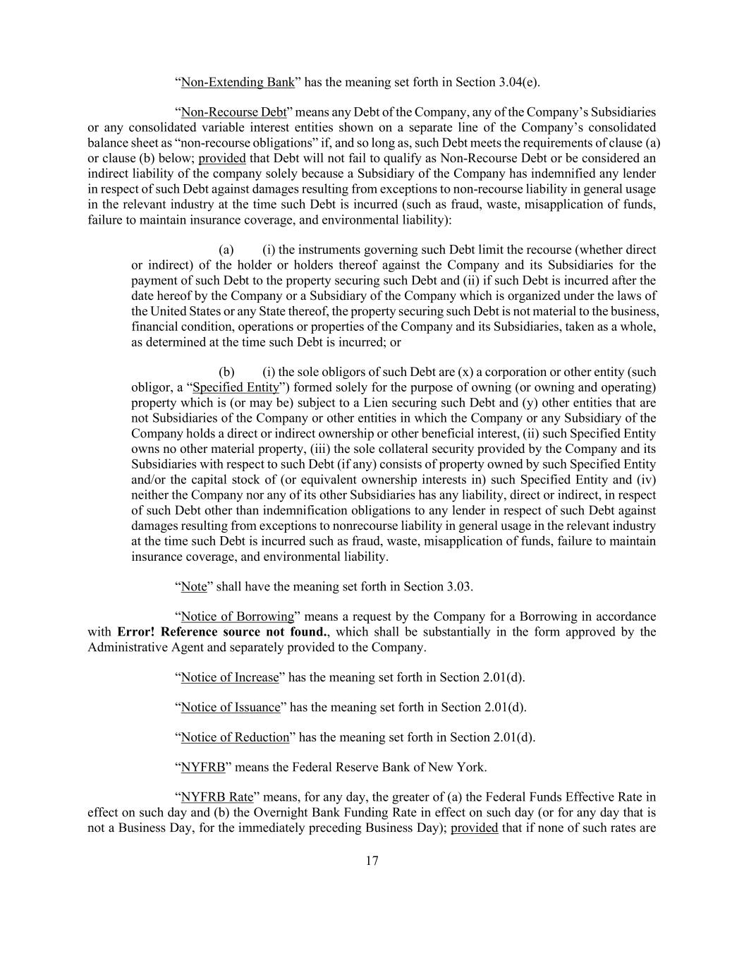 17 “Non-Extending Bank” has the meaning set forth in Section 3.04(e). “Non-Recourse Debt” means any Debt of the Company, any of the Company’s Subsidiaries or any consolidated variable interest entities shown on a separate line of the Company’s consolidated balance sheet as “non-recourse obligations” if, and so long as, such Debt meets the requirements of clause (a) or clause (b) below; provided that Debt will not fail to qualify as Non-Recourse Debt or be considered an indirect liability of the company solely because a Subsidiary of the Company has indemnified any lender in respect of such Debt against damages resulting from exceptions to non-recourse liability in general usage in the relevant industry at the time such Debt is incurred (such as fraud, waste, misapplication of funds, failure to maintain insurance coverage, and environmental liability): (a) (i) the instruments governing such Debt limit the recourse (whether direct or indirect) of the holder or holders thereof against the Company and its Subsidiaries for the payment of such Debt to the property securing such Debt and (ii) if such Debt is incurred after the date hereof by the Company or a Subsidiary of the Company which is organized under the laws of the United States or any State thereof, the property securing such Debt is not material to the business, financial condition, operations or properties of the Company and its Subsidiaries, taken as a whole, as determined at the time such Debt is incurred; or (b) (i) the sole obligors of such Debt are (x) a corporation or other entity (such obligor, a “Specified Entity”) formed solely for the purpose of owning (or owning and operating) property which is (or may be) subject to a Lien securing such Debt and (y) other entities that are not Subsidiaries of the Company or other entities in which the Company or any Subsidiary of the Company holds a direct or indirect ownership or other beneficial interest, (ii) such Specified Entity owns no other material property, (iii) the sole collateral security provided by the Company and its Subsidiaries with respect to such Debt (if any) consists of property owned by such Specified Entity and/or the capital stock of (or equivalent ownership interests in) such Specified Entity and (iv) neither the Company nor any of its other Subsidiaries has any liability, direct or indirect, in respect of such Debt other than indemnification obligations to any lender in respect of such Debt against damages resulting from exceptions to nonrecourse liability in general usage in the relevant industry at the time such Debt is incurred such as fraud, waste, misapplication of funds, failure to maintain insurance coverage, and environmental liability. “Note” shall have the meaning set forth in Section 3.03. “Notice of Borrowing” means a request by the Company for a Borrowing in accordance with Error! Reference source not found., which shall be substantially in the form approved by the Administrative Agent and separately provided to the Company. “Notice of Increase” has the meaning set forth in Section 2.01(d). “Notice of Issuance” has the meaning set forth in Section 2.01(d). “Notice of Reduction” has the meaning set forth in Section 2.01(d). “NYFRB” means the Federal Reserve Bank of New York. “NYFRB Rate” means, for any day, the greater of (a) the Federal Funds Effective Rate in effect on such day and (b) the Overnight Bank Funding Rate in effect on such day (or for any day that is not a Business Day, for the immediately preceding Business Day); provided that if none of such rates are