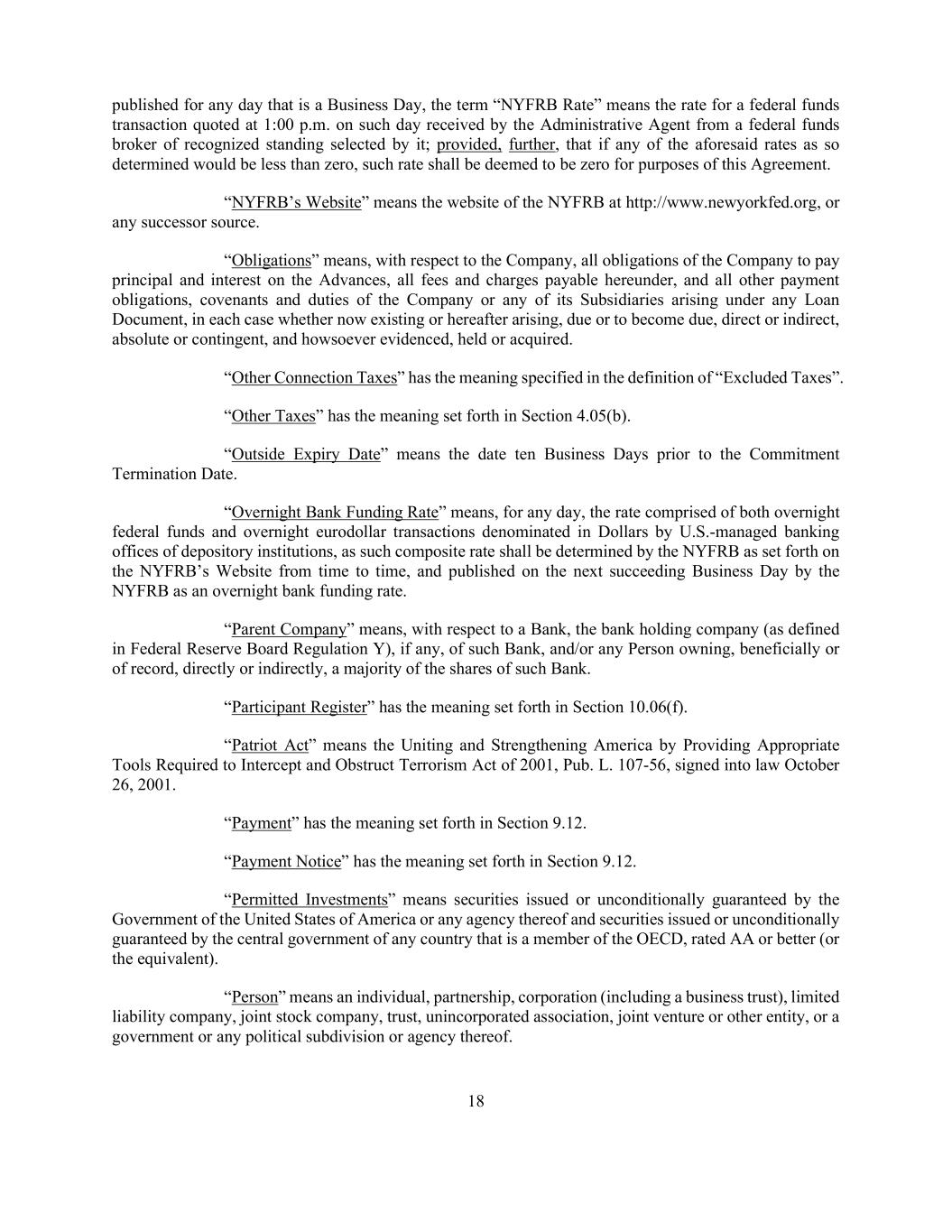 18 published for any day that is a Business Day, the term “NYFRB Rate” means the rate for a federal funds transaction quoted at 1:00 p.m. on such day received by the Administrative Agent from a federal funds broker of recognized standing selected by it; provided, further, that if any of the aforesaid rates as so determined would be less than zero, such rate shall be deemed to be zero for purposes of this Agreement. “NYFRB’s Website” means the website of the NYFRB at http://www.newyorkfed.org, or any successor source. “Obligations” means, with respect to the Company, all obligations of the Company to pay principal and interest on the Advances, all fees and charges payable hereunder, and all other payment obligations, covenants and duties of the Company or any of its Subsidiaries arising under any Loan Document, in each case whether now existing or hereafter arising, due or to become due, direct or indirect, absolute or contingent, and howsoever evidenced, held or acquired. “Other Connection Taxes” has the meaning specified in the definition of “Excluded Taxes”. “Other Taxes” has the meaning set forth in Section 4.05(b). “Outside Expiry Date” means the date ten Business Days prior to the Commitment Termination Date. “Overnight Bank Funding Rate” means, for any day, the rate comprised of both overnight federal funds and overnight eurodollar transactions denominated in Dollars by U.S.-managed banking offices of depository institutions, as such composite rate shall be determined by the NYFRB as set forth on the NYFRB’s Website from time to time, and published on the next succeeding Business Day by the NYFRB as an overnight bank funding rate. “Parent Company” means, with respect to a Bank, the bank holding company (as defined in Federal Reserve Board Regulation Y), if any, of such Bank, and/or any Person owning, beneficially or of record, directly or indirectly, a majority of the shares of such Bank. “Participant Register” has the meaning set forth in Section 10.06(f). “Patriot Act” means the Uniting and Strengthening America by Providing Appropriate Tools Required to Intercept and Obstruct Terrorism Act of 2001, Pub. L. 107-56, signed into law October 26, 2001. “Payment” has the meaning set forth in Section 9.12. “Payment Notice” has the meaning set forth in Section 9.12. “Permitted Investments” means securities issued or unconditionally guaranteed by the Government of the United States of America or any agency thereof and securities issued or unconditionally guaranteed by the central government of any country that is a member of the OECD, rated AA or better (or the equivalent). “Person” means an individual, partnership, corporation (including a business trust), limited liability company, joint stock company, trust, unincorporated association, joint venture or other entity, or a government or any political subdivision or agency thereof.