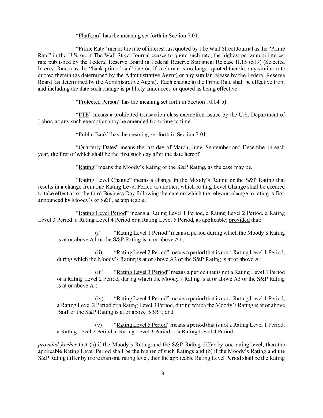 19 “Platform” has the meaning set forth in Section 7.01. “Prime Rate” means the rate of interest last quoted by The Wall Street Journal as the “Prime Rate” in the U.S. or, if The Wall Street Journal ceases to quote such rate, the highest per annum interest rate published by the Federal Reserve Board in Federal Reserve Statistical Release H.15 (519) (Selected Interest Rates) as the “bank prime loan” rate or, if such rate is no longer quoted therein, any similar rate quoted therein (as determined by the Administrative Agent) or any similar release by the Federal Reserve Board (as determined by the Administrative Agent). Each change in the Prime Rate shall be effective from and including the date such change is publicly announced or quoted as being effective. “Protected Person” has the meaning set forth in Section 10.04(b). “PTE” means a prohibited transaction class exemption issued by the U.S. Department of Labor, as any such exemption may be amended from time to time. “Public Bank” has the meaning set forth in Section 7.01. “Quarterly Dates” means the last day of March, June, September and December in each year, the first of which shall be the first such day after the date hereof. “Rating” means the Moody’s Rating or the S&P Rating, as the case may be. “Rating Level Change” means a change in the Moody’s Rating or the S&P Rating that results in a change from one Rating Level Period to another, which Rating Level Change shall be deemed to take effect as of the third Business Day following the date on which the relevant change in rating is first announced by Moody’s or S&P, as applicable. “Rating Level Period” means a Rating Level 1 Period, a Rating Level 2 Period, a Rating Level 3 Period, a Rating Level 4 Period or a Rating Level 5 Period, as applicable; provided that: (i) “Rating Level 1 Period” means a period during which the Moody’s Rating is at or above A1 or the S&P Rating is at or above A+; (ii) “Rating Level 2 Period” means a period that is not a Rating Level 1 Period, during which the Moody’s Rating is at or above A2 or the S&P Rating is at or above A; (iii) “Rating Level 3 Period” means a period that is not a Rating Level 1 Period or a Rating Level 2 Period, during which the Moody’s Rating is at or above A3 or the S&P Rating is at or above A-; (iv) “Rating Level 4 Period” means a period that is not a Rating Level 1 Period, a Rating Level 2 Period or a Rating Level 3 Period, during which the Moody’s Rating is at or above Baa1 or the S&P Rating is at or above BBB+; and (v) “Rating Level 5 Period” means a period that is not a Rating Level 1 Period, a Rating Level 2 Period, a Rating Level 3 Period or a Rating Level 4 Period; provided further that (a) if the Moody’s Rating and the S&P Rating differ by one rating level, then the applicable Rating Level Period shall be the higher of such Ratings and (b) if the Moody’s Rating and the S&P Rating differ by more than one rating level, then the applicable Rating Level Period shall be the Rating