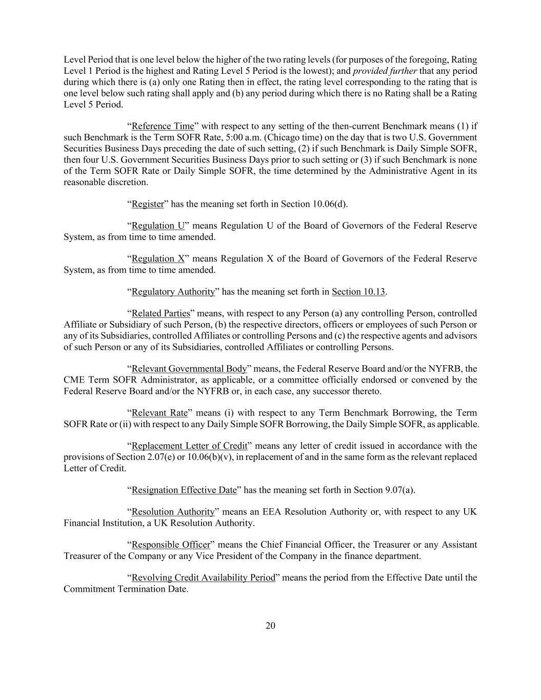 20 Level Period that is one level below the higher of the two rating levels (for purposes of the foregoing, Rating Level 1 Period is the highest and Rating Level 5 Period is the lowest); and provided further that any period during which there is (a) only one Rating then in effect, the rating level corresponding to the rating that is one level below such rating shall apply and (b) any period during which there is no Rating shall be a Rating Level 5 Period. “Reference Time” with respect to any setting of the then-current Benchmark means (1) if such Benchmark is the Term SOFR Rate, 5:00 a.m. (Chicago time) on the day that is two U.S. Government Securities Business Days preceding the date of such setting, (2) if such Benchmark is Daily Simple SOFR, then four U.S. Government Securities Business Days prior to such setting or (3) if such Benchmark is none of the Term SOFR Rate or Daily Simple SOFR, the time determined by the Administrative Agent in its reasonable discretion. “Register” has the meaning set forth in Section 10.06(d). “Regulation U” means Regulation U of the Board of Governors of the Federal Reserve System, as from time to time amended. “Regulation X” means Regulation X of the Board of Governors of the Federal Reserve System, as from time to time amended. “Regulatory Authority” has the meaning set forth in Section 10.13. “Related Parties” means, with respect to any Person (a) any controlling Person, controlled Affiliate or Subsidiary of such Person, (b) the respective directors, officers or employees of such Person or any of its Subsidiaries, controlled Affiliates or controlling Persons and (c) the respective agents and advisors of such Person or any of its Subsidiaries, controlled Affiliates or controlling Persons. “Relevant Governmental Body” means, the Federal Reserve Board and/or the NYFRB, the CME Term SOFR Administrator, as applicable, or a committee officially endorsed or convened by the Federal Reserve Board and/or the NYFRB or, in each case, any successor thereto. “Relevant Rate” means (i) with respect to any Term Benchmark Borrowing, the Term SOFR Rate or (ii) with respect to any Daily Simple SOFR Borrowing, the Daily Simple SOFR, as applicable. “Replacement Letter of Credit” means any letter of credit issued in accordance with the provisions of Section 2.07(e) or 10.06(b)(v), in replacement of and in the same form as the relevant replaced Letter of Credit. “Resignation Effective Date” has the meaning set forth in Section 9.07(a). “Resolution Authority” means an EEA Resolution Authority or, with respect to any UK Financial Institution, a UK Resolution Authority. “Responsible Officer” means the Chief Financial Officer, the Treasurer or any Assistant Treasurer of the Company or any Vice President of the Company in the finance department. “Revolving Credit Availability Period” means the period from the Effective Date until the Commitment Termination Date.