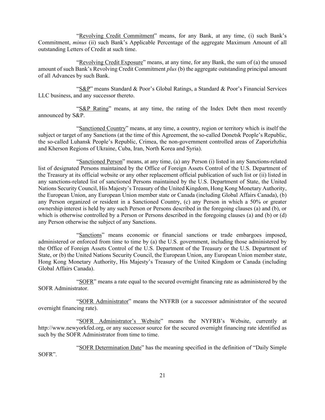 21 “Revolving Credit Commitment” means, for any Bank, at any time, (i) such Bank’s Commitment, minus (ii) such Bank’s Applicable Percentage of the aggregate Maximum Amount of all outstanding Letters of Credit at such time. “Revolving Credit Exposure” means, at any time, for any Bank, the sum of (a) the unused amount of such Bank’s Revolving Credit Commitment plus (b) the aggregate outstanding principal amount of all Advances by such Bank. “S&P” means Standard & Poor’s Global Ratings, a Standard & Poor’s Financial Services LLC business, and any successor thereto. “S&P Rating” means, at any time, the rating of the Index Debt then most recently announced by S&P. “Sanctioned Country” means, at any time, a country, region or territory which is itself the subject or target of any Sanctions (at the time of this Agreement, the so-called Donetsk People’s Republic, the so-called Luhansk People’s Republic, Crimea, the non-government controlled areas of Zaporizhzhia and Kherson Regions of Ukraine, Cuba, Iran, North Korea and Syria). “Sanctioned Person” means, at any time, (a) any Person (i) listed in any Sanctions-related list of designated Persons maintained by the Office of Foreign Assets Control of the U.S. Department of the Treasury at its official website or any other replacement official publication of such list or (ii) listed in any sanctions-related list of sanctioned Persons maintained by the U.S. Department of State, the United Nations Security Council, His Majesty’s Treasury of the United Kingdom, Hong Kong Monetary Authority, the European Union, any European Union member state or Canada (including Global Affairs Canada), (b) any Person organized or resident in a Sanctioned Country, (c) any Person in which a 50% or greater ownership interest is held by any such Person or Persons described in the foregoing clauses (a) and (b), or which is otherwise controlled by a Person or Persons described in the foregoing clauses (a) and (b) or (d) any Person otherwise the subject of any Sanctions. “Sanctions” means economic or financial sanctions or trade embargoes imposed, administered or enforced from time to time by (a) the U.S. government, including those administered by the Office of Foreign Assets Control of the U.S. Department of the Treasury or the U.S. Department of State, or (b) the United Nations Security Council, the European Union, any European Union member state, Hong Kong Monetary Authority, His Majesty’s Treasury of the United Kingdom or Canada (including Global Affairs Canada). “SOFR” means a rate equal to the secured overnight financing rate as administered by the SOFR Administrator. “SOFR Administrator” means the NYFRB (or a successor administrator of the secured overnight financing rate). “SOFR Administrator’s Website” means the NYFRB’s Website, currently at http://www.newyorkfed.org, or any successor source for the secured overnight financing rate identified as such by the SOFR Administrator from time to time. “SOFR Determination Date” has the meaning specified in the definition of “Daily Simple SOFR”.