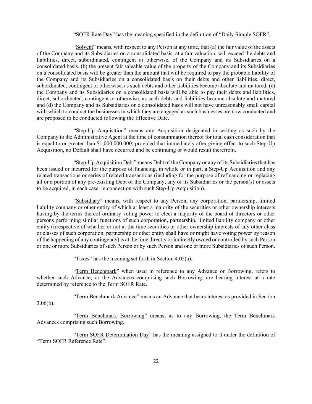 22 “SOFR Rate Day” has the meaning specified in the definition of “Daily Simple SOFR”. “Solvent” means, with respect to any Person at any time, that (a) the fair value of the assets of the Company and its Subsidiaries on a consolidated basis, at a fair valuation, will exceed the debts and liabilities, direct, subordinated, contingent or otherwise, of the Company and its Subsidiaries on a consolidated basis, (b) the present fair saleable value of the property of the Company and its Subsidiaries on a consolidated basis will be greater than the amount that will be required to pay the probable liability of the Company and its Subsidiaries on a consolidated basis on their debts and other liabilities, direct, subordinated, contingent or otherwise, as such debts and other liabilities become absolute and matured, (c) the Company and its Subsidiaries on a consolidated basis will be able to pay their debts and liabilities, direct, subordinated, contingent or otherwise, as such debts and liabilities become absolute and matured and (d) the Company and its Subsidiaries on a consolidated basis will not have unreasonably small capital with which to conduct the businesses in which they are engaged as such businesses are now conducted and are proposed to be conducted following the Effective Date. “Step-Up Acquisition” means any Acquisition designated in writing as such by the Company to the Administrative Agent at the time of consummation thereof for total cash consideration that is equal to or greater than $1,000,000,000; provided that immediately after giving effect to such Step-Up Acquisition, no Default shall have occurred and be continuing or would result therefrom. “Step-Up Acquisition Debt” means Debt of the Company or any of its Subsidiaries that has been issued or incurred for the purpose of financing, in whole or in part, a Step-Up Acquisition and any related transactions or series of related transactions (including for the purpose of refinancing or replacing all or a portion of any pre-existing Debt of the Company, any of its Subsidiaries or the person(s) or assets to be acquired, in each case, in connection with such Step-Up Acquisition). “Subsidiary” means, with respect to any Person, any corporation, partnership, limited liability company or other entity of which at least a majority of the securities or other ownership interests having by the terms thereof ordinary voting power to elect a majority of the board of directors or other persons performing similar functions of such corporation, partnership, limited liability company or other entity (irrespective of whether or not at the time securities or other ownership interests of any other class or classes of such corporation, partnership or other entity shall have or might have voting power by reason of the happening of any contingency) is at the time directly or indirectly owned or controlled by such Person or one or more Subsidiaries of such Person or by such Person and one or more Subsidiaries of such Person. “Taxes” has the meaning set forth in Section 4.05(a). “Term Benchmark” when used in reference to any Advance or Borrowing, refers to whether such Advance, or the Advances comprising such Borrowing, are bearing interest at a rate determined by reference to the Term SOFR Rate. “Term Benchmark Advance” means an Advance that bears interest as provided in Section 3.06(b). “Term Benchmark Borrowing” means, as to any Borrowing, the Term Benchmark Advances comprising such Borrowing. “Term SOFR Determination Day” has the meaning assigned to it under the definition of “Term SOFR Reference Rate”.
