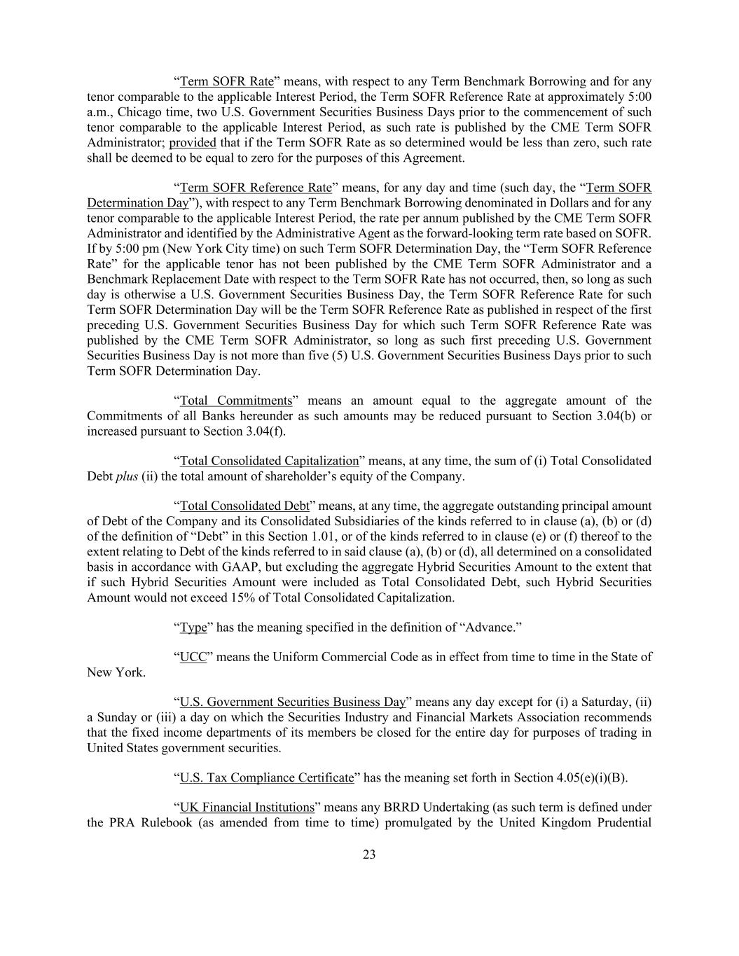 23 “Term SOFR Rate” means, with respect to any Term Benchmark Borrowing and for any tenor comparable to the applicable Interest Period, the Term SOFR Reference Rate at approximately 5:00 a.m., Chicago time, two U.S. Government Securities Business Days prior to the commencement of such tenor comparable to the applicable Interest Period, as such rate is published by the CME Term SOFR Administrator; provided that if the Term SOFR Rate as so determined would be less than zero, such rate shall be deemed to be equal to zero for the purposes of this Agreement. “Term SOFR Reference Rate” means, for any day and time (such day, the “Term SOFR Determination Day”), with respect to any Term Benchmark Borrowing denominated in Dollars and for any tenor comparable to the applicable Interest Period, the rate per annum published by the CME Term SOFR Administrator and identified by the Administrative Agent as the forward-looking term rate based on SOFR. If by 5:00 pm (New York City time) on such Term SOFR Determination Day, the “Term SOFR Reference Rate” for the applicable tenor has not been published by the CME Term SOFR Administrator and a Benchmark Replacement Date with respect to the Term SOFR Rate has not occurred, then, so long as such day is otherwise a U.S. Government Securities Business Day, the Term SOFR Reference Rate for such Term SOFR Determination Day will be the Term SOFR Reference Rate as published in respect of the first preceding U.S. Government Securities Business Day for which such Term SOFR Reference Rate was published by the CME Term SOFR Administrator, so long as such first preceding U.S. Government Securities Business Day is not more than five (5) U.S. Government Securities Business Days prior to such Term SOFR Determination Day. “Total Commitments” means an amount equal to the aggregate amount of the Commitments of all Banks hereunder as such amounts may be reduced pursuant to Section 3.04(b) or increased pursuant to Section 3.04(f). “Total Consolidated Capitalization” means, at any time, the sum of (i) Total Consolidated Debt plus (ii) the total amount of shareholder’s equity of the Company. “Total Consolidated Debt” means, at any time, the aggregate outstanding principal amount of Debt of the Company and its Consolidated Subsidiaries of the kinds referred to in clause (a), (b) or (d) of the definition of “Debt” in this Section 1.01, or of the kinds referred to in clause (e) or (f) thereof to the extent relating to Debt of the kinds referred to in said clause (a), (b) or (d), all determined on a consolidated basis in accordance with GAAP, but excluding the aggregate Hybrid Securities Amount to the extent that if such Hybrid Securities Amount were included as Total Consolidated Debt, such Hybrid Securities Amount would not exceed 15% of Total Consolidated Capitalization. “Type” has the meaning specified in the definition of “Advance.” “UCC” means the Uniform Commercial Code as in effect from time to time in the State of New York. “U.S. Government Securities Business Day” means any day except for (i) a Saturday, (ii) a Sunday or (iii) a day on which the Securities Industry and Financial Markets Association recommends that the fixed income departments of its members be closed for the entire day for purposes of trading in United States government securities. “U.S. Tax Compliance Certificate” has the meaning set forth in Section 4.05(e)(i)(B). “UK Financial Institutions” means any BRRD Undertaking (as such term is defined under the PRA Rulebook (as amended from time to time) promulgated by the United Kingdom Prudential