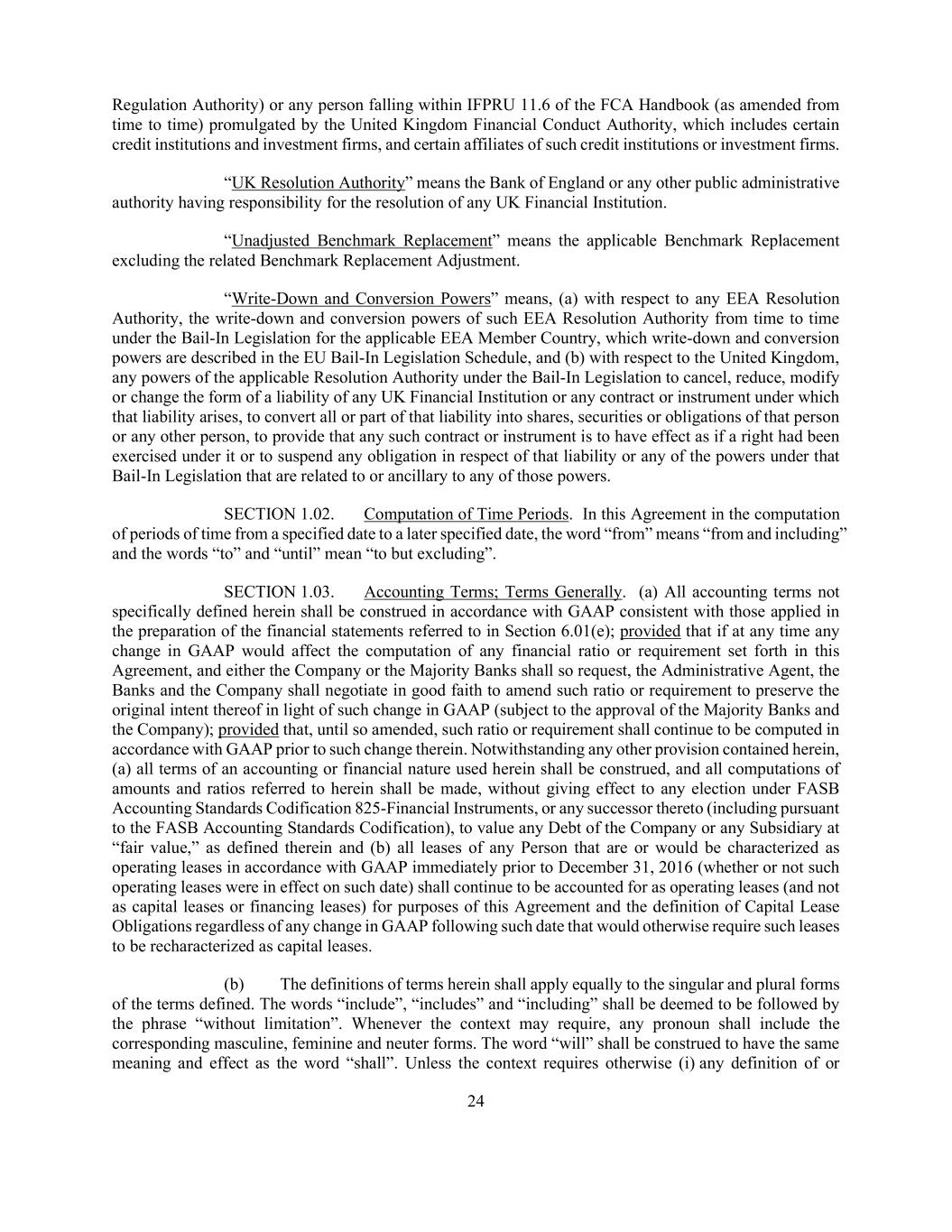 24 Regulation Authority) or any person falling within IFPRU 11.6 of the FCA Handbook (as amended from time to time) promulgated by the United Kingdom Financial Conduct Authority, which includes certain credit institutions and investment firms, and certain affiliates of such credit institutions or investment firms. “UK Resolution Authority” means the Bank of England or any other public administrative authority having responsibility for the resolution of any UK Financial Institution. “Unadjusted Benchmark Replacement” means the applicable Benchmark Replacement excluding the related Benchmark Replacement Adjustment. “Write-Down and Conversion Powers” means, (a) with respect to any EEA Resolution Authority, the write-down and conversion powers of such EEA Resolution Authority from time to time under the Bail-In Legislation for the applicable EEA Member Country, which write-down and conversion powers are described in the EU Bail-In Legislation Schedule, and (b) with respect to the United Kingdom, any powers of the applicable Resolution Authority under the Bail-In Legislation to cancel, reduce, modify or change the form of a liability of any UK Financial Institution or any contract or instrument under which that liability arises, to convert all or part of that liability into shares, securities or obligations of that person or any other person, to provide that any such contract or instrument is to have effect as if a right had been exercised under it or to suspend any obligation in respect of that liability or any of the powers under that Bail-In Legislation that are related to or ancillary to any of those powers. SECTION 1.02. Computation of Time Periods. In this Agreement in the computation of periods of time from a specified date to a later specified date, the word “from” means “from and including” and the words “to” and “until” mean “to but excluding”. SECTION 1.03. Accounting Terms; Terms Generally. (a) All accounting terms not specifically defined herein shall be construed in accordance with GAAP consistent with those applied in the preparation of the financial statements referred to in Section 6.01(e); provided that if at any time any change in GAAP would affect the computation of any financial ratio or requirement set forth in this Agreement, and either the Company or the Majority Banks shall so request, the Administrative Agent, the Banks and the Company shall negotiate in good faith to amend such ratio or requirement to preserve the original intent thereof in light of such change in GAAP (subject to the approval of the Majority Banks and the Company); provided that, until so amended, such ratio or requirement shall continue to be computed in accordance with GAAP prior to such change therein. Notwithstanding any other provision contained herein, (a) all terms of an accounting or financial nature used herein shall be construed, and all computations of amounts and ratios referred to herein shall be made, without giving effect to any election under FASB Accounting Standards Codification 825-Financial Instruments, or any successor thereto (including pursuant to the FASB Accounting Standards Codification), to value any Debt of the Company or any Subsidiary at “fair value,” as defined therein and (b) all leases of any Person that are or would be characterized as operating leases in accordance with GAAP immediately prior to December 31, 2016 (whether or not such operating leases were in effect on such date) shall continue to be accounted for as operating leases (and not as capital leases or financing leases) for purposes of this Agreement and the definition of Capital Lease Obligations regardless of any change in GAAP following such date that would otherwise require such leases to be recharacterized as capital leases. (b) The definitions of terms herein shall apply equally to the singular and plural forms of the terms defined. The words “include”, “includes” and “including” shall be deemed to be followed by the phrase “without limitation”. Whenever the context may require, any pronoun shall include the corresponding masculine, feminine and neuter forms. The word “will” shall be construed to have the same meaning and effect as the word “shall”. Unless the context requires otherwise (i) any definition of or