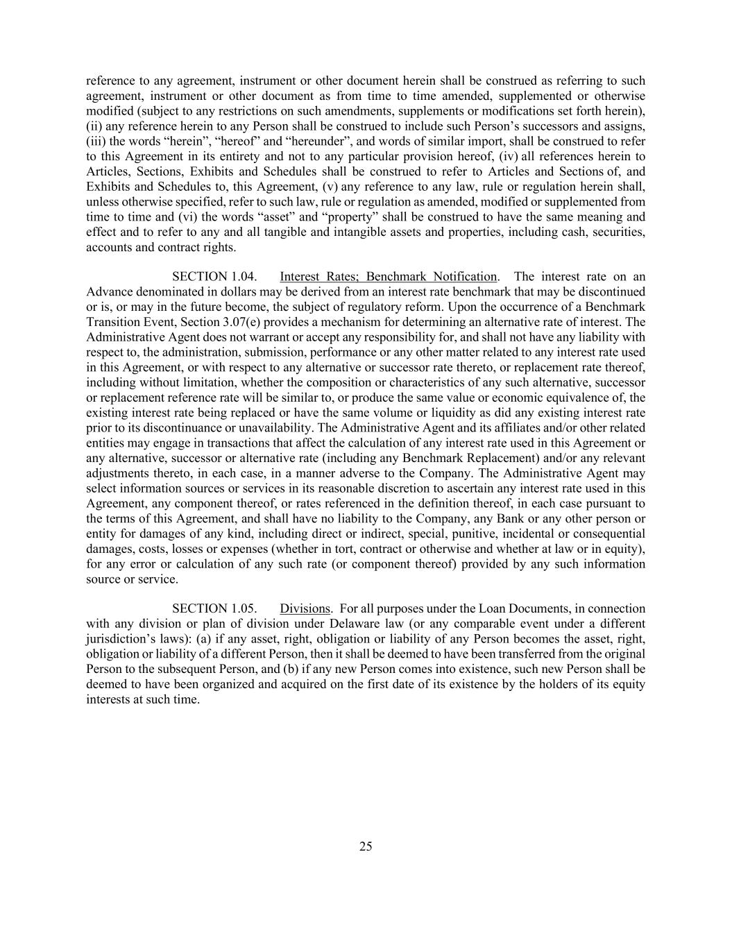 25 reference to any agreement, instrument or other document herein shall be construed as referring to such agreement, instrument or other document as from time to time amended, supplemented or otherwise modified (subject to any restrictions on such amendments, supplements or modifications set forth herein), (ii) any reference herein to any Person shall be construed to include such Person’s successors and assigns, (iii) the words “herein”, “hereof” and “hereunder”, and words of similar import, shall be construed to refer to this Agreement in its entirety and not to any particular provision hereof, (iv) all references herein to Articles, Sections, Exhibits and Schedules shall be construed to refer to Articles and Sections of, and Exhibits and Schedules to, this Agreement, (v) any reference to any law, rule or regulation herein shall, unless otherwise specified, refer to such law, rule or regulation as amended, modified or supplemented from time to time and (vi) the words “asset” and “property” shall be construed to have the same meaning and effect and to refer to any and all tangible and intangible assets and properties, including cash, securities, accounts and contract rights. SECTION 1.04. Interest Rates; Benchmark Notification. The interest rate on an Advance denominated in dollars may be derived from an interest rate benchmark that may be discontinued or is, or may in the future become, the subject of regulatory reform. Upon the occurrence of a Benchmark Transition Event, Section 3.07(e) provides a mechanism for determining an alternative rate of interest. The Administrative Agent does not warrant or accept any responsibility for, and shall not have any liability with respect to, the administration, submission, performance or any other matter related to any interest rate used in this Agreement, or with respect to any alternative or successor rate thereto, or replacement rate thereof, including without limitation, whether the composition or characteristics of any such alternative, successor or replacement reference rate will be similar to, or produce the same value or economic equivalence of, the existing interest rate being replaced or have the same volume or liquidity as did any existing interest rate prior to its discontinuance or unavailability. The Administrative Agent and its affiliates and/or other related entities may engage in transactions that affect the calculation of any interest rate used in this Agreement or any alternative, successor or alternative rate (including any Benchmark Replacement) and/or any relevant adjustments thereto, in each case, in a manner adverse to the Company. The Administrative Agent may select information sources or services in its reasonable discretion to ascertain any interest rate used in this Agreement, any component thereof, or rates referenced in the definition thereof, in each case pursuant to the terms of this Agreement, and shall have no liability to the Company, any Bank or any other person or entity for damages of any kind, including direct or indirect, special, punitive, incidental or consequential damages, costs, losses or expenses (whether in tort, contract or otherwise and whether at law or in equity), for any error or calculation of any such rate (or component thereof) provided by any such information source or service. SECTION 1.05. Divisions. For all purposes under the Loan Documents, in connection with any division or plan of division under Delaware law (or any comparable event under a different jurisdiction’s laws): (a) if any asset, right, obligation or liability of any Person becomes the asset, right, obligation or liability of a different Person, then it shall be deemed to have been transferred from the original Person to the subsequent Person, and (b) if any new Person comes into existence, such new Person shall be deemed to have been organized and acquired on the first date of its existence by the holders of its equity interests at such time.
