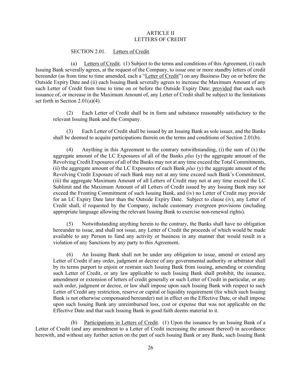 26 ARTICLE II LETTERS OF CREDIT SECTION 2.01. Letters of Credit. (a) Letters of Credit. (1) Subject to the terms and conditions of this Agreement, (i) each Issuing Bank severally agrees, at the request of the Company, to issue one or more standby letters of credit hereunder (as from time to time amended, each a “Letter of Credit”) on any Business Day on or before the Outside Expiry Date and (ii) each Issuing Bank severally agrees to increase the Maximum Amount of any such Letter of Credit from time to time on or before the Outside Expiry Date; provided that each such issuance of, or increase in the Maximum Amount of, any Letter of Credit shall be subject to the limitations set forth in Section 2.01(a)(4). (2) Each Letter of Credit shall be in form and substance reasonably satisfactory to the relevant Issuing Bank and the Company. (3) Each Letter of Credit shall be issued by an Issuing Bank as sole issuer, and the Banks shall be deemed to acquire participations therein on the terms and conditions of Section 2.01(b). (4) Anything in this Agreement to the contrary notwithstanding, (i) the sum of (x) the aggregate amount of the LC Exposures of all of the Banks plus (y) the aggregate amount of the Revolving Credit Exposures of all of the Banks may not at any time exceed the Total Commitments, (ii) the aggregate amount of the LC Exposures of each Bank plus (y) the aggregate amount of the Revolving Credit Exposure of such Bank may not at any time exceed such Bank’s Commitment, (iii) the aggregate Maximum Amount of all Letters of Credit may not at any time exceed the LC Sublimit and the Maximum Amount of all Letters of Credit issued by any Issuing Bank may not exceed the Fronting Commitment of such Issuing Bank, and (iv) no Letter of Credit may provide for an LC Expiry Date later than the Outside Expiry Date. Subject to clause (iv), any Letter of Credit shall, if requested by the Company, include customary evergreen provisions (including appropriate language allowing the relevant Issuing Bank to exercise non-renewal rights). (5) Notwithstanding anything herein to the contrary, the Banks shall have no obligation hereunder to issue, and shall not issue, any Letter of Credit the proceeds of which would be made available to any Person to fund any activity or business in any manner that would result in a violation of any Sanctions by any party to this Agreement. (6) An Issuing Bank shall not be under any obligation to issue, amend or extend any Letter of Credit if any order, judgment or decree of any governmental authority or arbitrator shall by its terms purport to enjoin or restrain such Issuing Bank from issuing, amending or extending such Letter of Credit, or any law applicable to such Issuing Bank shall prohibit, the issuance, amendment or extension of letters of credit generally or such Letter of Credit in particular, or any such order, judgment or decree, or law shall impose upon such Issuing Bank with respect to such Letter of Credit any restriction, reserve or capital or liquidity requirement (for which such Issuing Bank is not otherwise compensated hereunder) not in effect on the Effective Date, or shall impose upon such Issuing Bank any unreimbursed loss, cost or expense that was not applicable on the Effective Date and that such Issuing Bank in good faith deems material to it. (b) Participations in Letters of Credit. (1) Upon the issuance by an Issuing Bank of a Letter of Credit (and any amendment to a Letter of Credit increasing the amount thereof) in accordance herewith, and without any further action on the part of such Issuing Bank or any Bank, such Issuing Bank