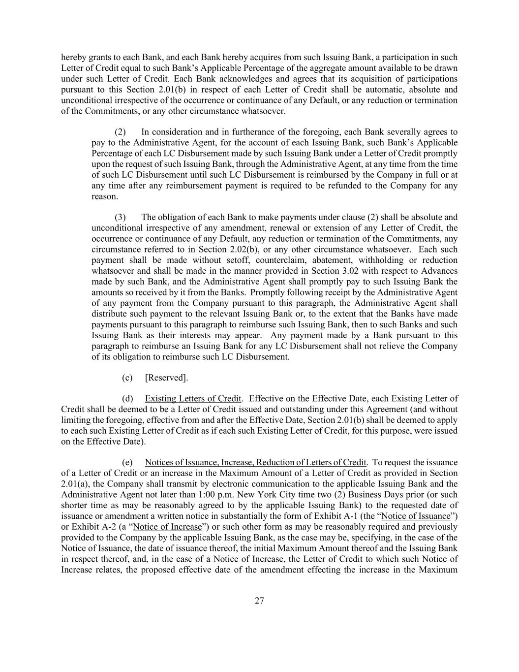 27 hereby grants to each Bank, and each Bank hereby acquires from such Issuing Bank, a participation in such Letter of Credit equal to such Bank’s Applicable Percentage of the aggregate amount available to be drawn under such Letter of Credit. Each Bank acknowledges and agrees that its acquisition of participations pursuant to this Section 2.01(b) in respect of each Letter of Credit shall be automatic, absolute and unconditional irrespective of the occurrence or continuance of any Default, or any reduction or termination of the Commitments, or any other circumstance whatsoever. (2) In consideration and in furtherance of the foregoing, each Bank severally agrees to pay to the Administrative Agent, for the account of each Issuing Bank, such Bank’s Applicable Percentage of each LC Disbursement made by such Issuing Bank under a Letter of Credit promptly upon the request of such Issuing Bank, through the Administrative Agent, at any time from the time of such LC Disbursement until such LC Disbursement is reimbursed by the Company in full or at any time after any reimbursement payment is required to be refunded to the Company for any reason. (3) The obligation of each Bank to make payments under clause (2) shall be absolute and unconditional irrespective of any amendment, renewal or extension of any Letter of Credit, the occurrence or continuance of any Default, any reduction or termination of the Commitments, any circumstance referred to in Section 2.02(b), or any other circumstance whatsoever. Each such payment shall be made without setoff, counterclaim, abatement, withholding or reduction whatsoever and shall be made in the manner provided in Section 3.02 with respect to Advances made by such Bank, and the Administrative Agent shall promptly pay to such Issuing Bank the amounts so received by it from the Banks. Promptly following receipt by the Administrative Agent of any payment from the Company pursuant to this paragraph, the Administrative Agent shall distribute such payment to the relevant Issuing Bank or, to the extent that the Banks have made payments pursuant to this paragraph to reimburse such Issuing Bank, then to such Banks and such Issuing Bank as their interests may appear. Any payment made by a Bank pursuant to this paragraph to reimburse an Issuing Bank for any LC Disbursement shall not relieve the Company of its obligation to reimburse such LC Disbursement. (c) [Reserved]. (d) Existing Letters of Credit. Effective on the Effective Date, each Existing Letter of Credit shall be deemed to be a Letter of Credit issued and outstanding under this Agreement (and without limiting the foregoing, effective from and after the Effective Date, Section 2.01(b) shall be deemed to apply to each such Existing Letter of Credit as if each such Existing Letter of Credit, for this purpose, were issued on the Effective Date). (e) Notices of Issuance, Increase, Reduction of Letters of Credit. To request the issuance of a Letter of Credit or an increase in the Maximum Amount of a Letter of Credit as provided in Section 2.01(a), the Company shall transmit by electronic communication to the applicable Issuing Bank and the Administrative Agent not later than 1:00 p.m. New York City time two (2) Business Days prior (or such shorter time as may be reasonably agreed to by the applicable Issuing Bank) to the requested date of issuance or amendment a written notice in substantially the form of Exhibit A-1 (the “Notice of Issuance”) or Exhibit A-2 (a “Notice of Increase”) or such other form as may be reasonably required and previously provided to the Company by the applicable Issuing Bank, as the case may be, specifying, in the case of the Notice of Issuance, the date of issuance thereof, the initial Maximum Amount thereof and the Issuing Bank in respect thereof, and, in the case of a Notice of Increase, the Letter of Credit to which such Notice of Increase relates, the proposed effective date of the amendment effecting the increase in the Maximum